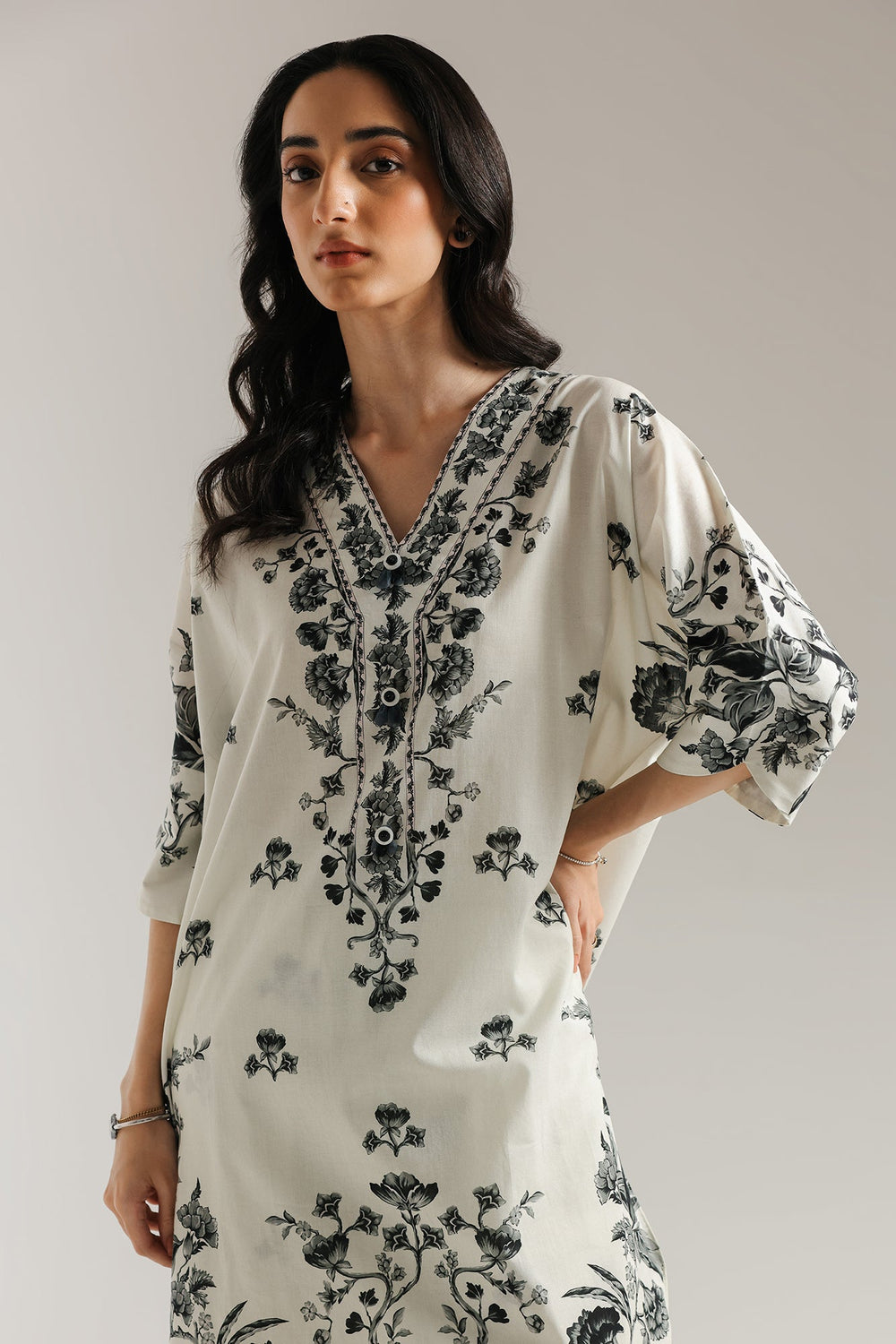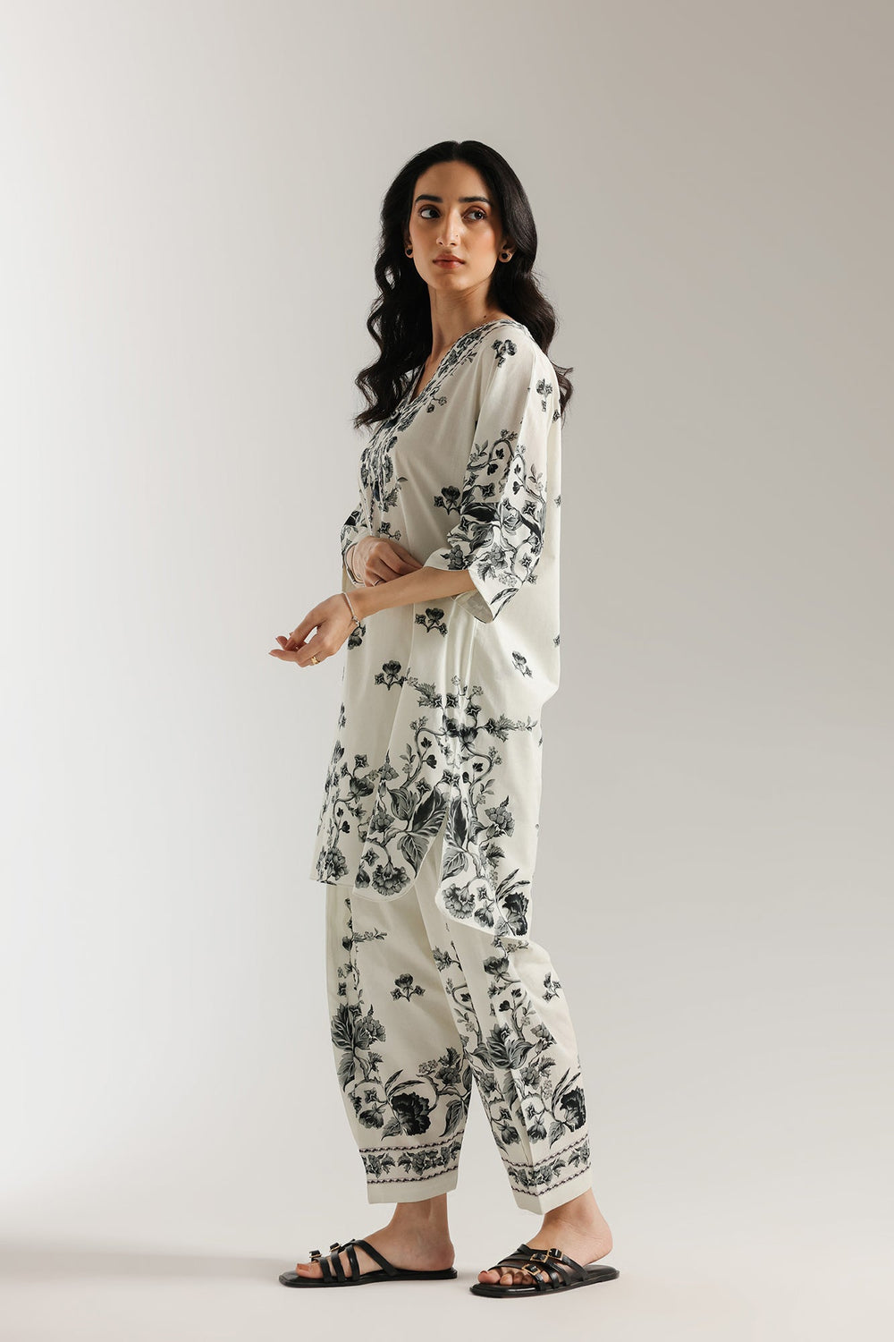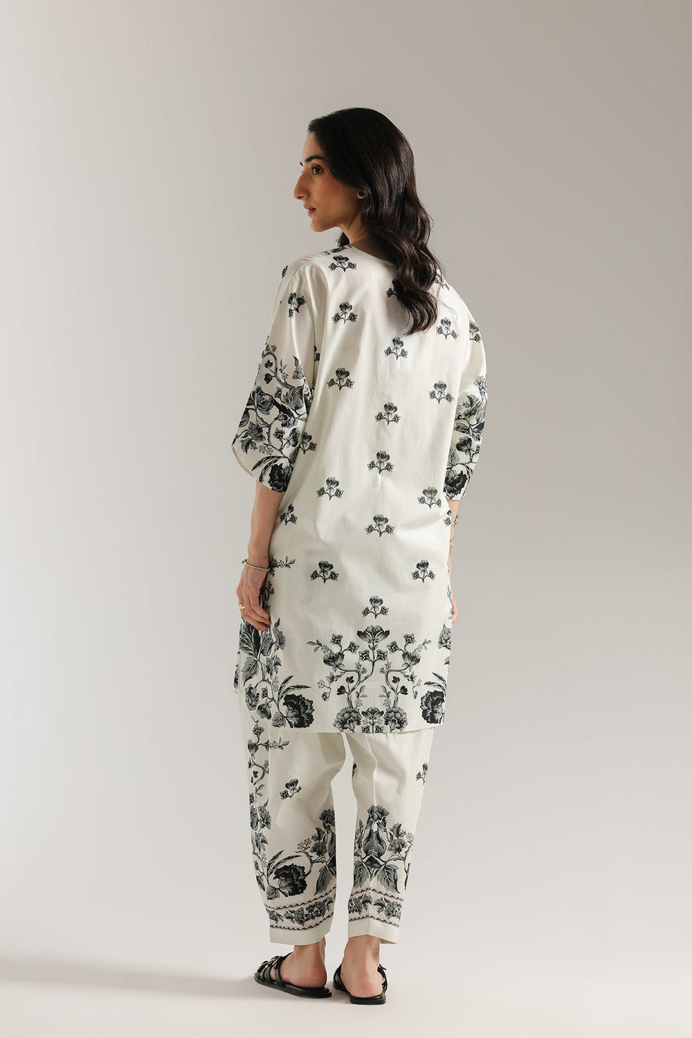 A study in classic sophistication, this printed suit is a testament to timeless elegance in a striking black-and-white palette. The off-white shirt is adorned with a captivating floral print that cascades gracefully down the length, while a beautifully designed placket highlights the V-neckline. The wide, three-quarter sleeves and A-line hem are finished with a coordinating black pattern, and the ensemble is completed by shalwar with a matching hem design, creating a look of effortless chic.