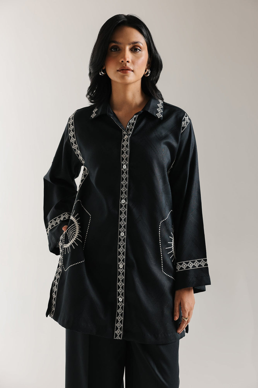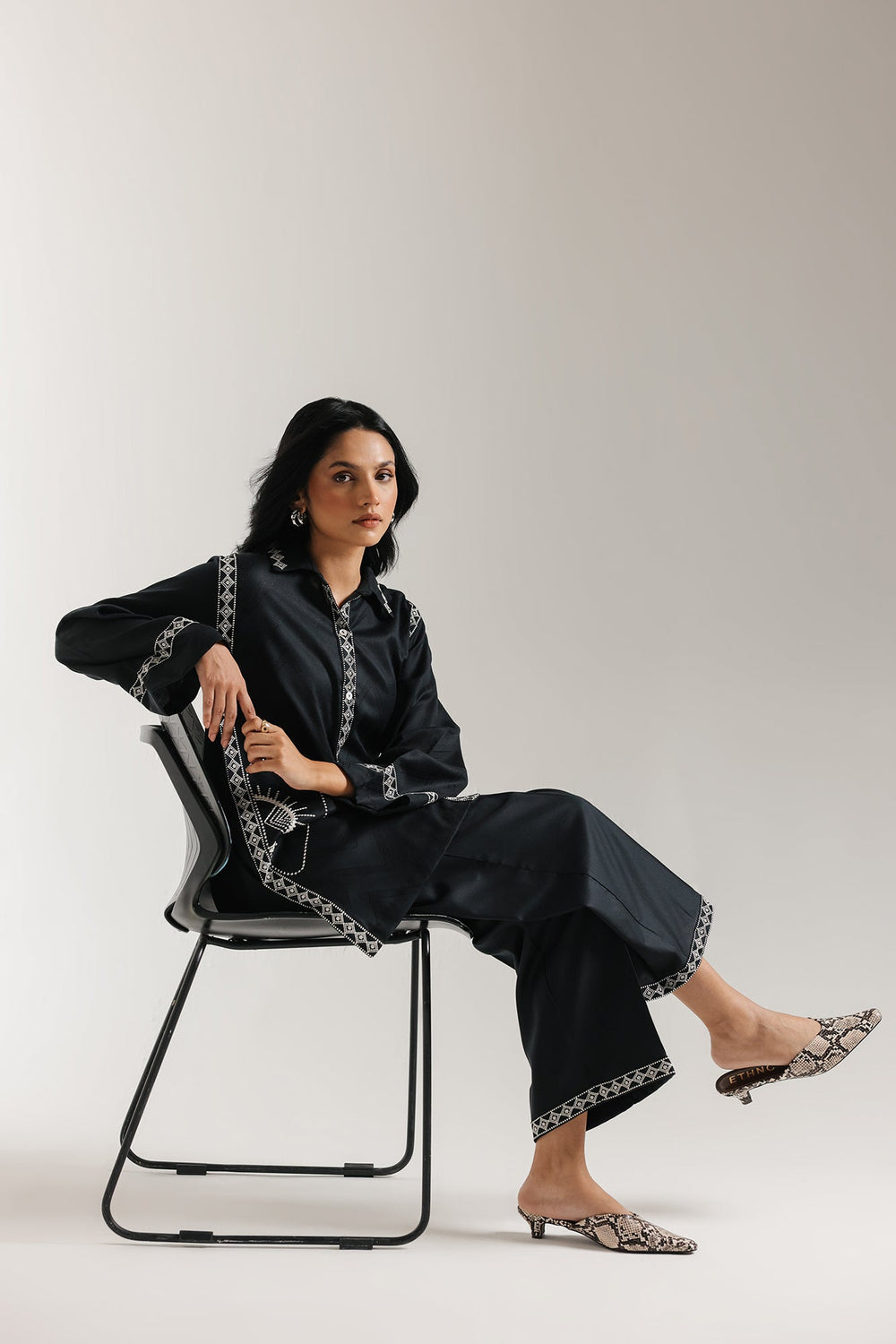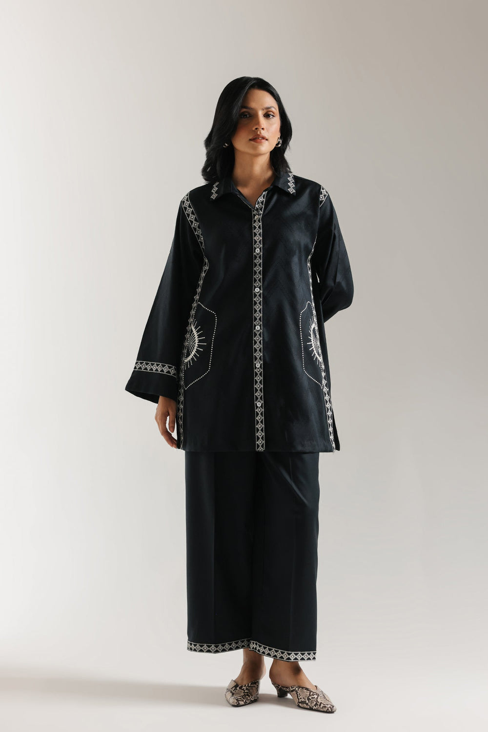 Project effortless modernity with this sharp, monochrome embroidered set. This sleek ensemble features a short-length shirt and matching straight trousers, both crafted in a rich solid black fabric. The shirt is elegantly detailed with striking white thread embroidery that traces bold geometric and abstract sun motifs on the side panels and along the front placket. It features a smart shirt collar and a subtle tonal texture. The coordinating trousers feature the same graphic white embroidery along the hem, ensuring a cohesive and sophisticated look that is both traditional and contemporary.