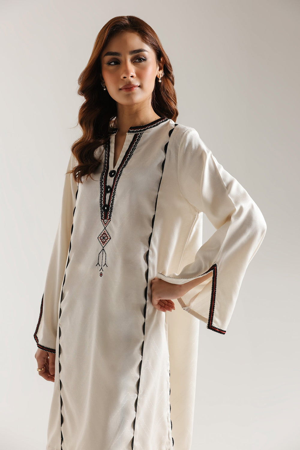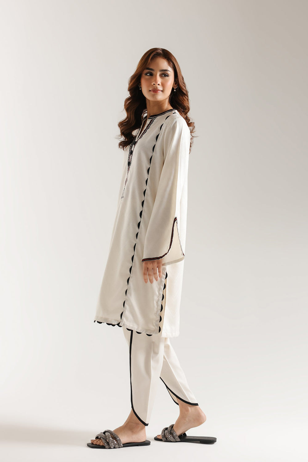 Elevate your wardrobe with this sophisticated embroidered suit, expertly crafted for timeless elegance. The white kurta features intricate black embroidery detailing that commands attention, while the V-neckline adds a refined touch. Bell sleeves provide a graceful silhouette with contemporary flair. Paired with a flattering tulip shalwar that creates a polished, structured look, this ensemble strikes the perfect balance between traditional craftsmanship and modern styling. Ideal for formal occasions, celebrations, or elevated everyday wear.