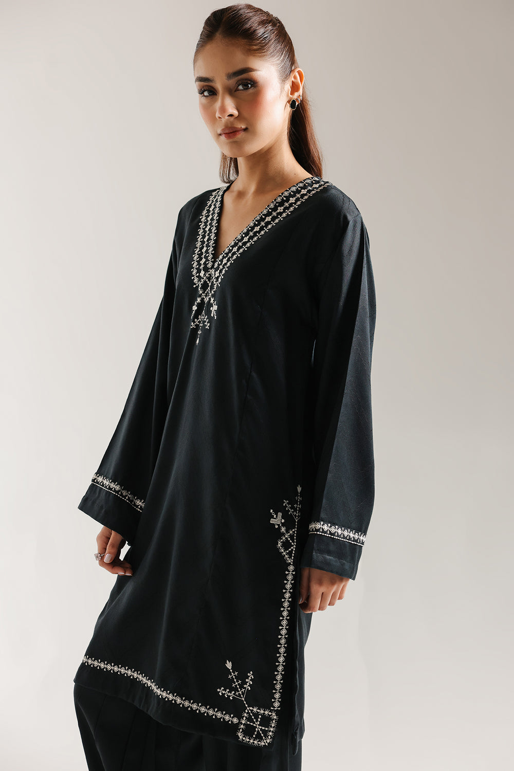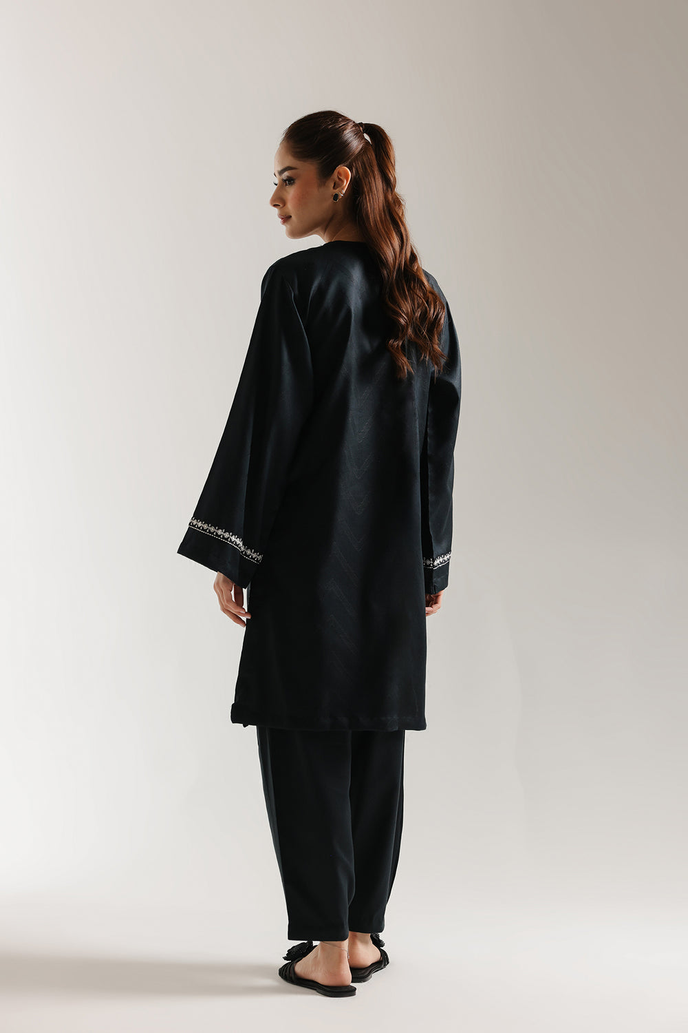 Step into sophisticated contrast with this striking black embroidered suit. The graceful, straight-cut kurta is crafted from a deep black fabric, providing a dramatic backdrop for the exquisite white thread embroidery. The intricate geometric and stylized floral patterns are concentrated around the V neckline, front hem and flared sleeves. The ensemble is completed by coordinating slouchy pleated trousers in the same deep black color. This suit offers a powerful, elegant, and perfectly coordinated elegant look.