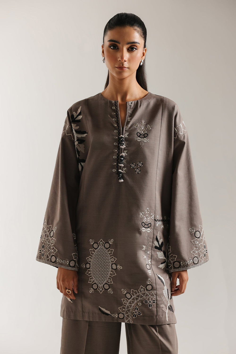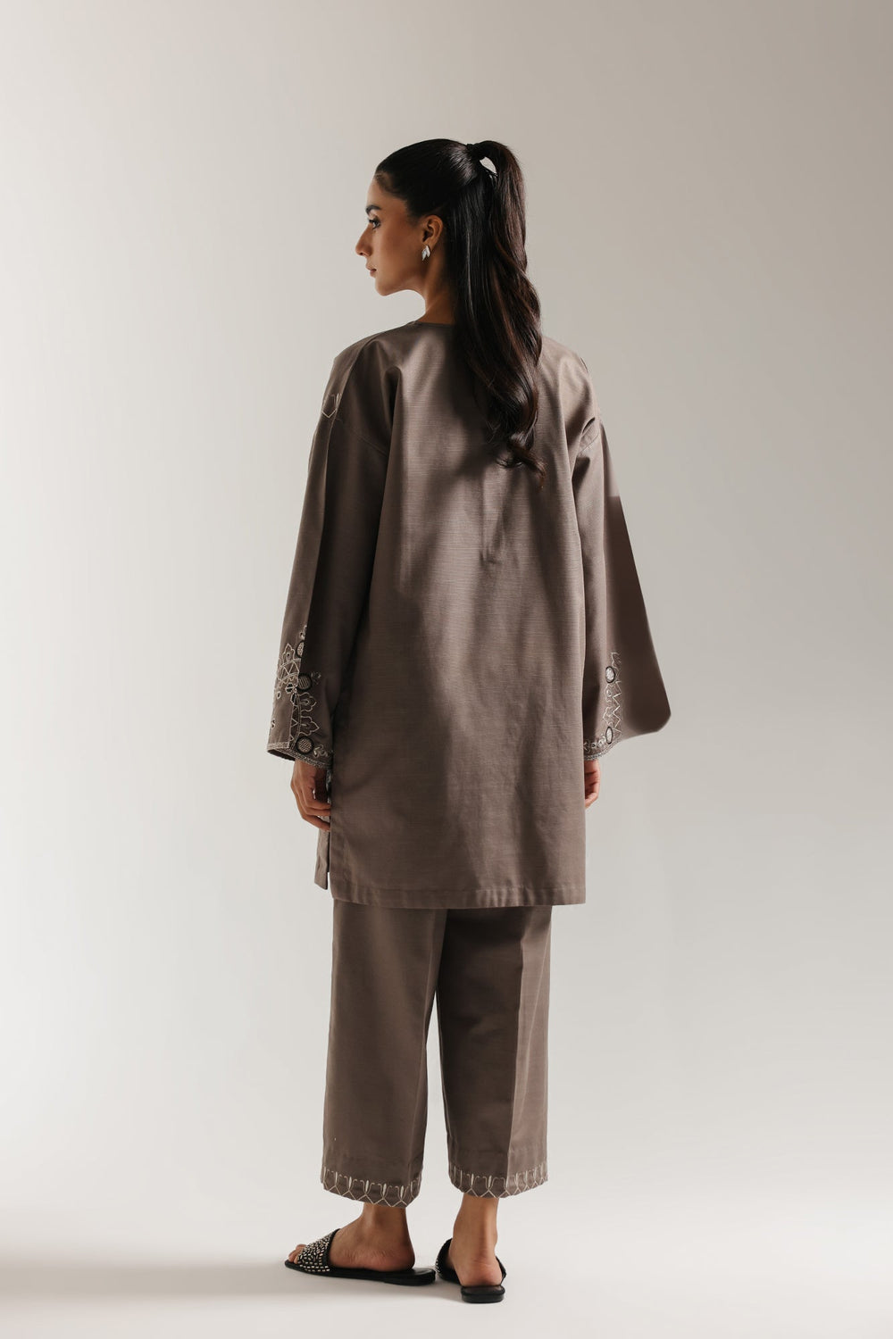Embrace an effortlessly polished and modern look with this distinct embroidered suit. This sophisticated ensemble features a kurti and matching culotte trouser, both crafted in a sleek solid khaaki fabric. The shirt is beautifully detailed with tonal thread embroidery in ivory and light gray, forming stylized floral and geometric motifs across the yoke, sides, and sleeves. It features a modern slit-neckline with a split and an accented front featuring small button-like details. The coordinating trouser is finished with a delicate embroidered border along the hem. This monochromatic suit offers a refined blend of comfort and textural artistry.