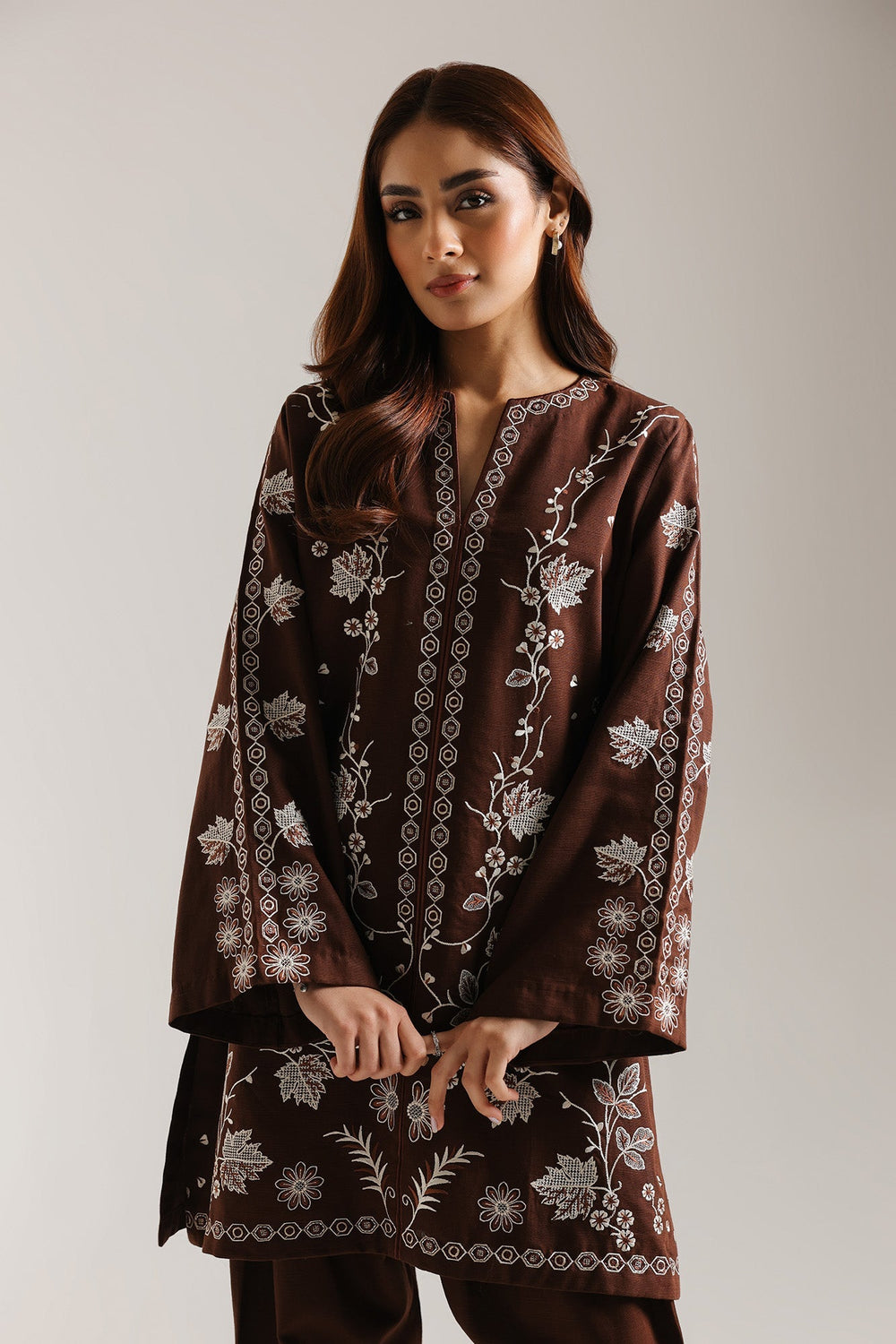 This exquisite brown ensemble showcases masterful embroidery craftsmanship. The short, straight-cut kurta features an intricate all-over floral weave in white shade, elevated by meticulous thread work in brown that traces elegant botanical motifs across the front panel and sleeves. Paired with a coordinating brown tulip silhouette shalwar adorned with delicate embroidery at bottom opening, this ensemble delivers a cohesive, luxuriously textured traditional silhouette that balances ornamental detail with refined simplicity.