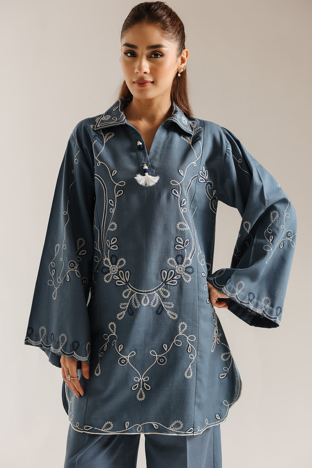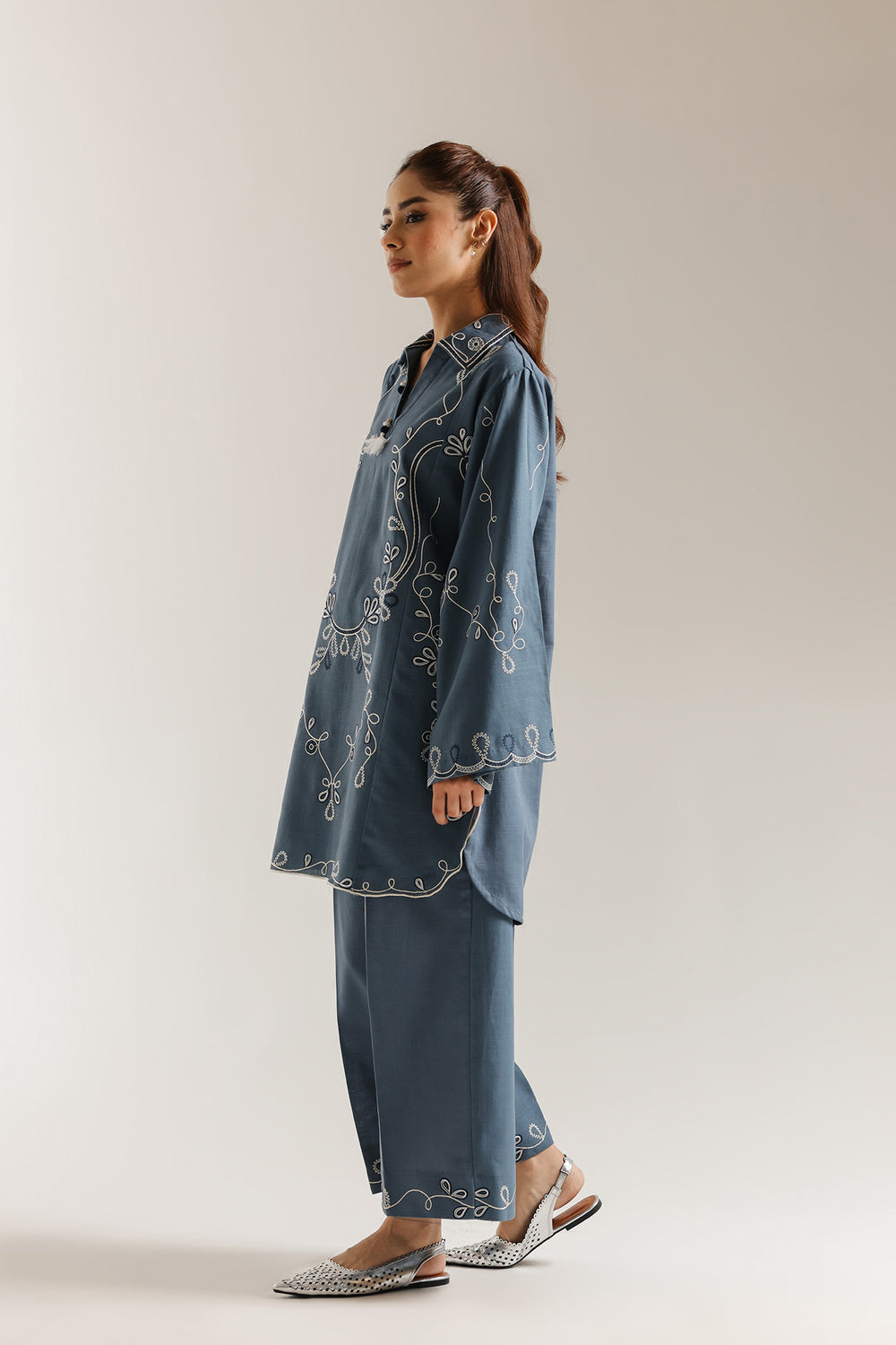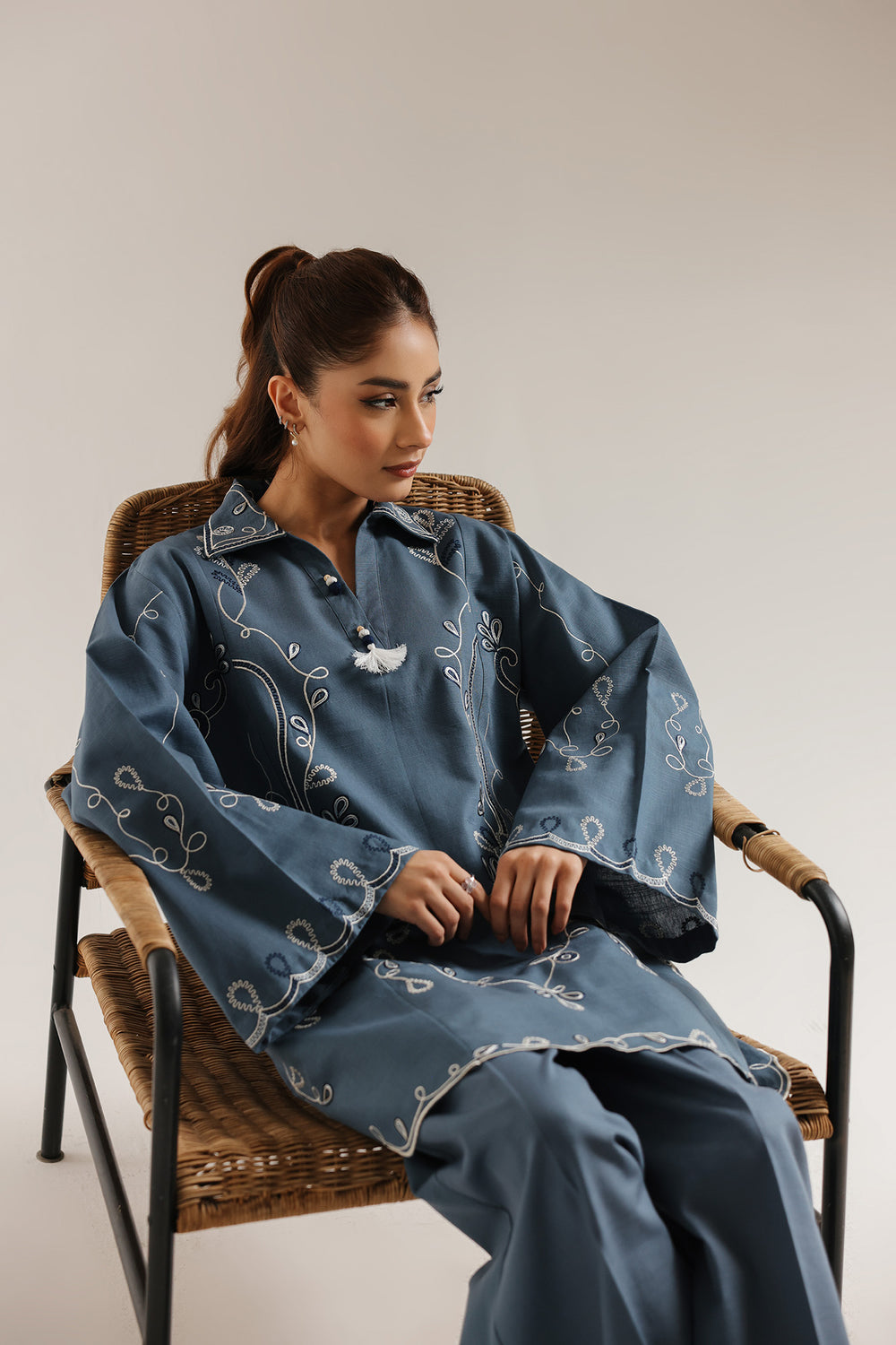 Elevate your wardrobe with this sophisticated embroidered suit, featuring a striking blue shirt adorned with delicate white embroidery. The design showcases elegant bell sleeves and a refined collar, complemented by a flattering V-neckline slit. Paired with comfortable wide-leg trousers, this ensemble delivers both style and ease of movement. Perfect for formal occasions, celebrations, or elevated everyday wear, this piece combines traditional craftsmanship with contemporary silhouettes for a timeless look.