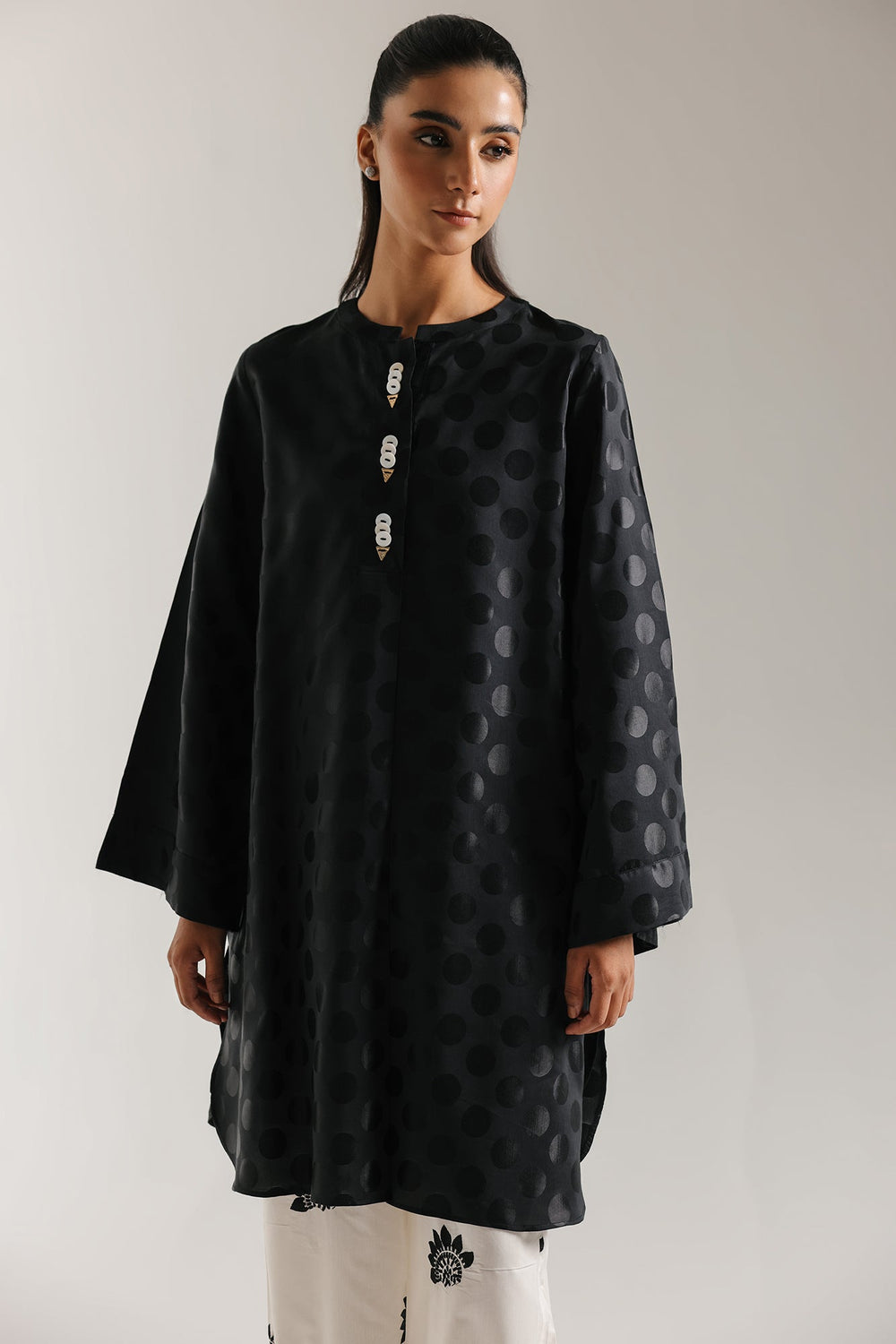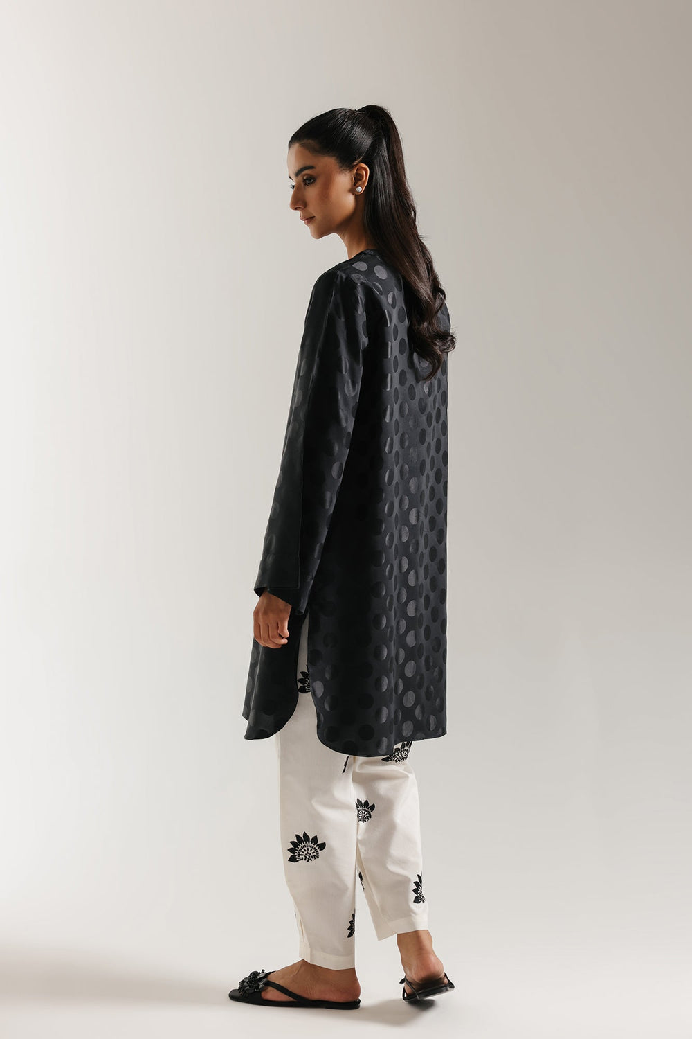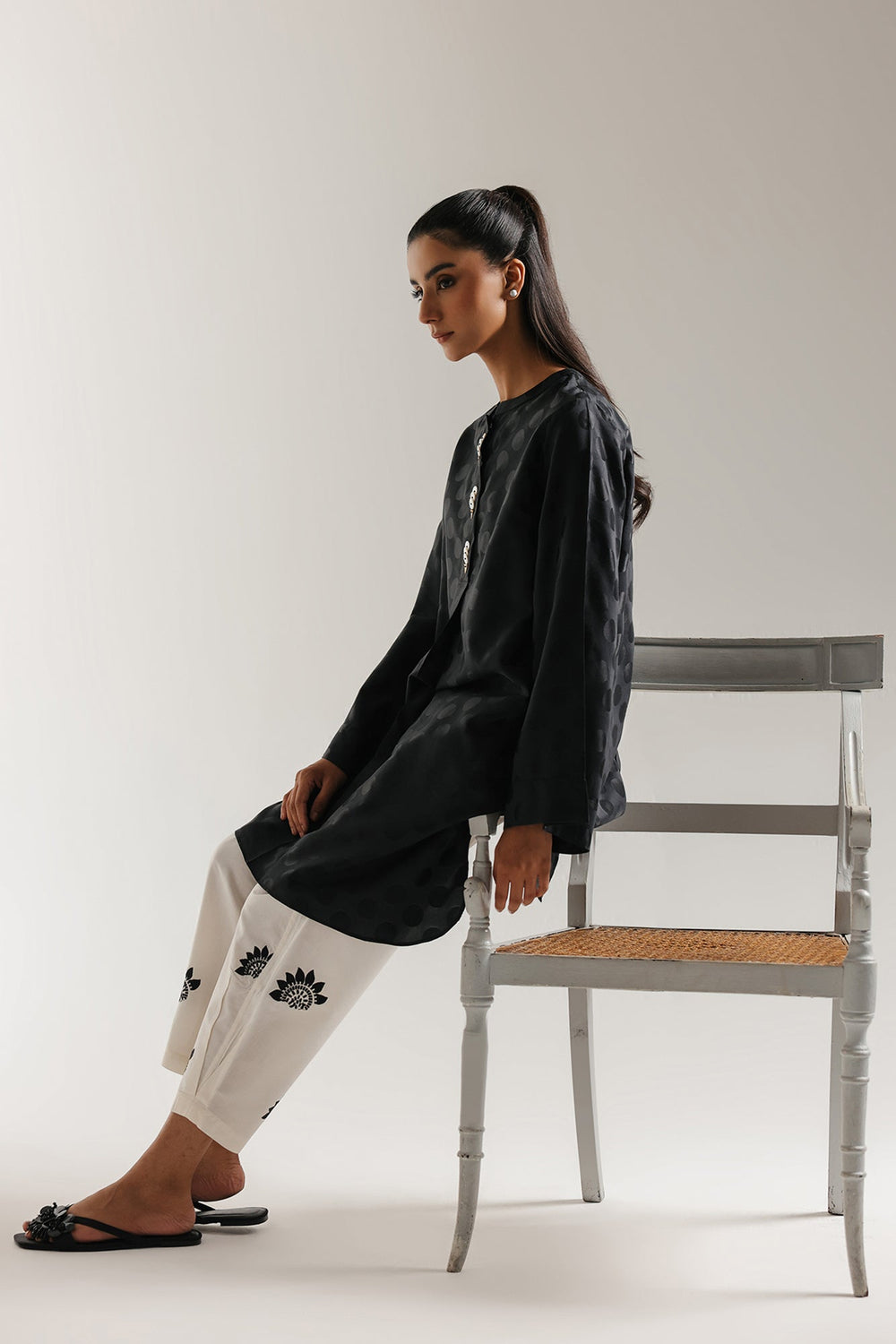 Project contemporary drama and striking contrast with this chic suit. This bold ensemble features a shirt paired with draped shalwar. The kurti is crafted from a solid black fabric featuring an elegant tonal, glossy polka dot pattern woven into the textile. It is designed with a high band collar and a front placket accented by oversized, contrasting white buttons. The shalwar offer a stunning juxtaposition, made from a crisp white fabric adorned with large, bold black floral print. This outfit makes a high-impact monochrome statement, perfect for a fashion-forward look.