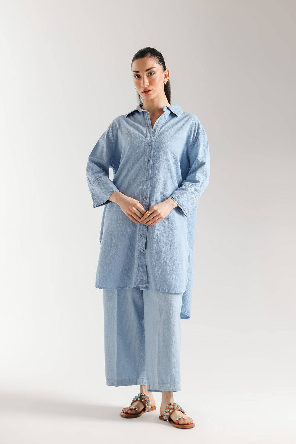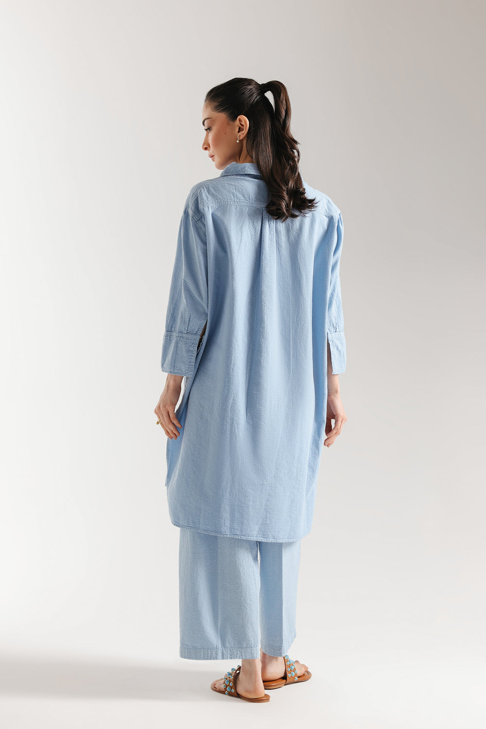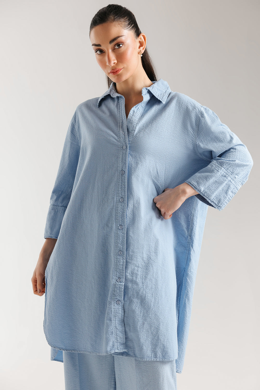 Embrace a minimalist yet modern aesthetic with this light-blue two-piece solid suit, featuring an oversized button-down shirt and coordinated straight-leg trousers. The shirt is designed with a classic pointed collar and a full-length front-button closure, offering a relaxed, loose-fit silhouette with a slightly elongated back hem. Its long sleeves are finished with clean, simple cuffs, maintaining the garment's understated appeal. This top is paired with matching light-blue trousers in a comfortable straight-leg cut, creating a seamless, monochromatic look that is both effortless and sophisticated.