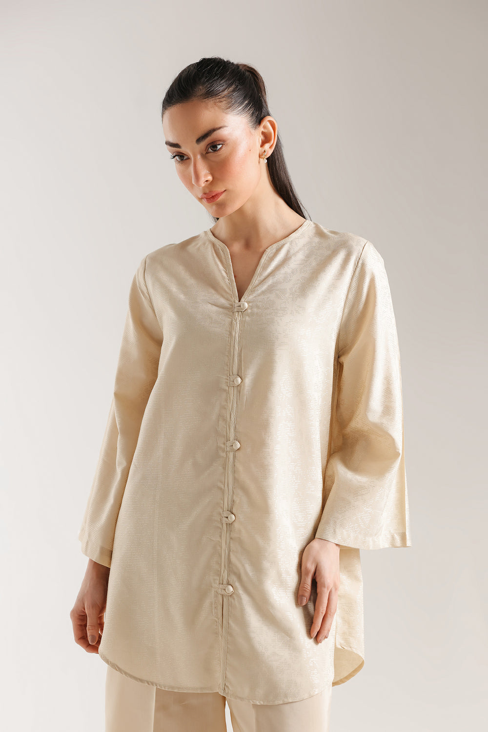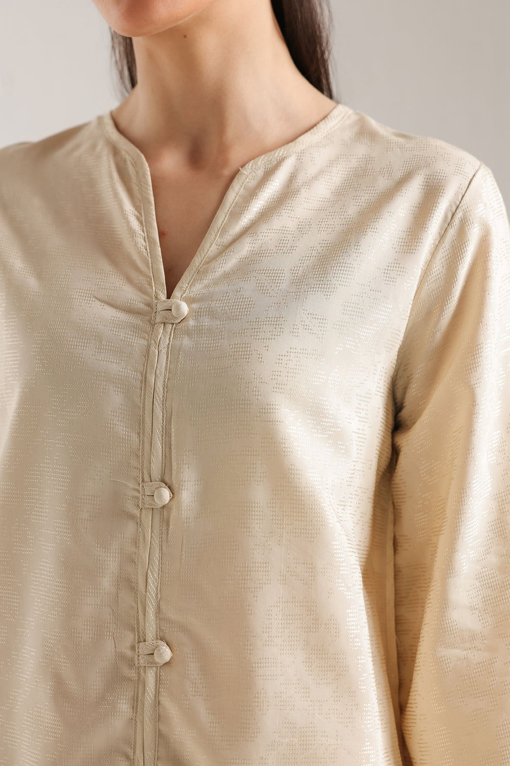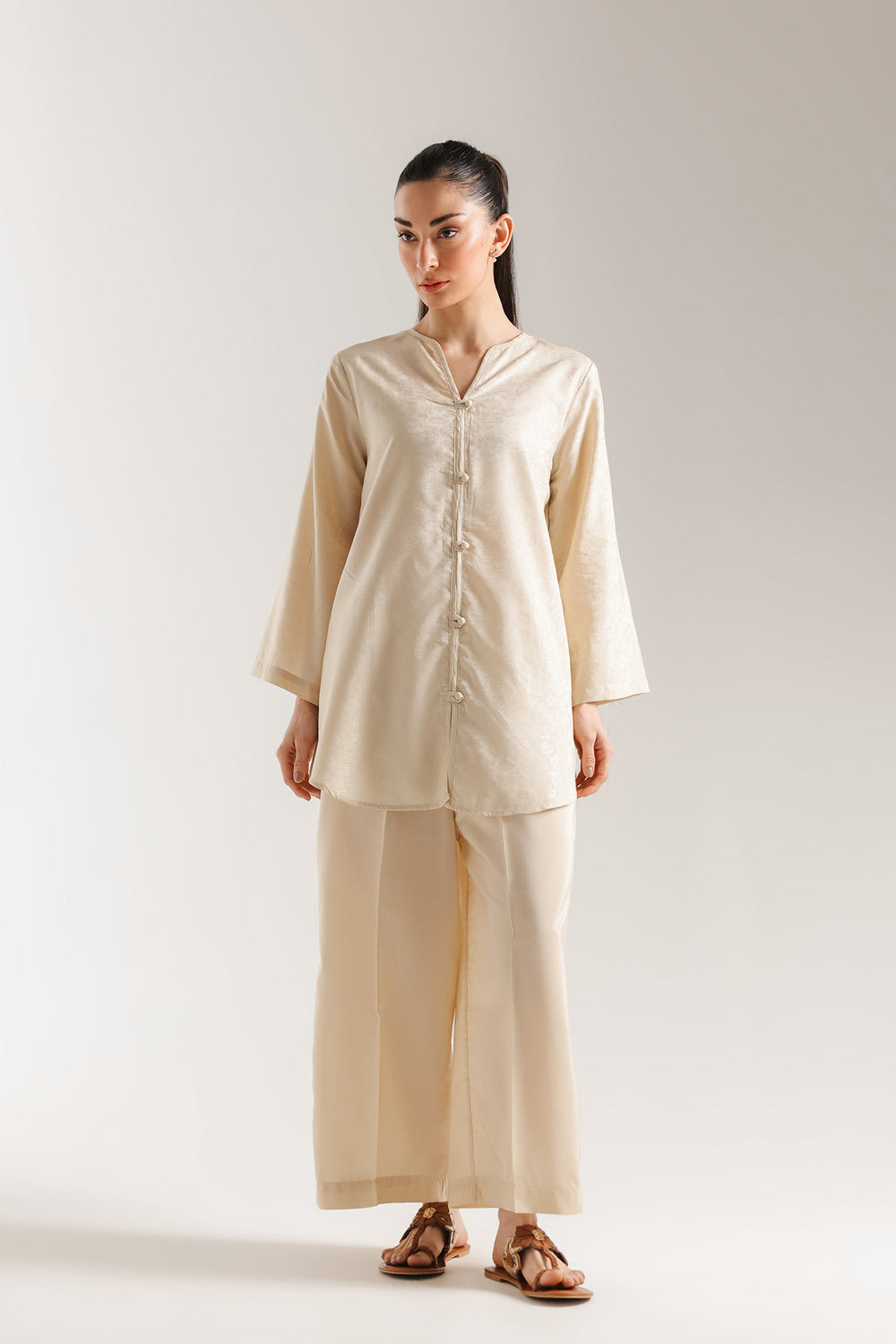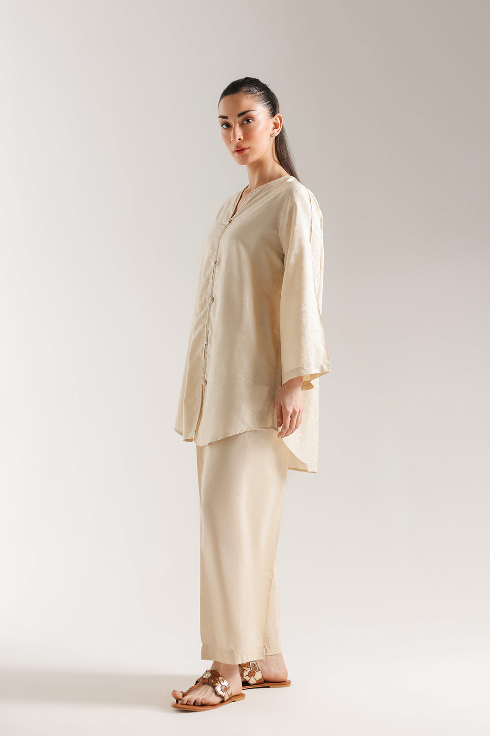 Make an understated and refined statement with this cream-colored two-piece suit, featuring a straight-cut shirt and coordinated wide-leg trousers in a subtle jacquard-textured fabric. The shirt is designed with a minimalist V-neckline and a front placket adorned with traditional fabric-covered loop buttons, creating a clean and streamlined aesthetic. With its relaxed long sleeves, curved hemline, and matching fluid trousers, this ensemble offers a perfectly balanced monochrome look that blends modern simplicity with classic tailoring.