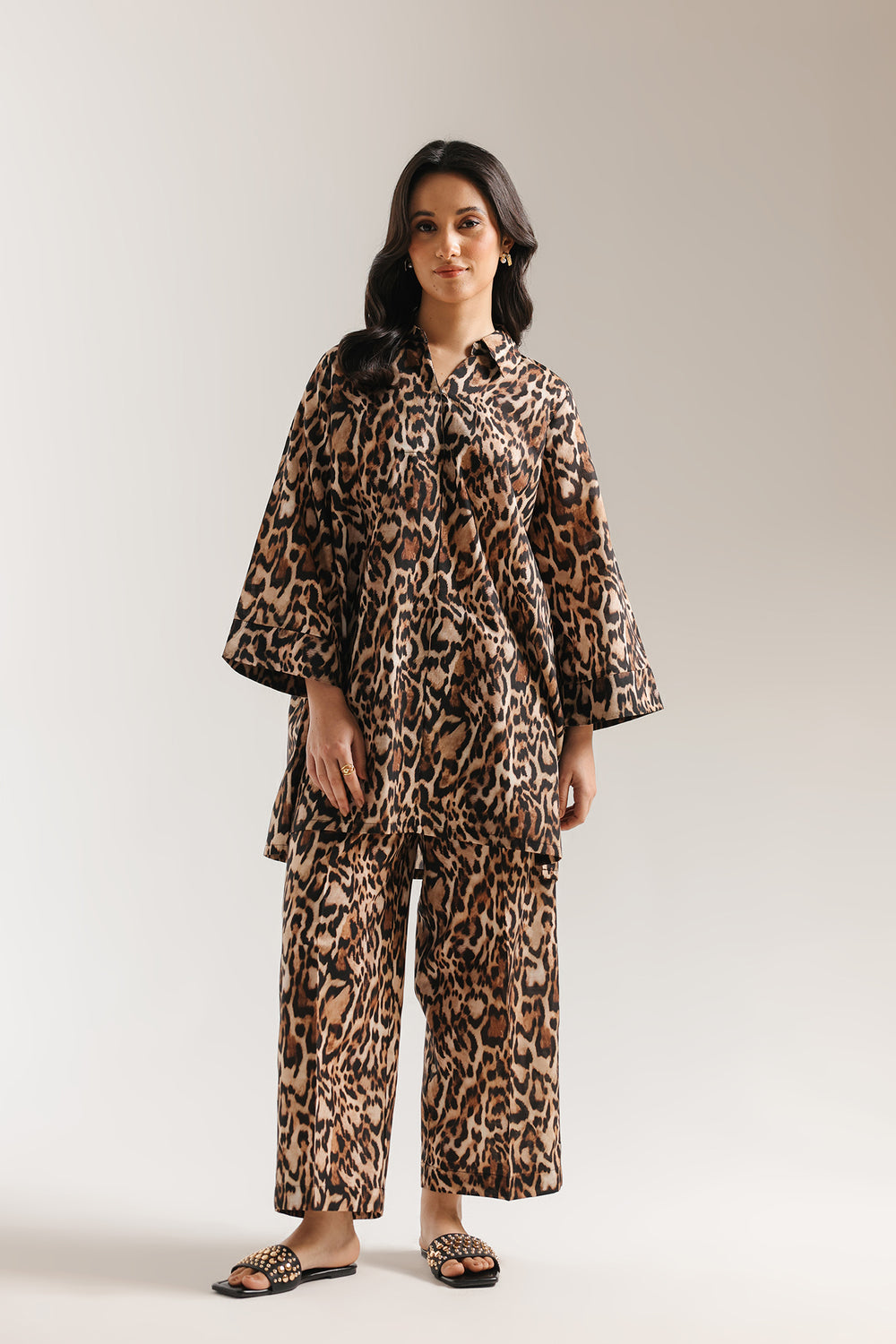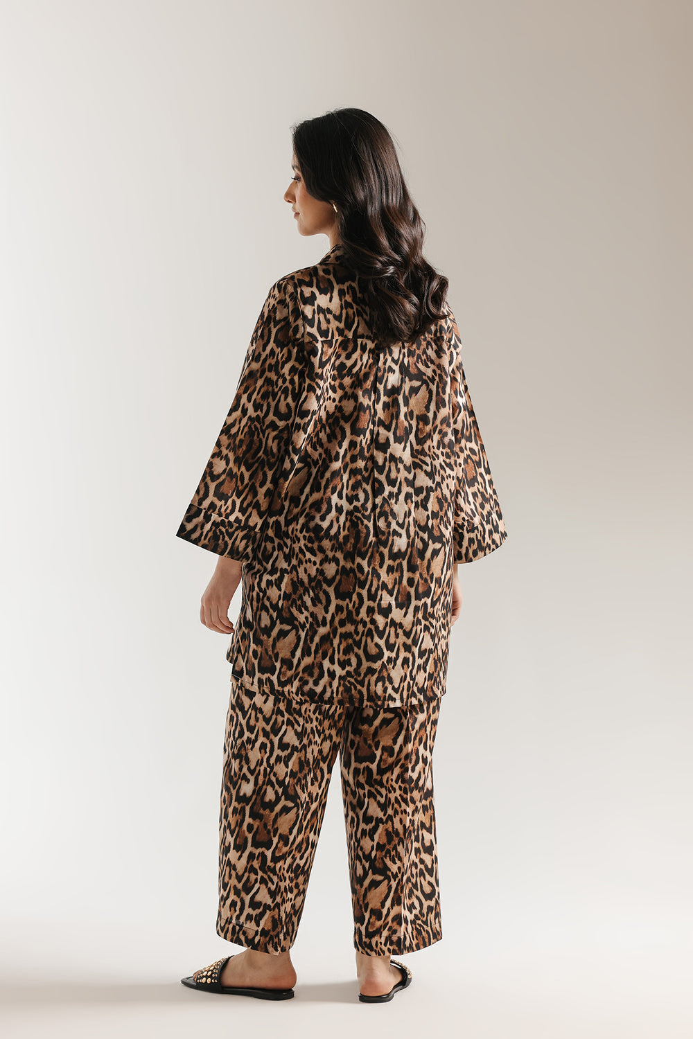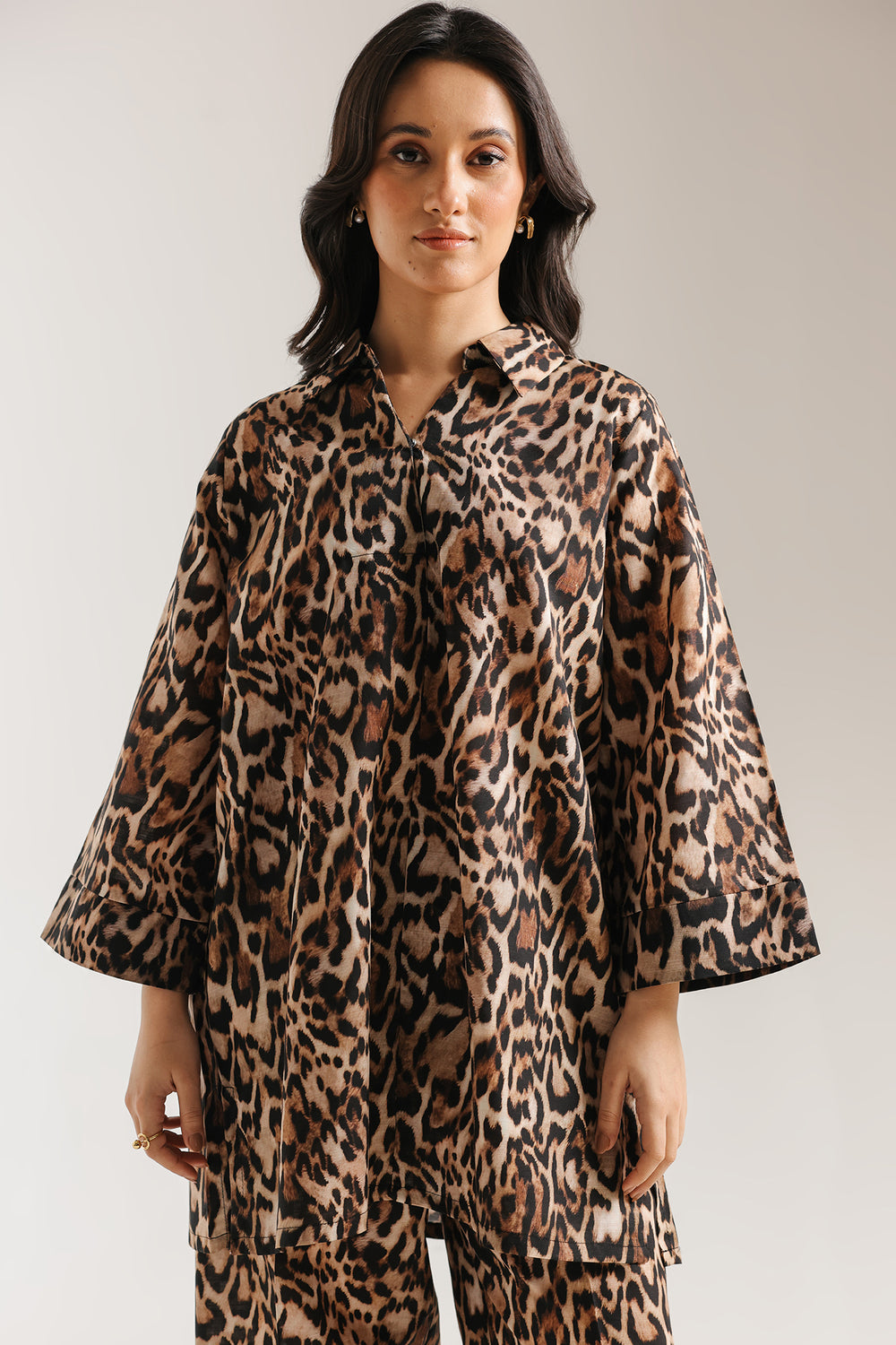 Step into the wild with this fierce and fashionable two-piece leopard print ensemble. The oversized, collared tunic features a striking animal pattern in warm earth tones, paired perfectly with matching wide-leg trouser for a bold, cohesive look. It is a captivating choice for the modern woman who loves to blend fierce confidence with effortless comfort.