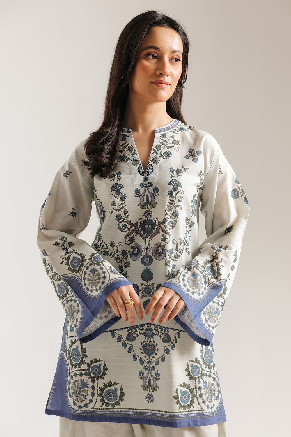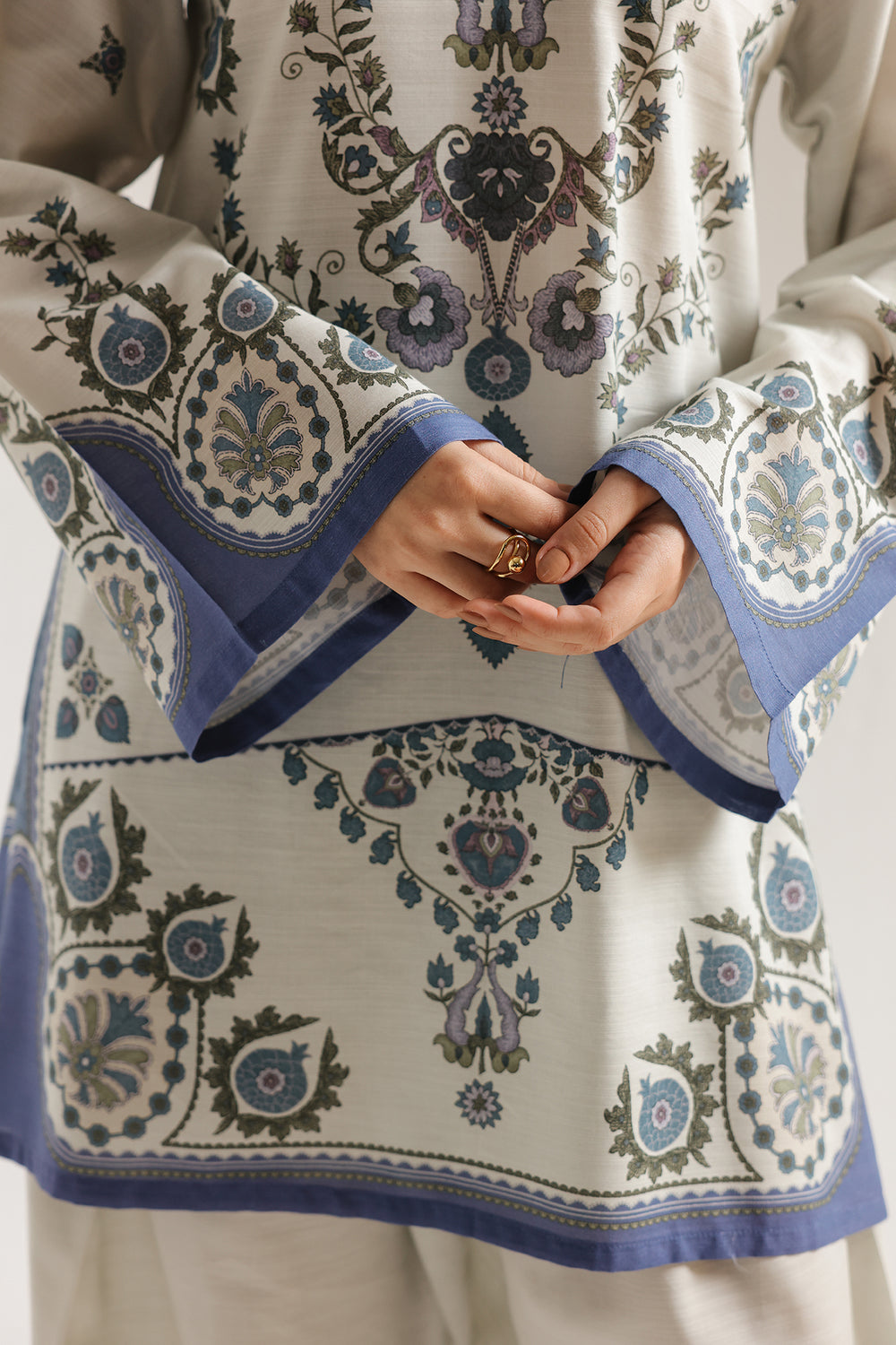 This off-white two-piece suit is a study in serene elegance, blending traditional motifs with a fresh, airy palette. The shirt is meticulously crafted from premium, lightweight fabric, featuring an intricate slate blue and sage green botanical print that flows gracefully across the front and sleeves. The design is centered around a sophisticated V-split crew neckline and wide, flared sleeves with a decorative border that adds a contemporary architectural touch. Complementing the printed top is a pair of voluminous, matching off-white shalwar that offer a relaxed, fluid drape, ensuring both comfort and style. Whether styled with minimal jewelry for a daytime event or dressed up for a formal gathering, this ensemble provides an elevated, ethereal look that is quintessentially chic.