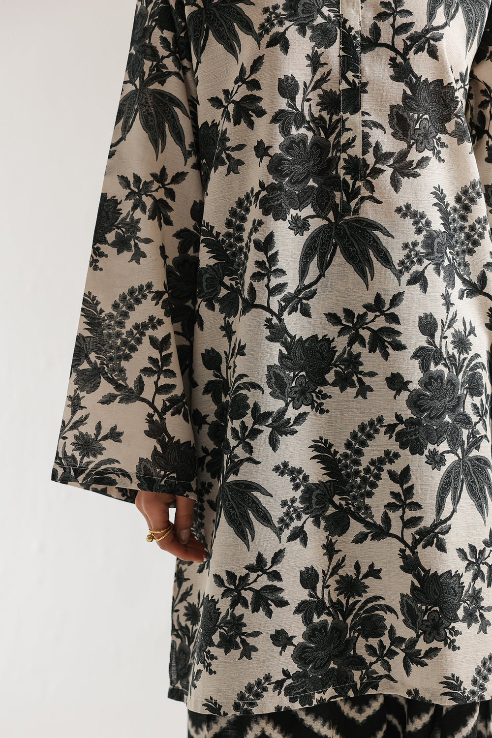 This vanilla ice and charcoal black ensemble is a sophisticated take on classic print-blocking, designed for the woman who appreciates bold yet refined aesthetics. The shirt is crafted from high-quality, breathable fabric featuring an intricate monochrome floral print that covers the straight-cut silhouette. It boasts a clean-finished crew neckline and relaxed, wide sleeves that enhance the garment's effortless drape. Complementing the floral top is a pair of statement shalwar featuring a high-contrast chevron pattern, creating a dynamic visual interplay between the two pieces. This set offers a coordinated look that is both striking and incredibly comfortable, making it an ideal choice for elevated daily wear or casual afternoon gatherings.