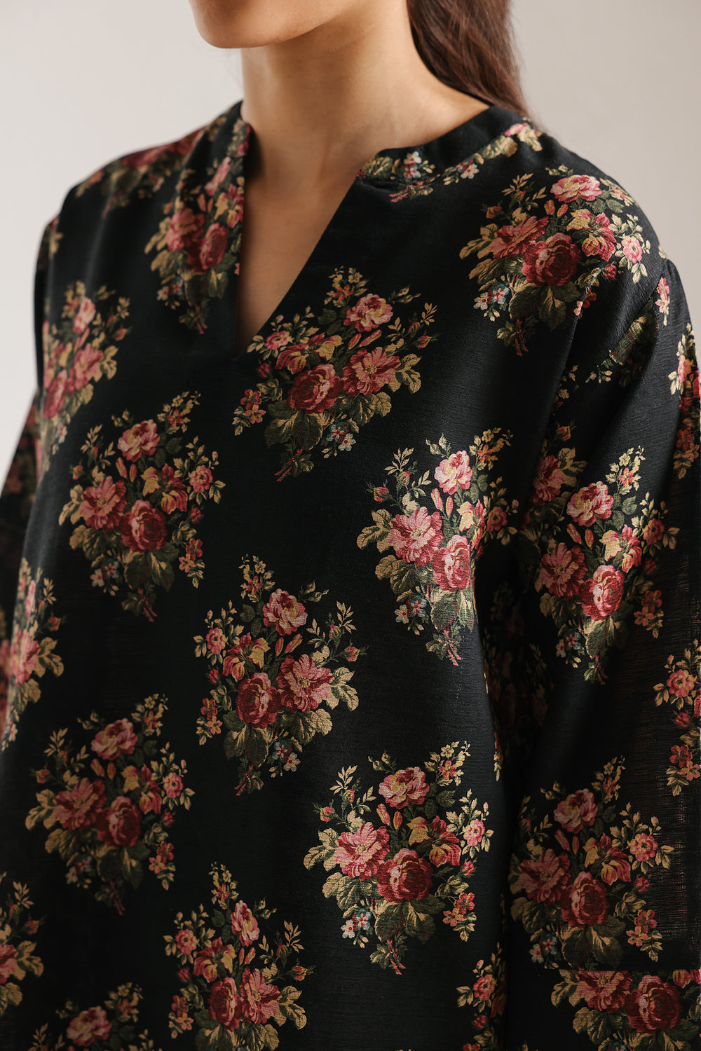 This striking ensemble masterfully balances moody sophistication with vintage-inspired charm. The straight-cut, mid-length tunic features a deep black or navy foundation adorned with a repetitive vintage rose bouquet print in romantic pink and verdant green tones, creating captivating visual contrast. The structured mandarin collar with a refined V-slit adds formal polish to the silhouette, while the coordinating wide-leg culottes showcase a bold black-and-white diamond or checkerboard pattern that grounds the composition. This thoughtfully layered color story—pairing dark, grounded tones with delicate florals and geometric precision—delivers a sophisticated aesthetic that transcends seasons. Perfect for those seeking distinctive style with understated confidence, this versatile set transitions seamlessly from professional settings to social gatherings.