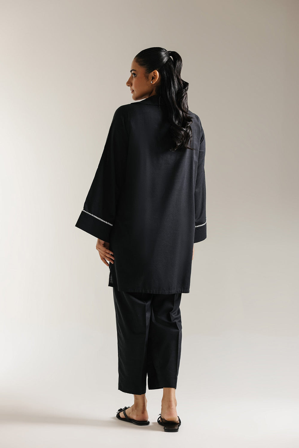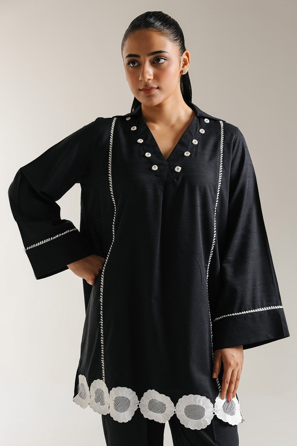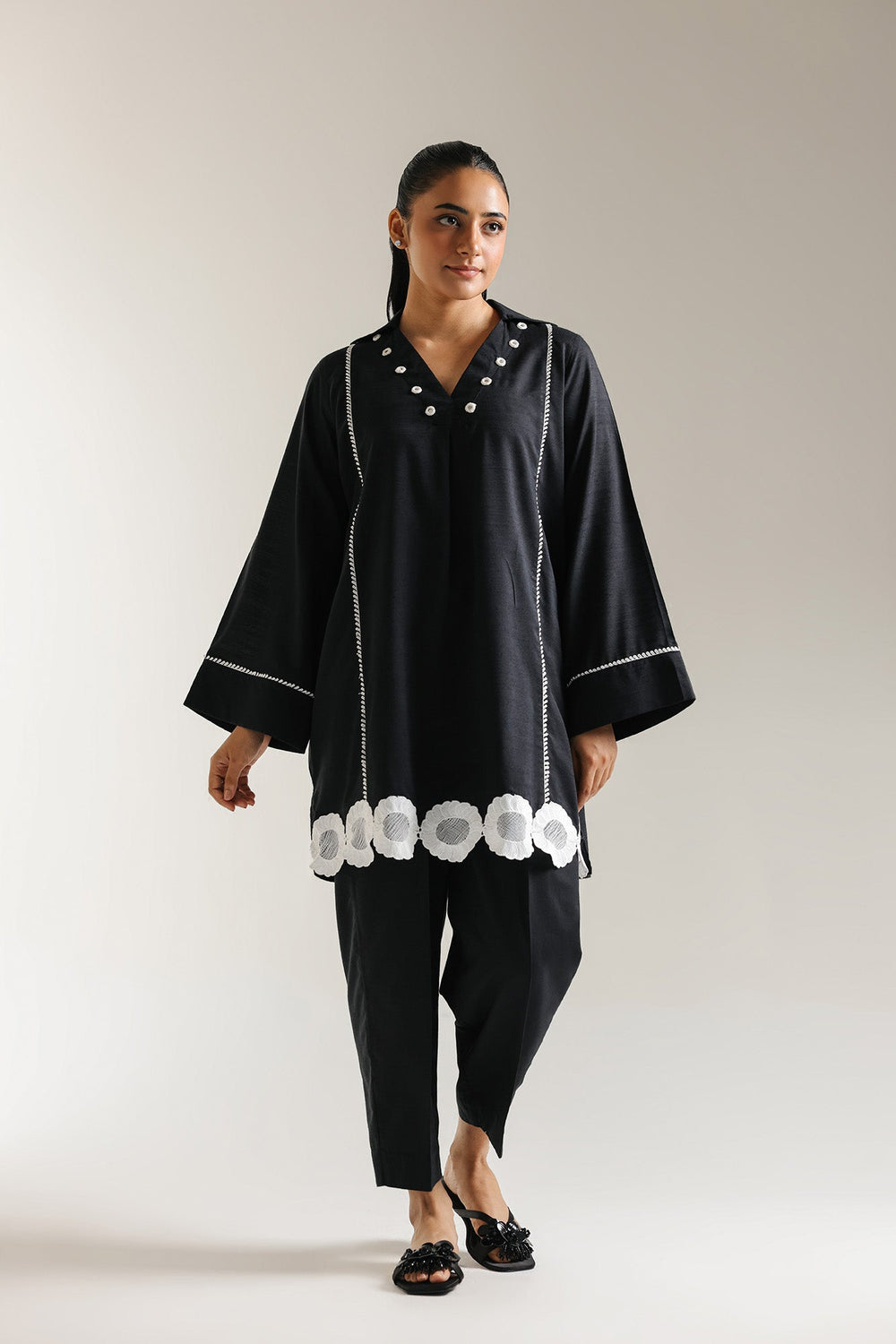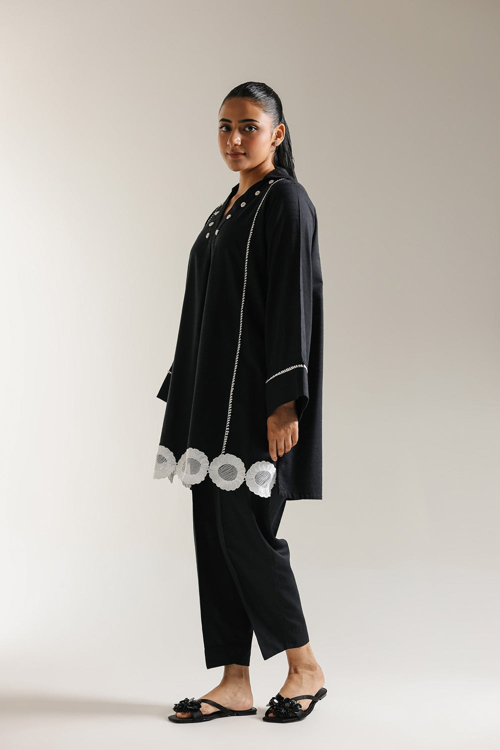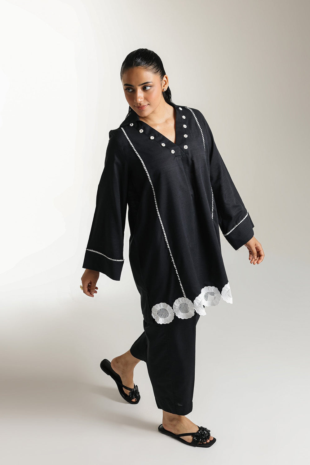 Make a statement of modern elegance with this striking two-piece ensemble, a perfect blend of classic black and white artistry. The sophisticated black kurta is beautifully adorned with contrasting white embroidery, featuring elegant vertical lines and a distinctive large floral or medallion motif along the hem, creating a unique and eye-catching design. It is perfectly complemented by matching black trousers, ensuring a cohesive and polished silhouette. This outfit is ideal for smart casual events, festive gatherings, or making a distinctive and graceful impression.
