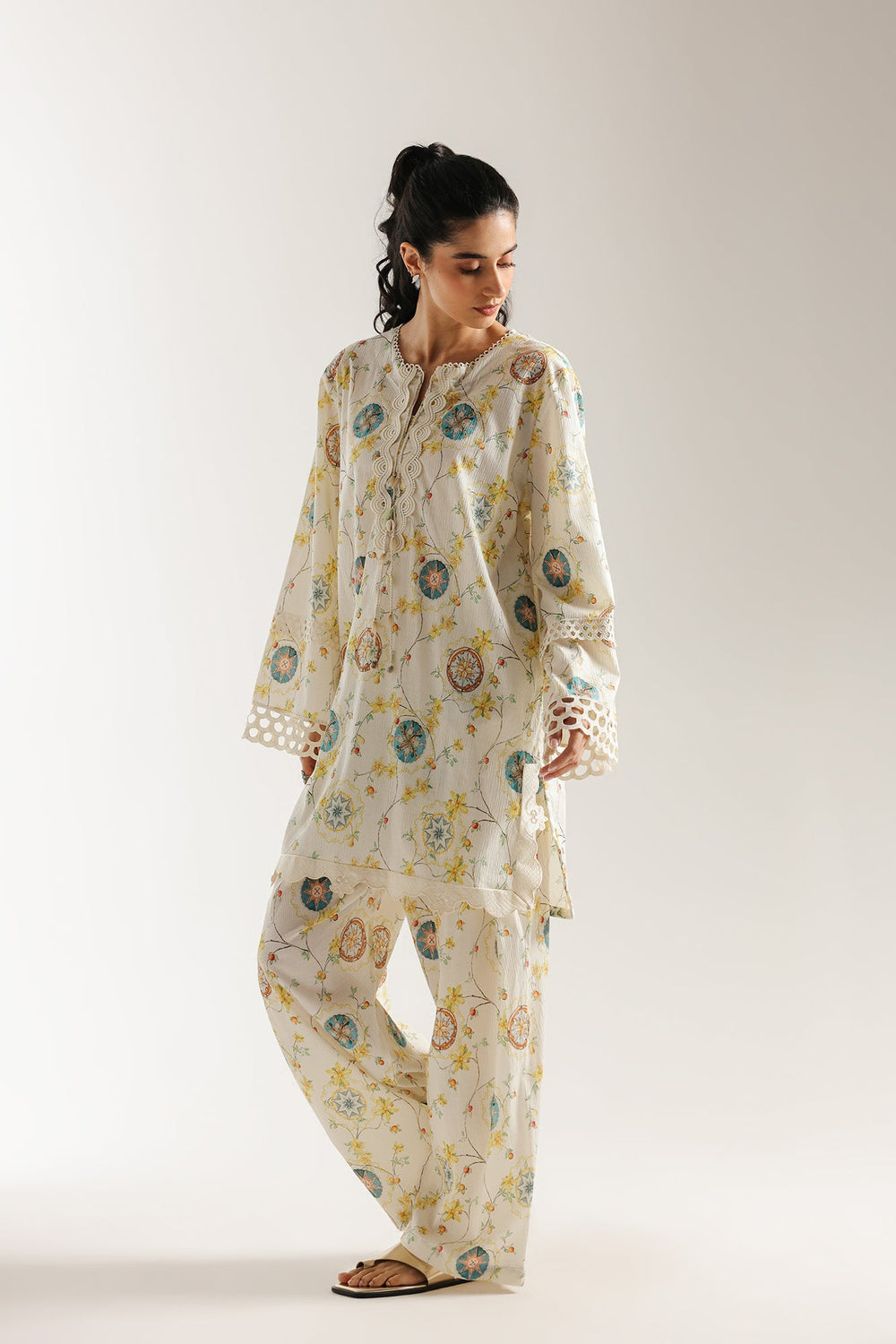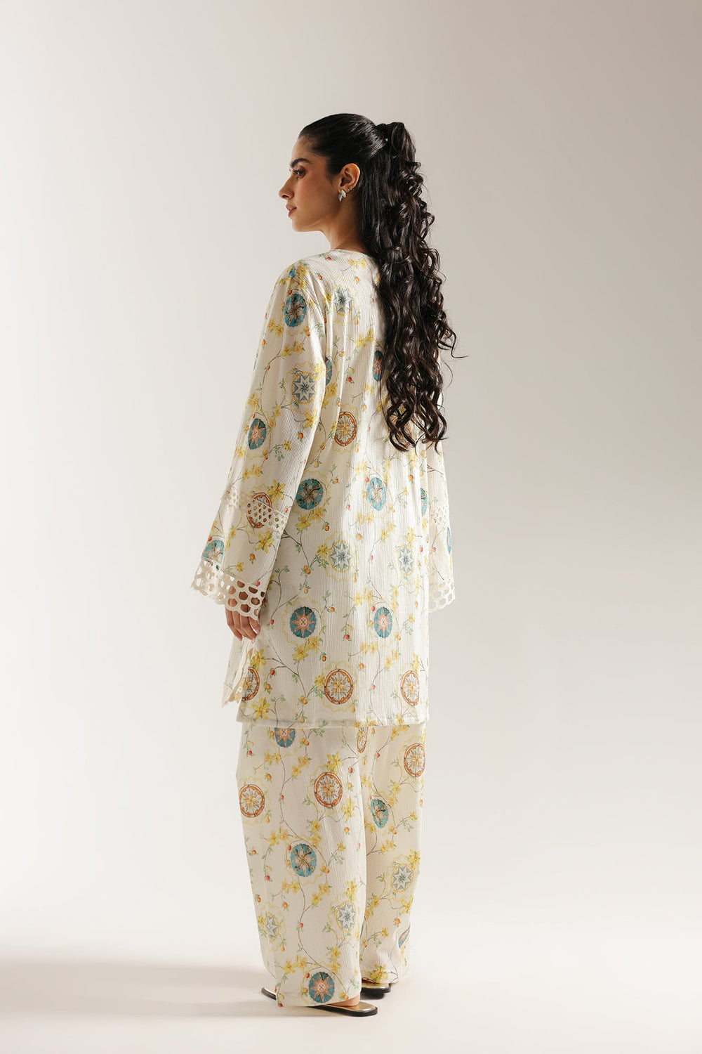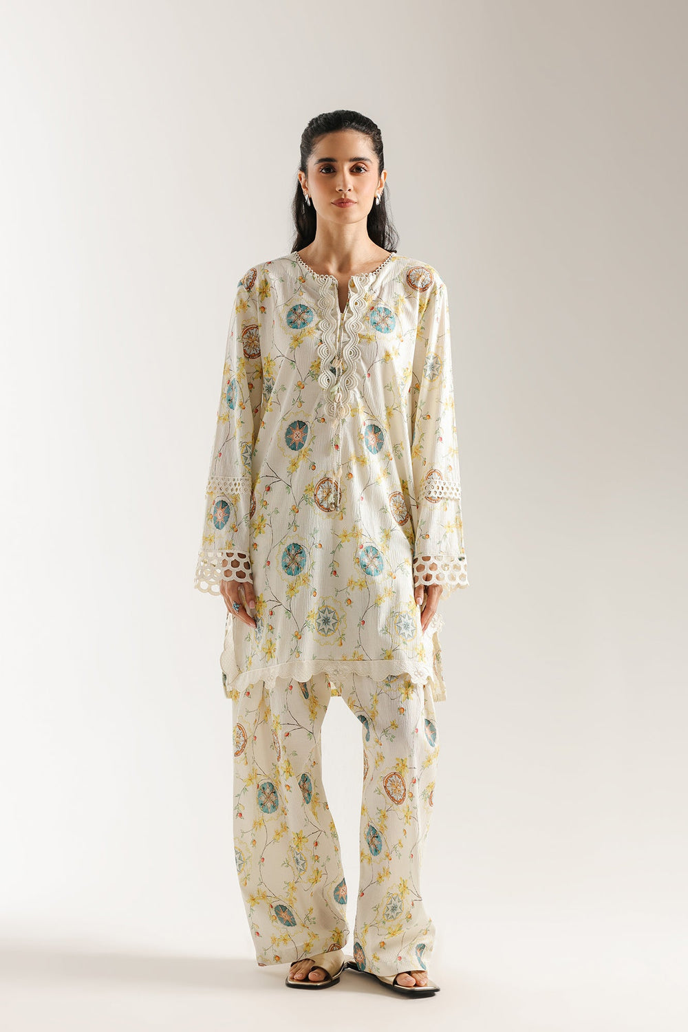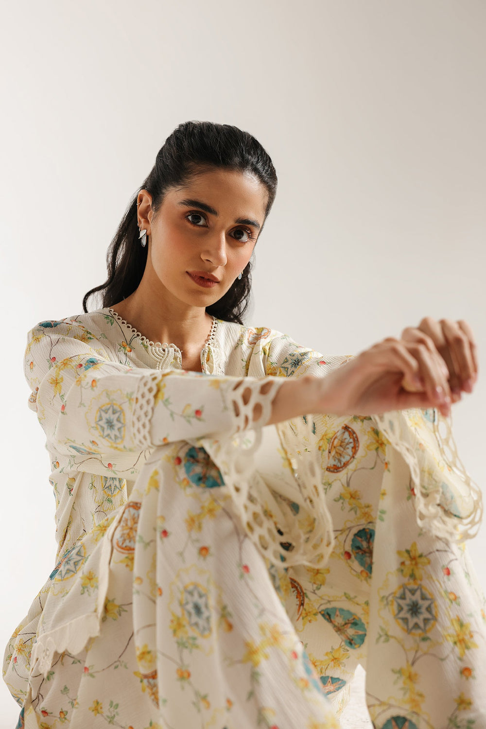Step into a garden of delight with this enchanting embroidered suit. This two-piece ensemble features a delicate off-white fabric, beautifully adorned with an all-over print of whimsical flowers and circular motifs in soft shades of yellow, blue, and green. The kurta boasts intricate lace detailing around the neckline and cuffs, adding an exquisite touch. Paired with coordinating shalwar that mirror the playful print, this suit creates a harmonious and captivating look, perfect for a fresh and elegant statement