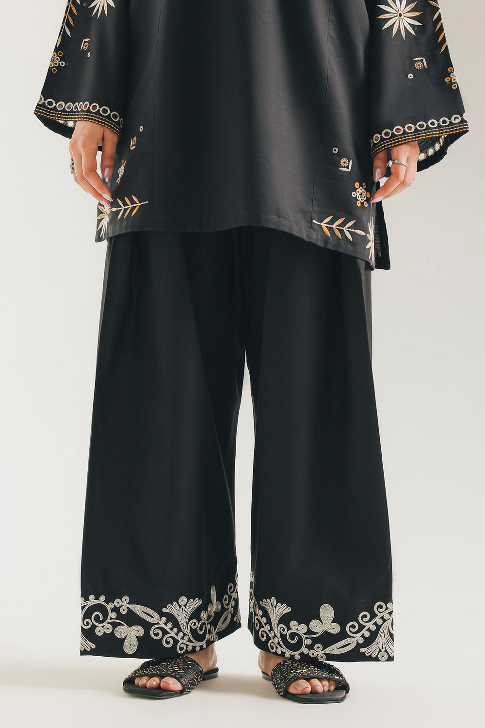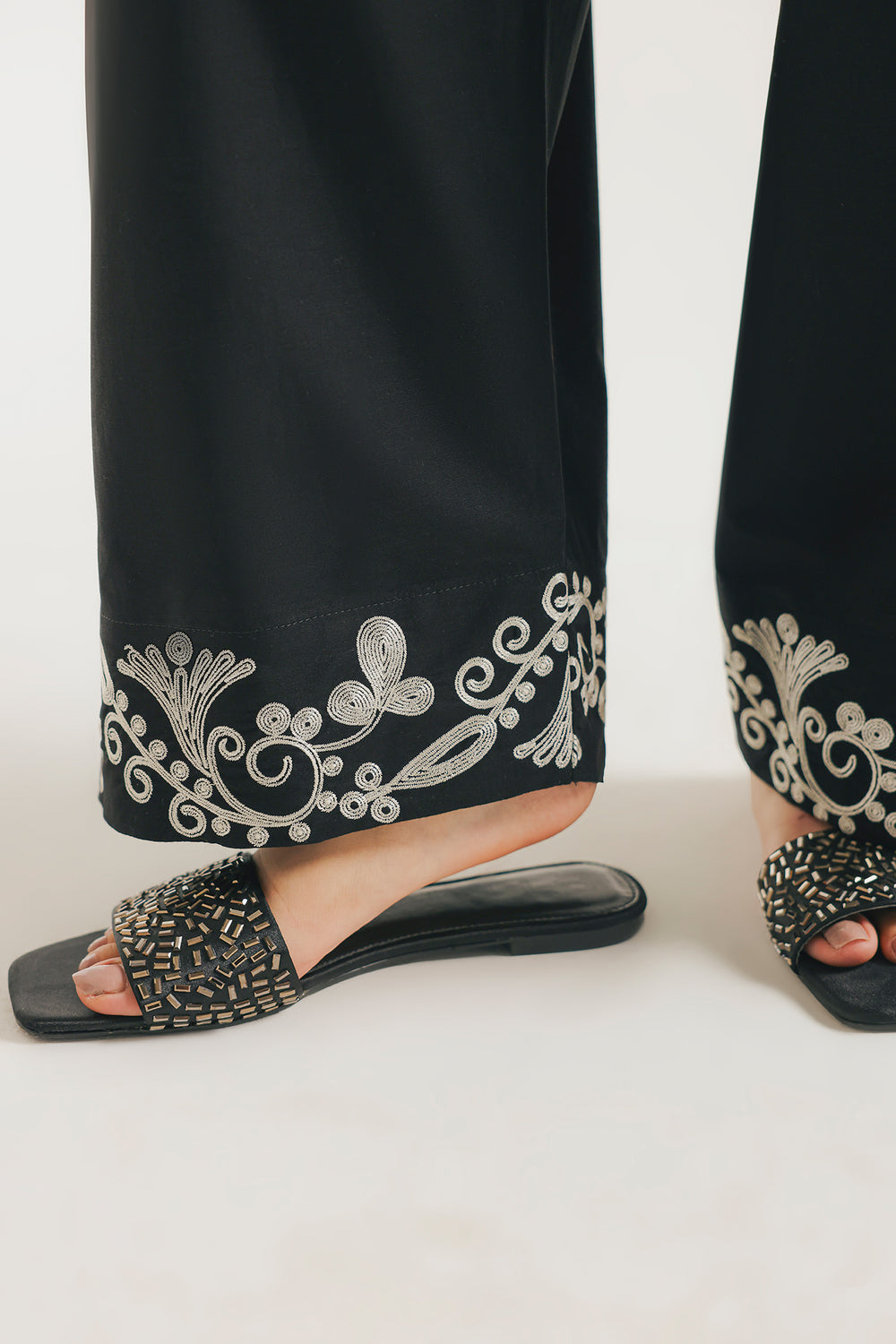 Introduce an element of subtle drama to your traditional wear with this elegant black shalwar. It features a classic, comfortable wide-leg silhouette in a rich black fabric. The true highlight is the exquisite white thread embroidery that adorns the hem, creating a striking, intricate floral and scrolling border. This versatile shalwar pair beautifully with a variety of kurtas, adding a sophisticated and artful touch to any outfit.
