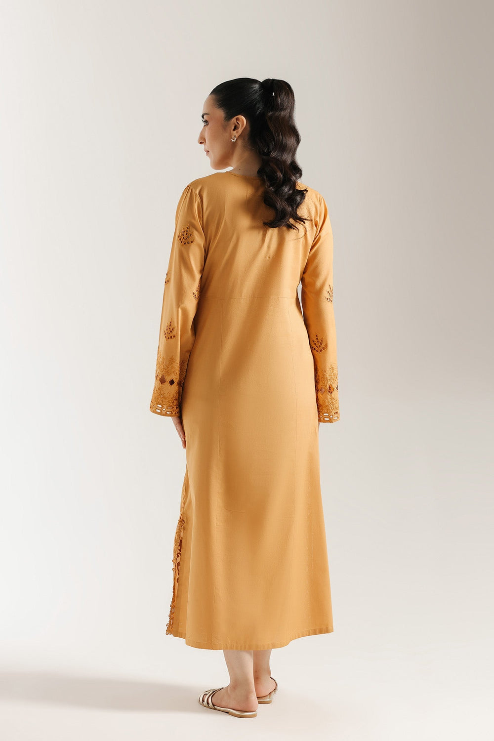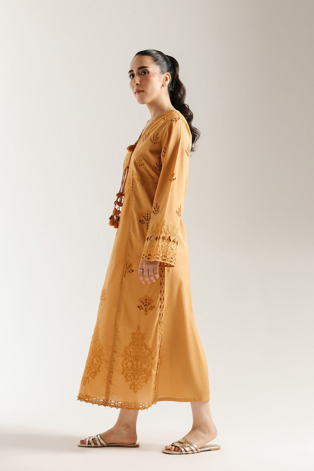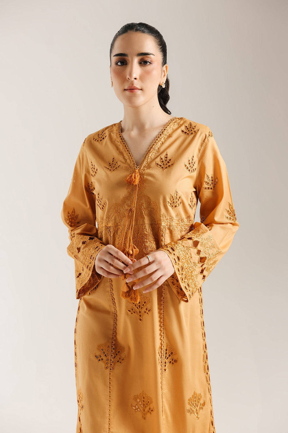 Bask in the golden glow of intricate design. This stunning embroidered tunic features a rich mustard-yellow fabric adorned with delicate, tone-on-tone floral and geometric embroidery. The flowing silhouette is enhanced by beautifully detailed bell sleeves and a charming tassel detail at the neckline. The subtle cutwork accents add a touch of modern elegance, making this tunic a perfect choice for adding a touch of warmth and sophistication to your look.