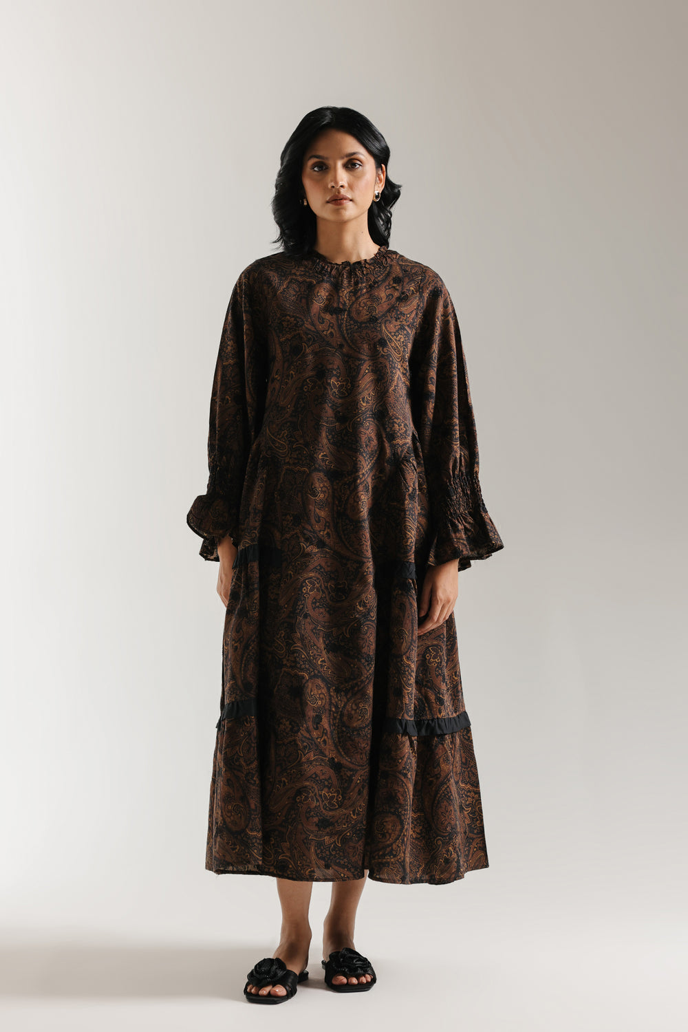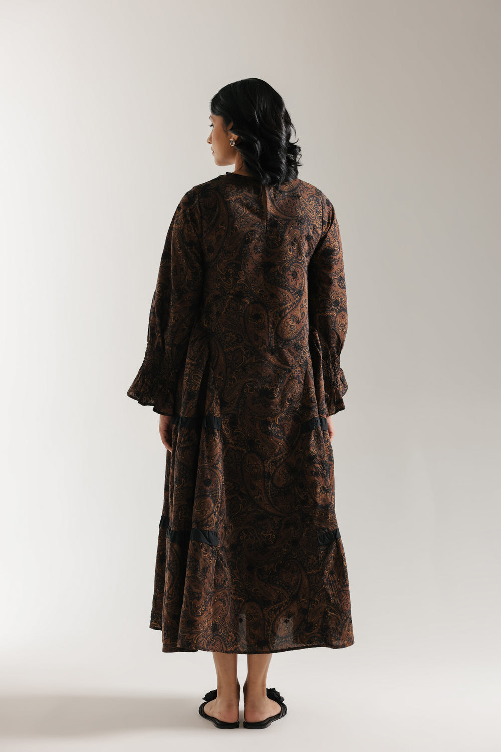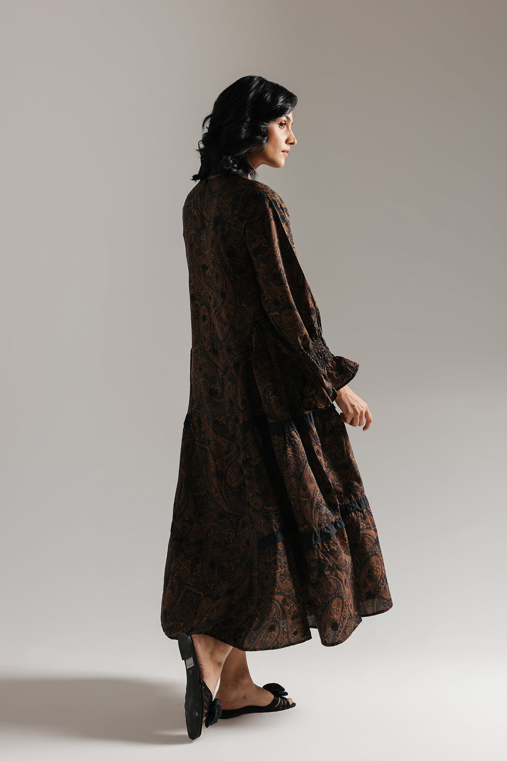 Elevate your winter wardrobe with this expertly crafted embroidered dress featuring intricate embroidery layered on a striking black canvas. The contemporary silhouette showcases playful paisley prints in deep brown hues that bring an artistic, experimental edge to the ensemble. Designed for those who appreciate refined craftsmanship paired with modern aesthetics, this piece transitions seamlessly from daytime gatherings to evening celebrations. The sophisticated embroidery detailing ensures you'll stand out with understated elegance at any occasion.