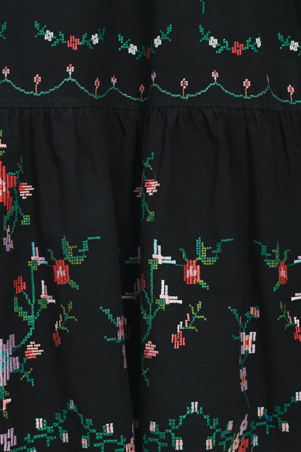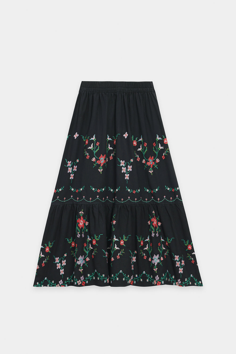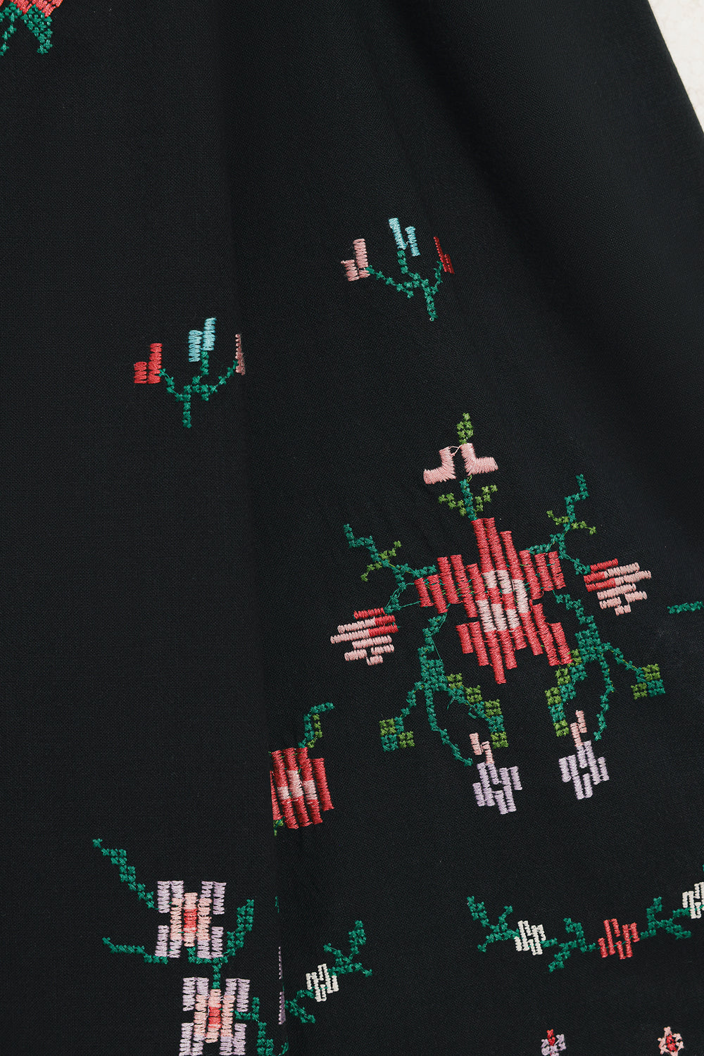 Immerse yourself in timeless elegance with this captivating two-piece ensemble. This beautiful black suit features a shirt adorned with intricate floral and vine embroidery in vibrant shades of red, green, and white. The puffed, full sleeves and delicate lace-up detailing on the neckline add a touch of bohemian charm. The outfit is completed with a matching skirt that has a beautiful tiered silhouette, creating a fluid and elegant look. This versatile suit is perfect for making a stylish statement at any event.