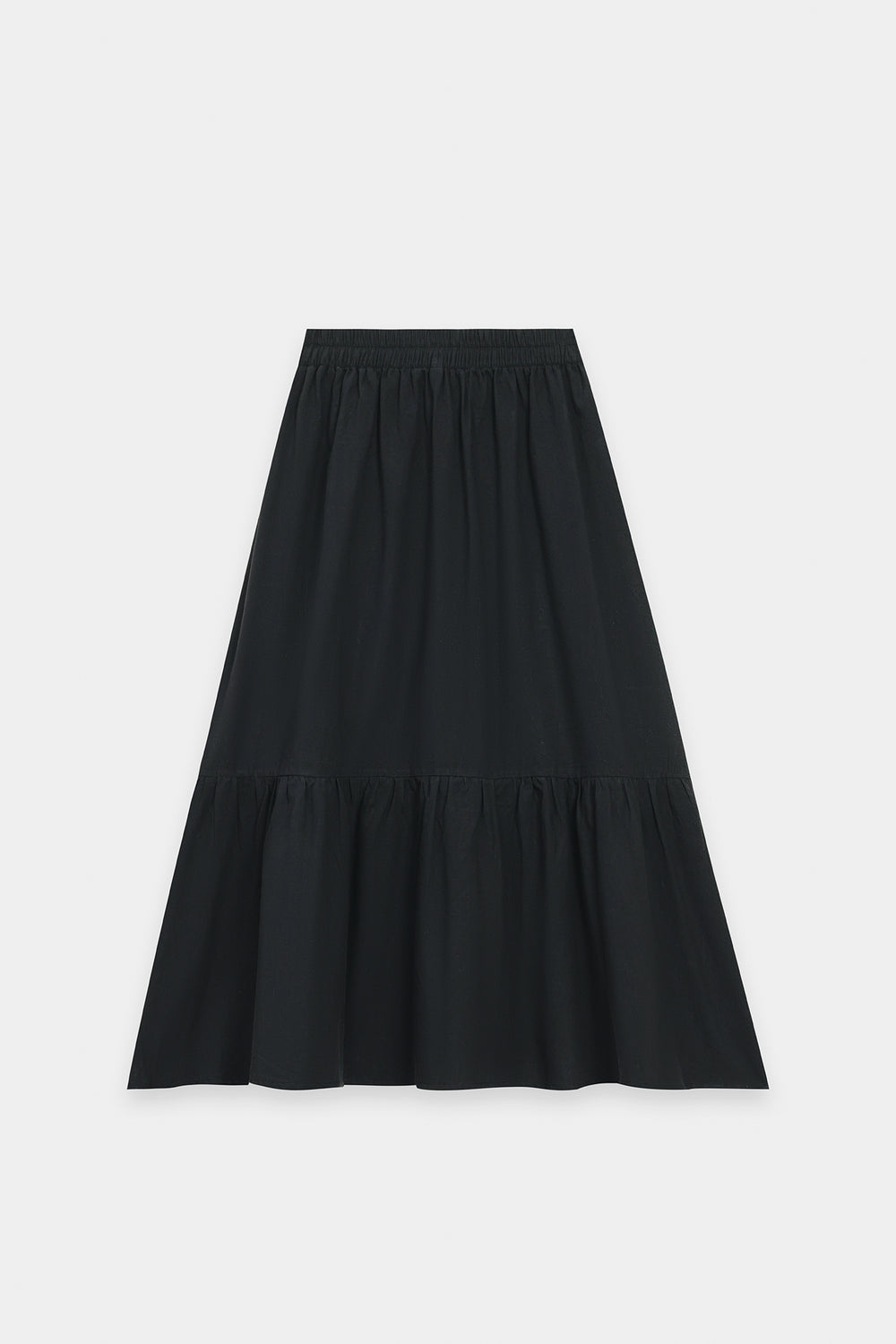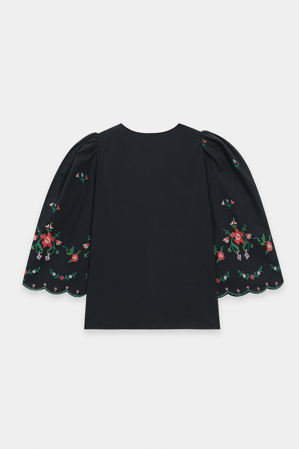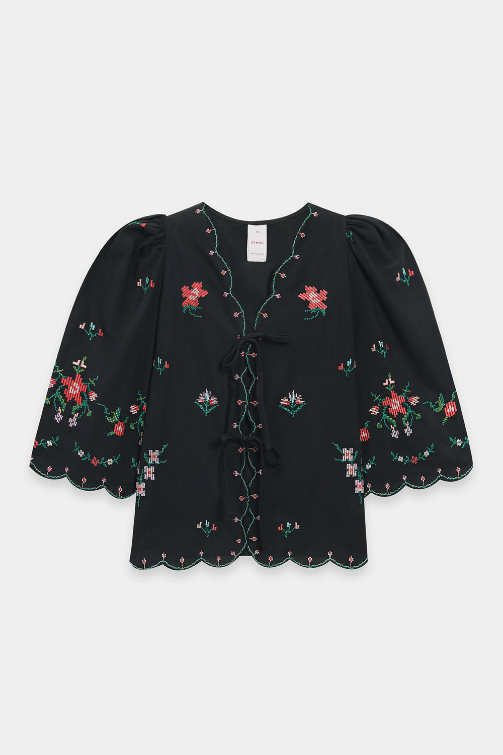 Immerse yourself in timeless elegance with this captivating two-piece ensemble. This beautiful black suit features a shirt adorned with intricate floral and vine embroidery in vibrant shades of red, green, and white. The puffed, full sleeves and delicate lace-up detailing on the neckline add a touch of bohemian charm. The outfit is completed with a matching skirt that has a beautiful tiered silhouette, creating a fluid and elegant look. This versatile suit is perfect for making a stylish statement at any event.