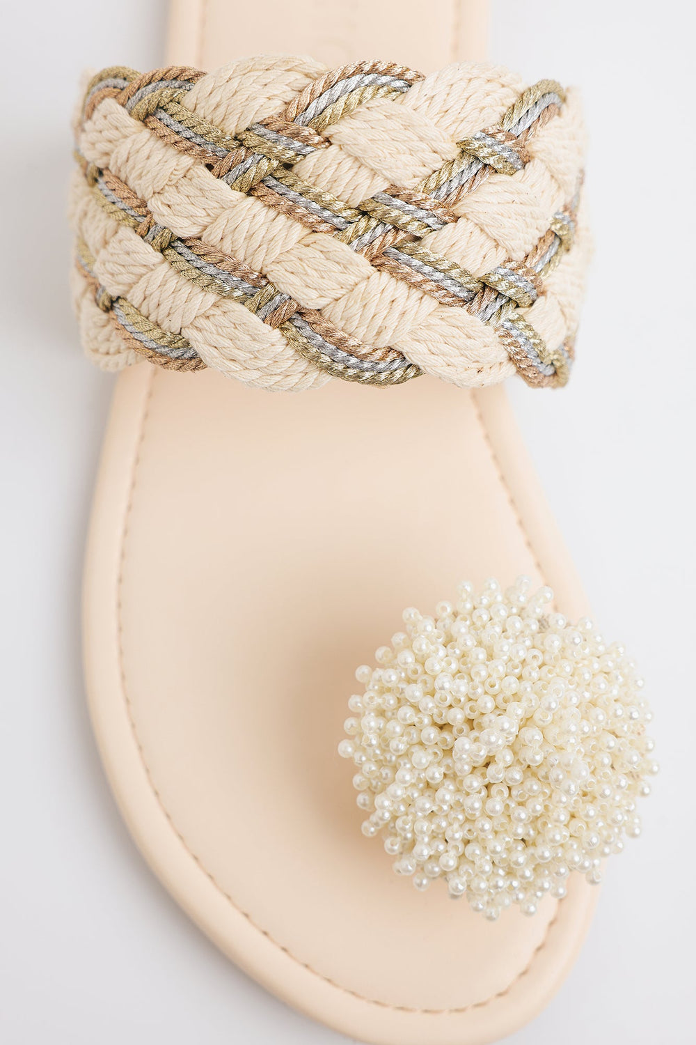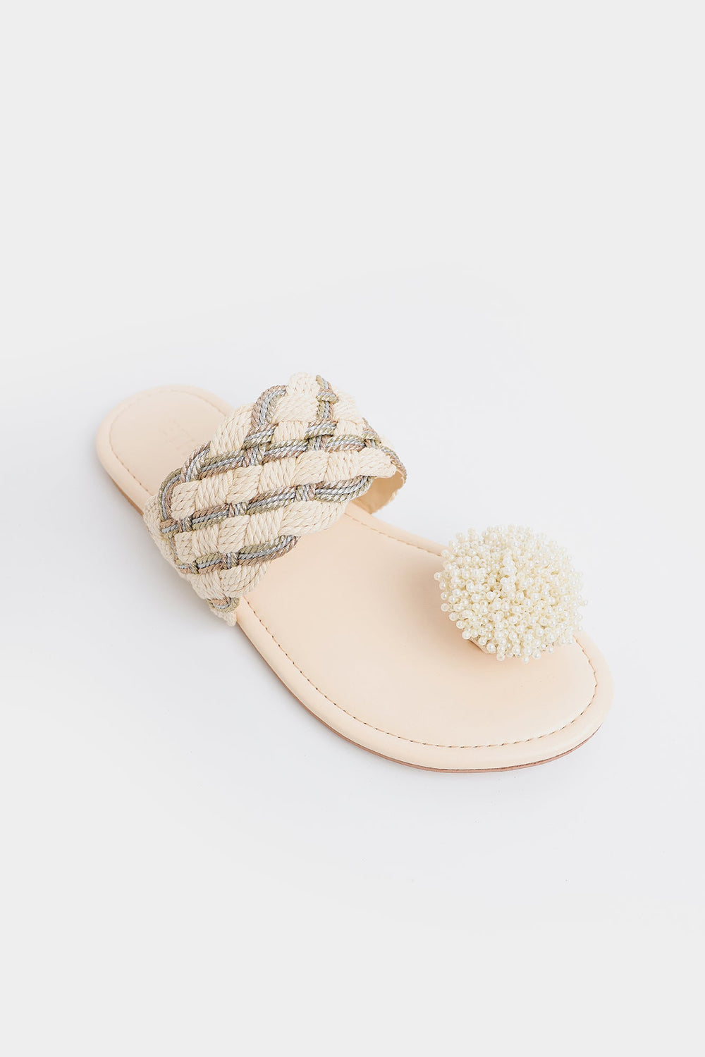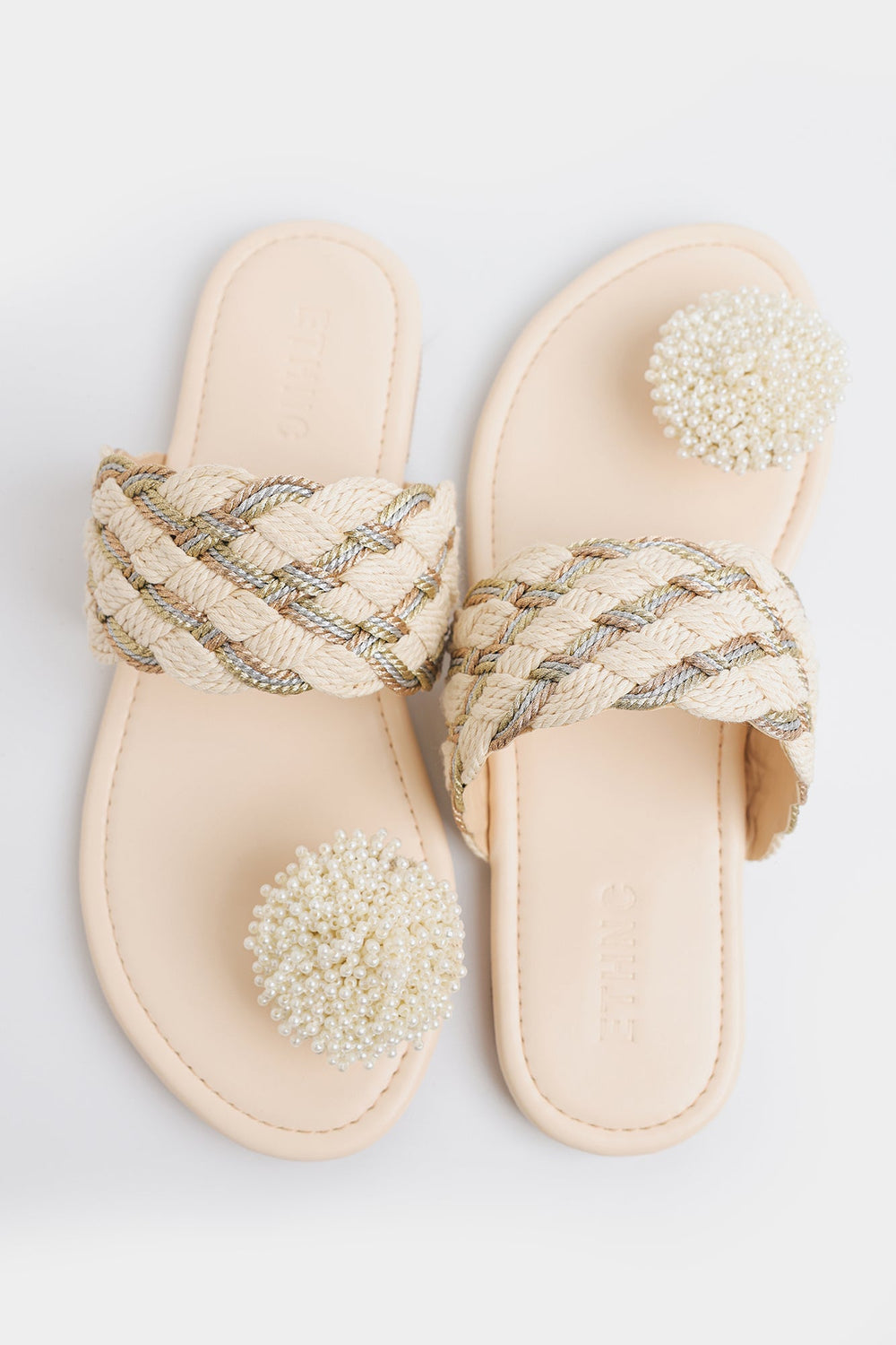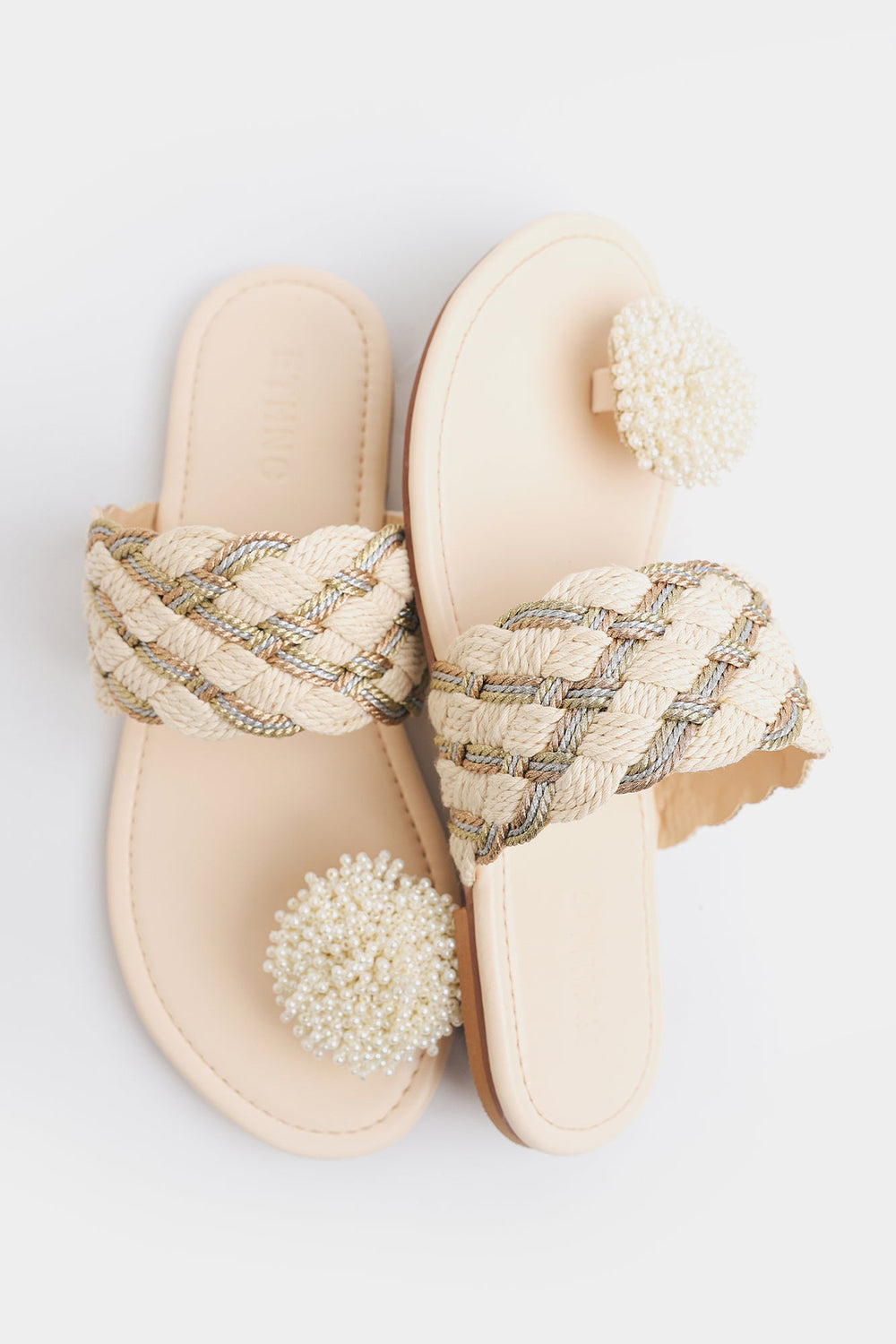 These are elegant vanilla ice slip-on khola puri with detailed weaving. The khola puri have a beige base and a center strap adorned with a metallic embellishment featuring woven-like designs, adding to its ethnic and bohemian charm. These sandals effortlessly combine tradition and contemporary fashion, perfect for both everyday and special occasions.