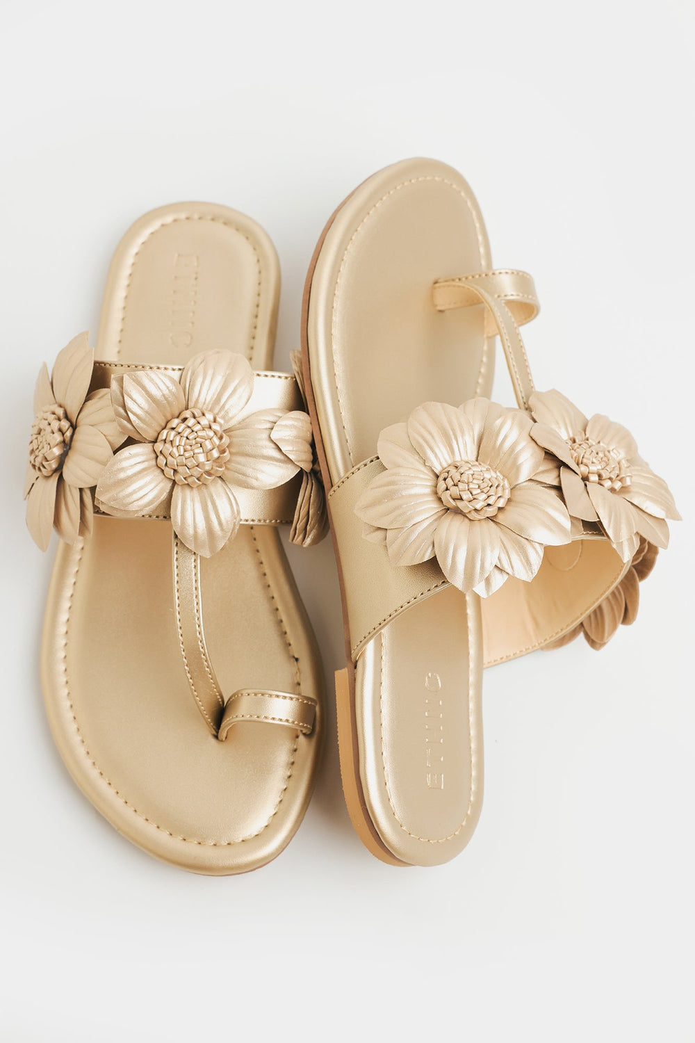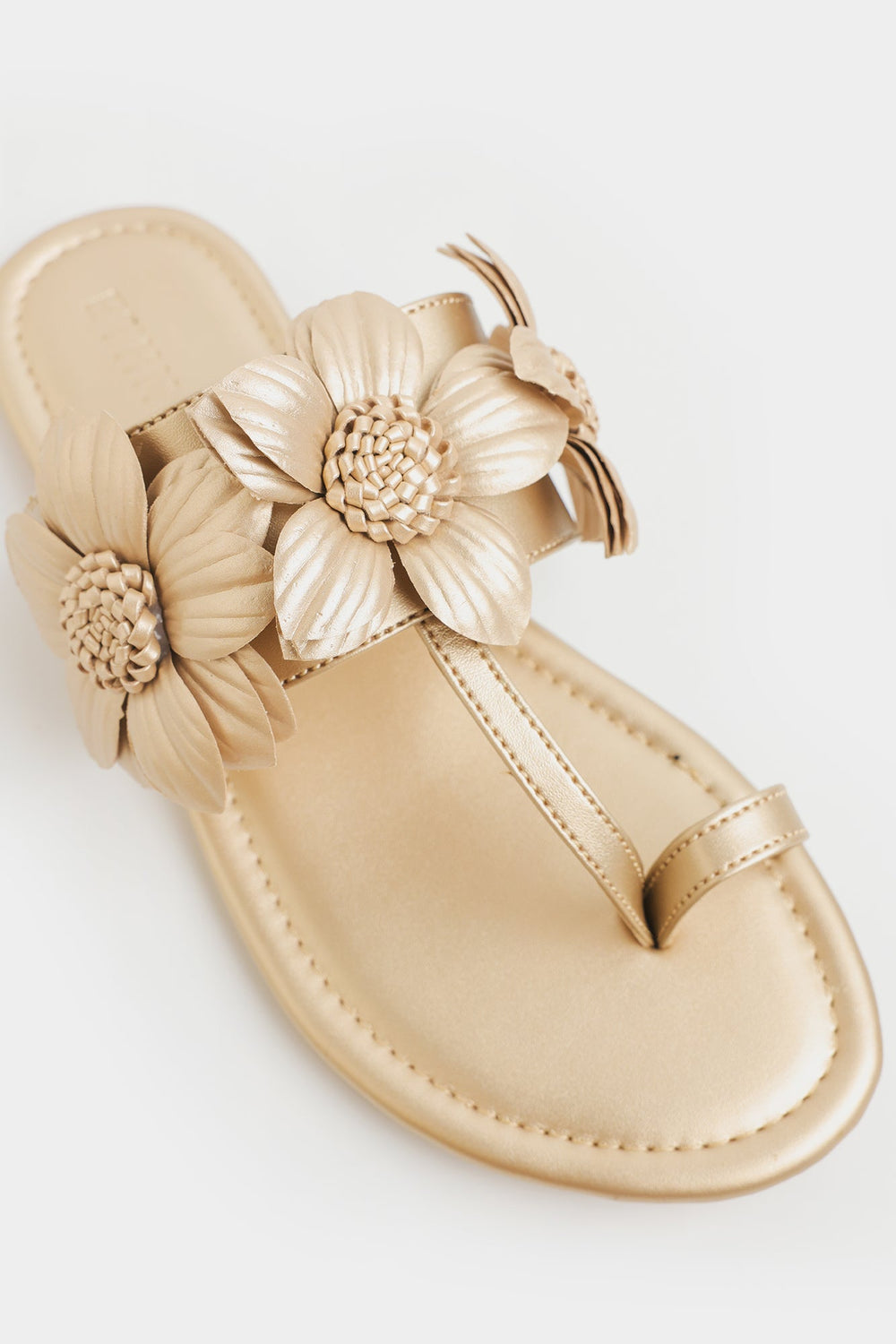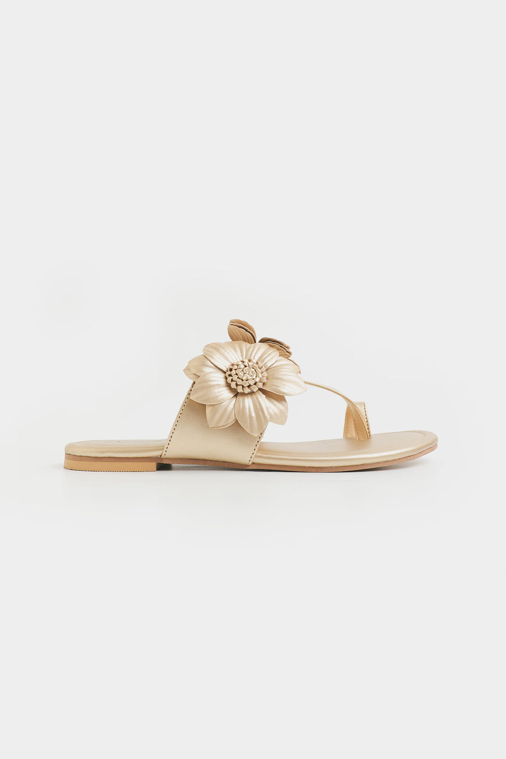 Enhance your look with our stunning khola puri, featuring floral strap design in dazzling gold color. Made with fine quality materials, this traditional khola puri will elevate any outfit. Stand out with this unique and eye-catching footwear option.