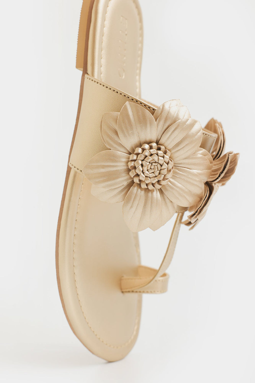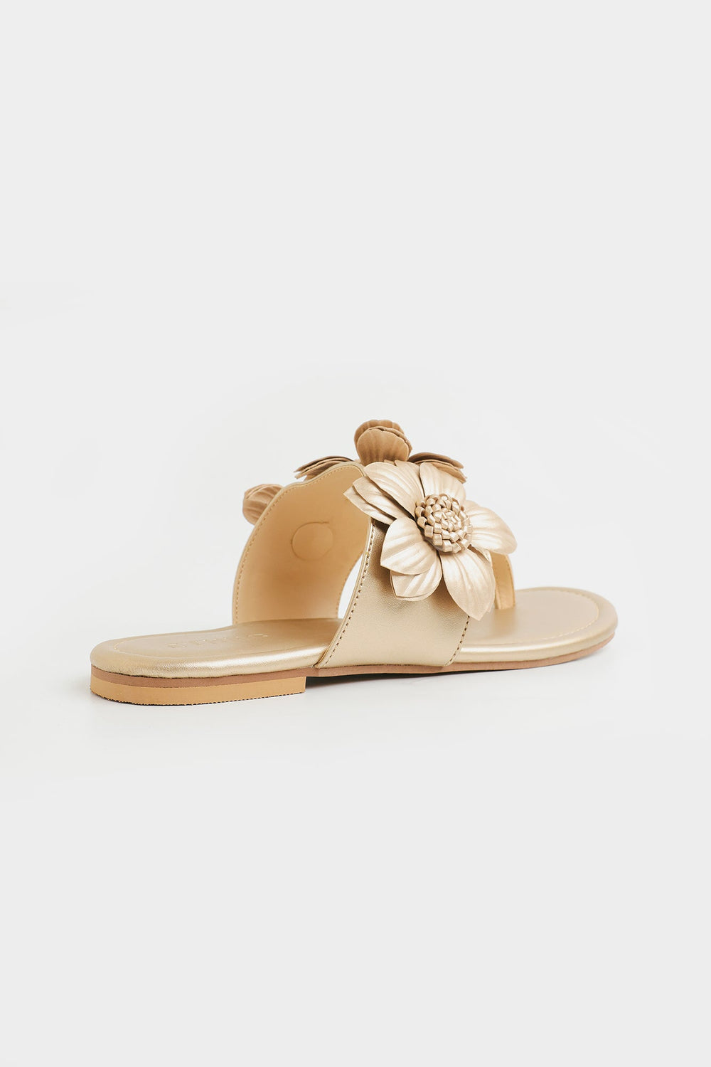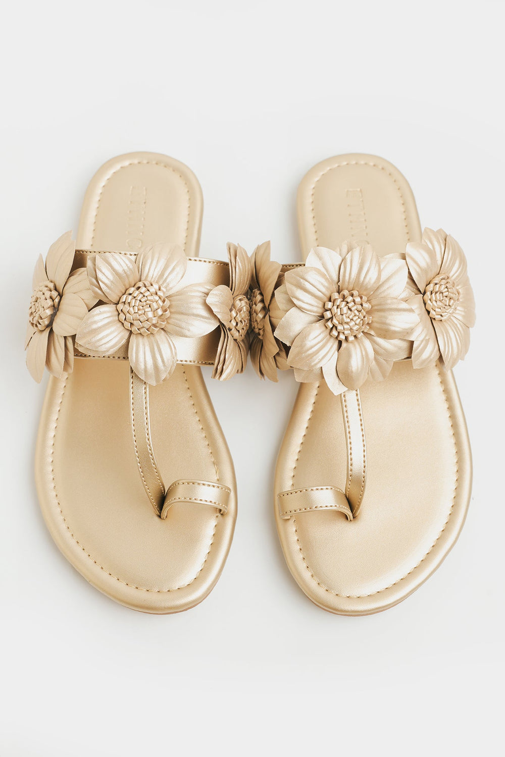 Enhance your look with our stunning khola puri, featuring floral strap design in dazzling gold color. Made with fine quality materials, this traditional khola puri will elevate any outfit. Stand out with this unique and eye-catching footwear option.