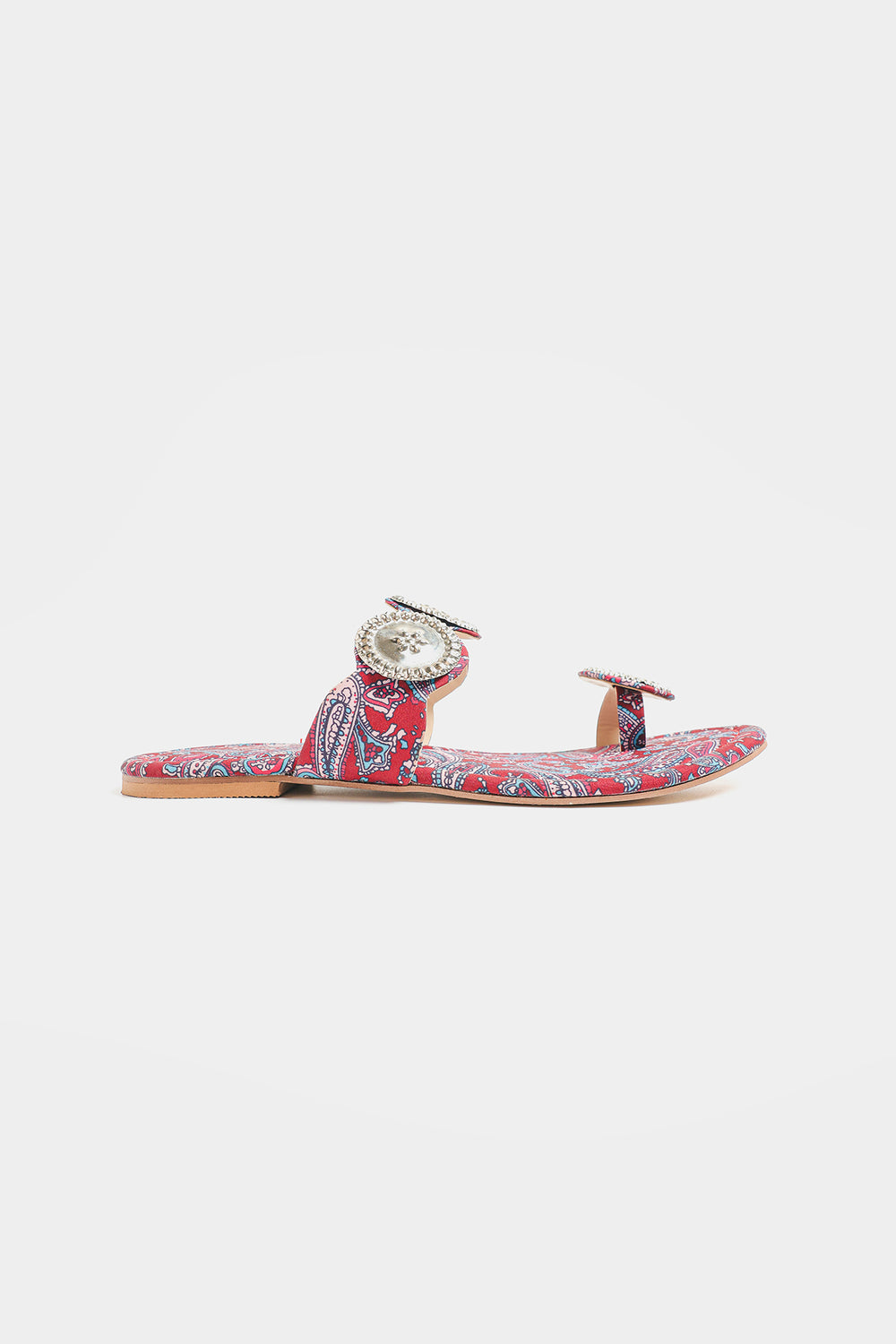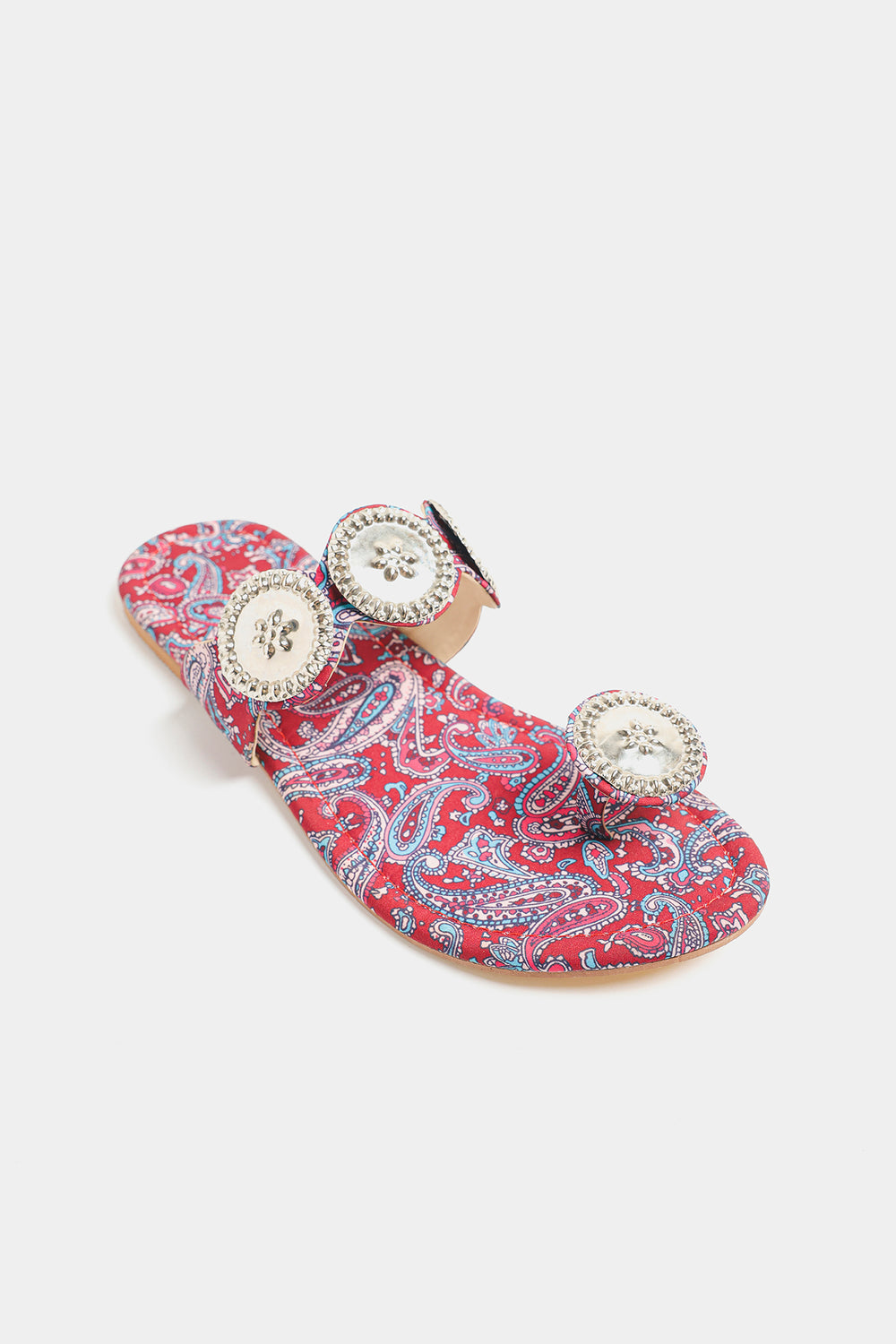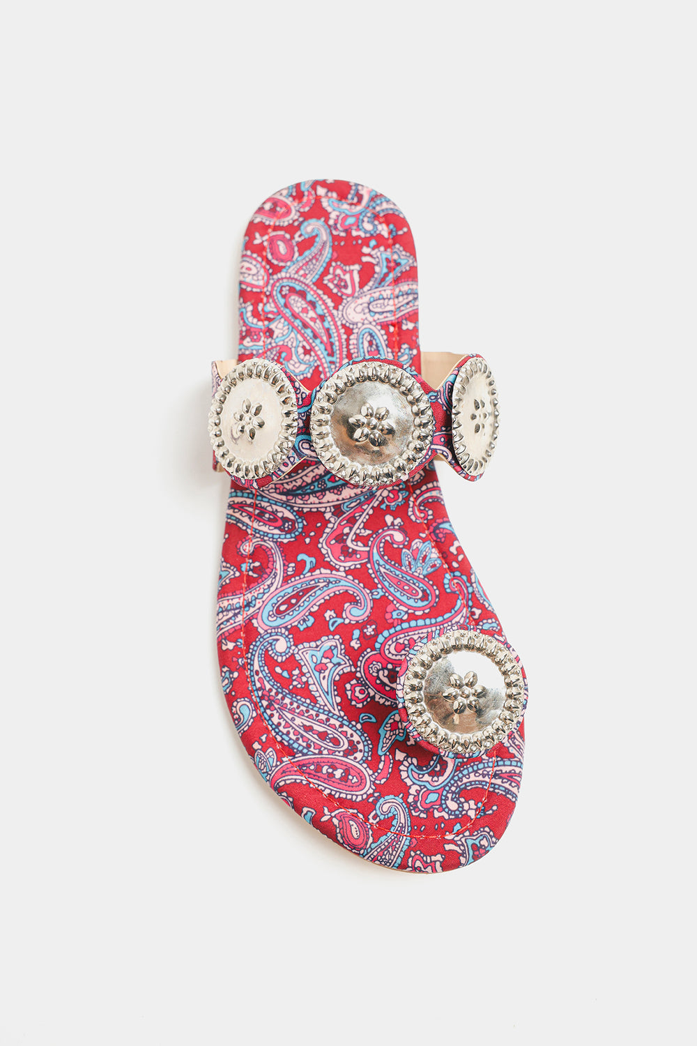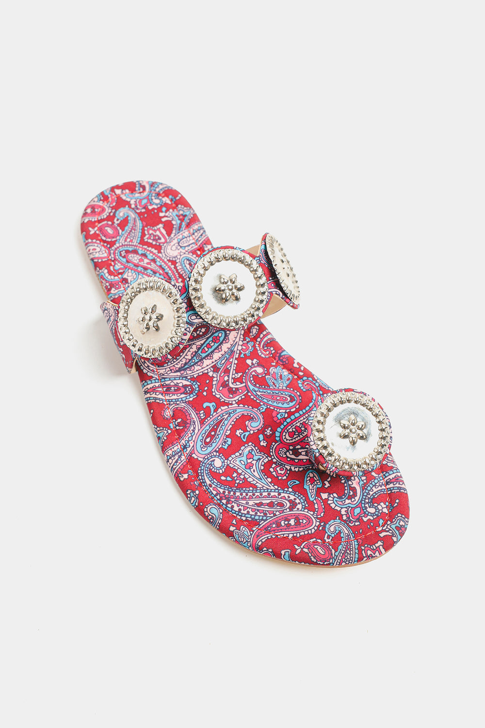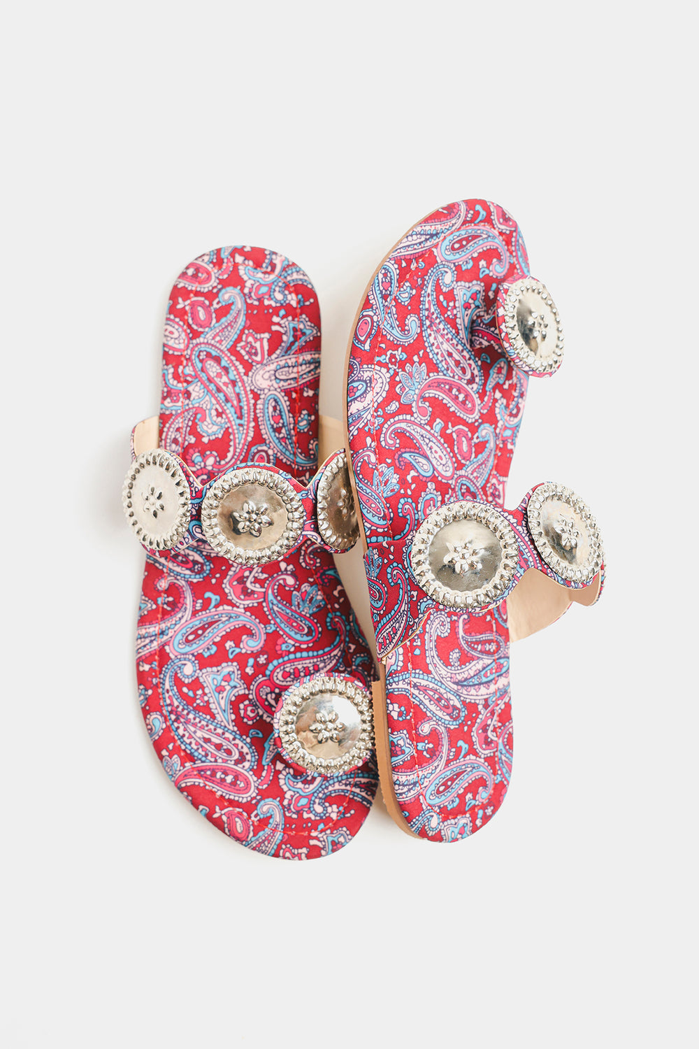 Step into rich tradition with these vibrant red printed kolhapuris. Adorned with intricate silver medallions, they offer a perfect blend of cultural heritage and contemporary style for any occasion.
