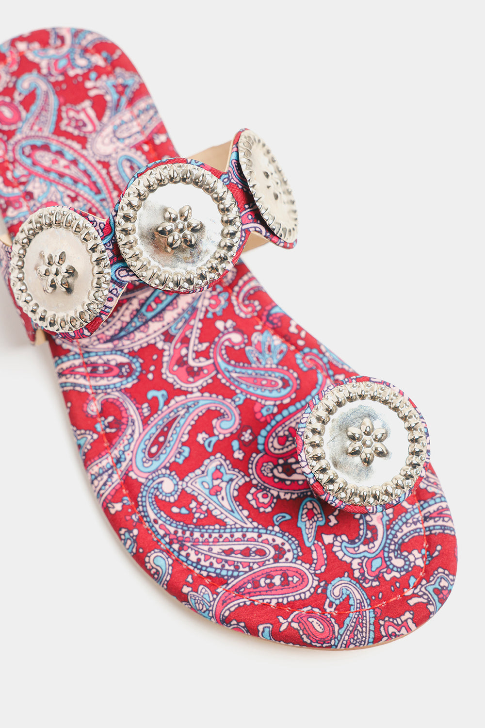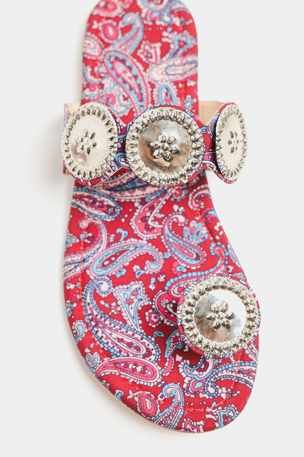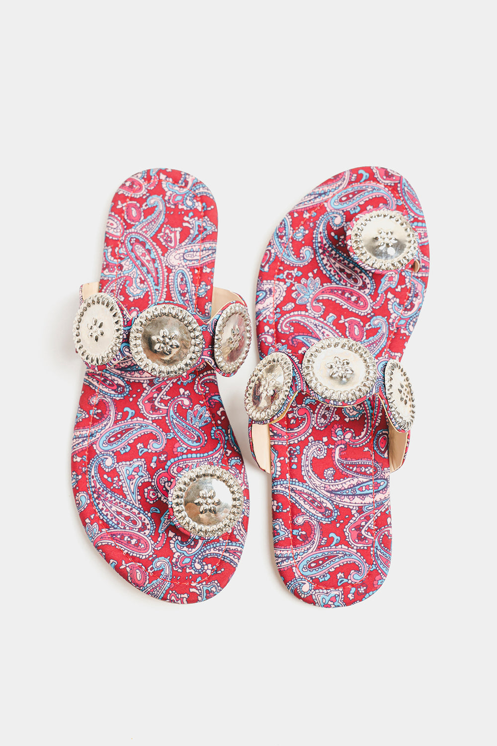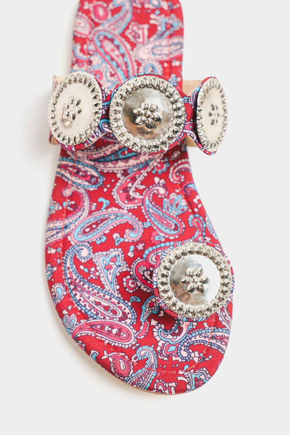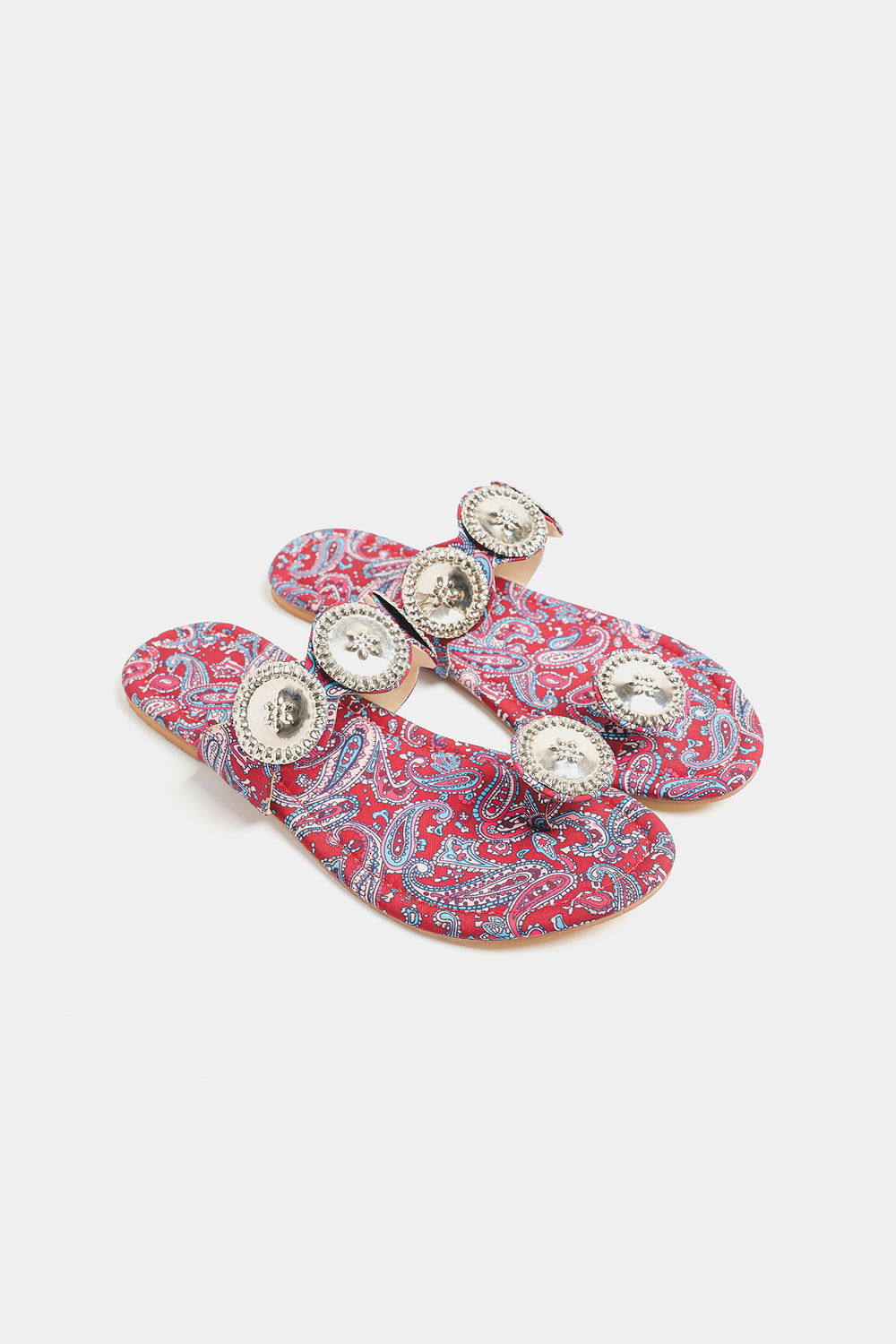 Step into rich tradition with these vibrant red printed kolhapuris. Adorned with intricate silver medallions, they offer a perfect blend of cultural heritage and contemporary style for any occasion.