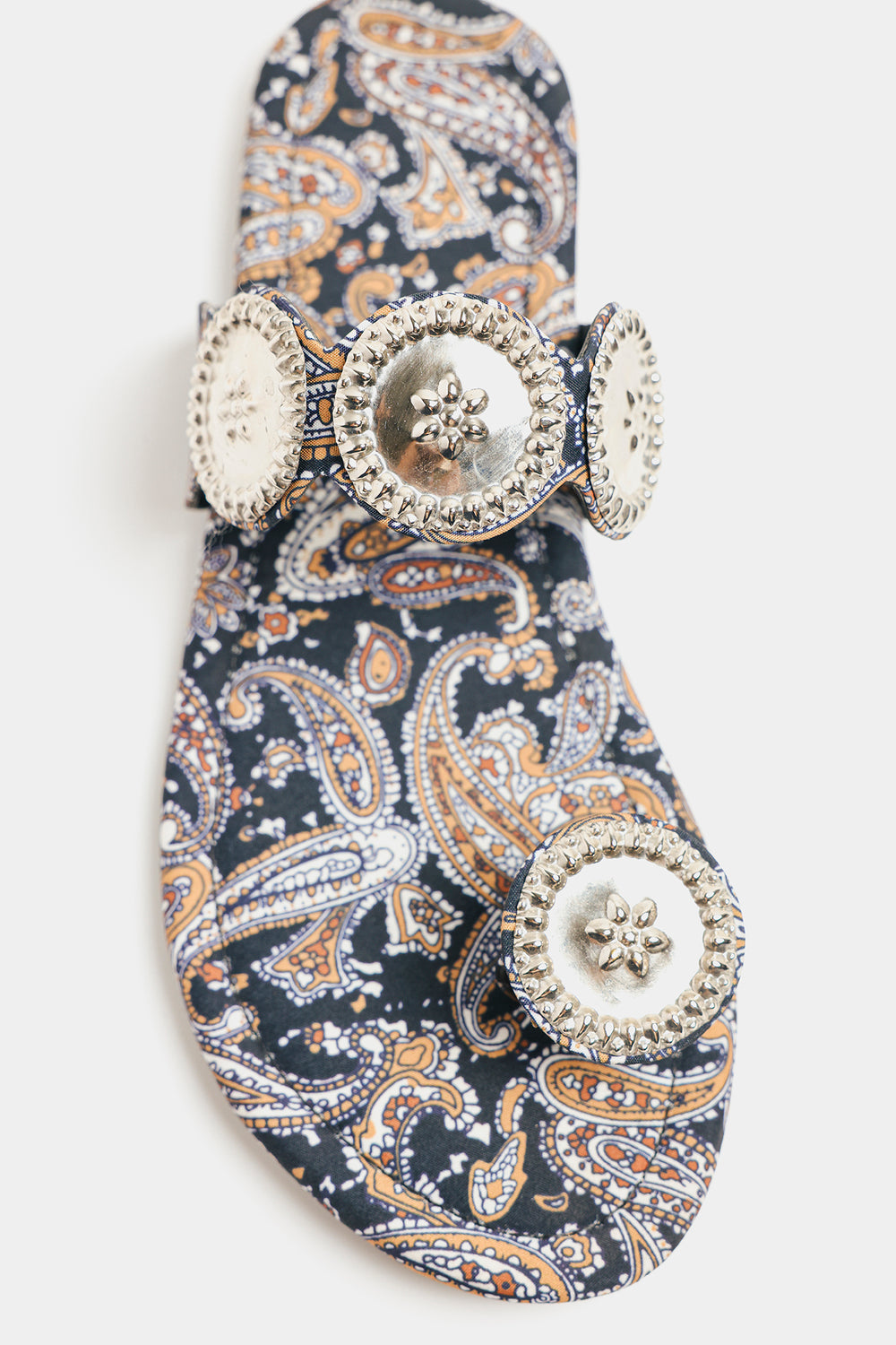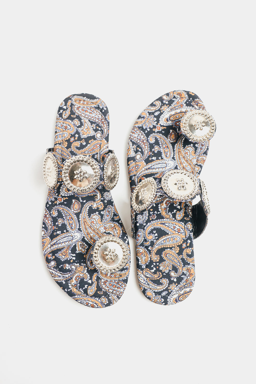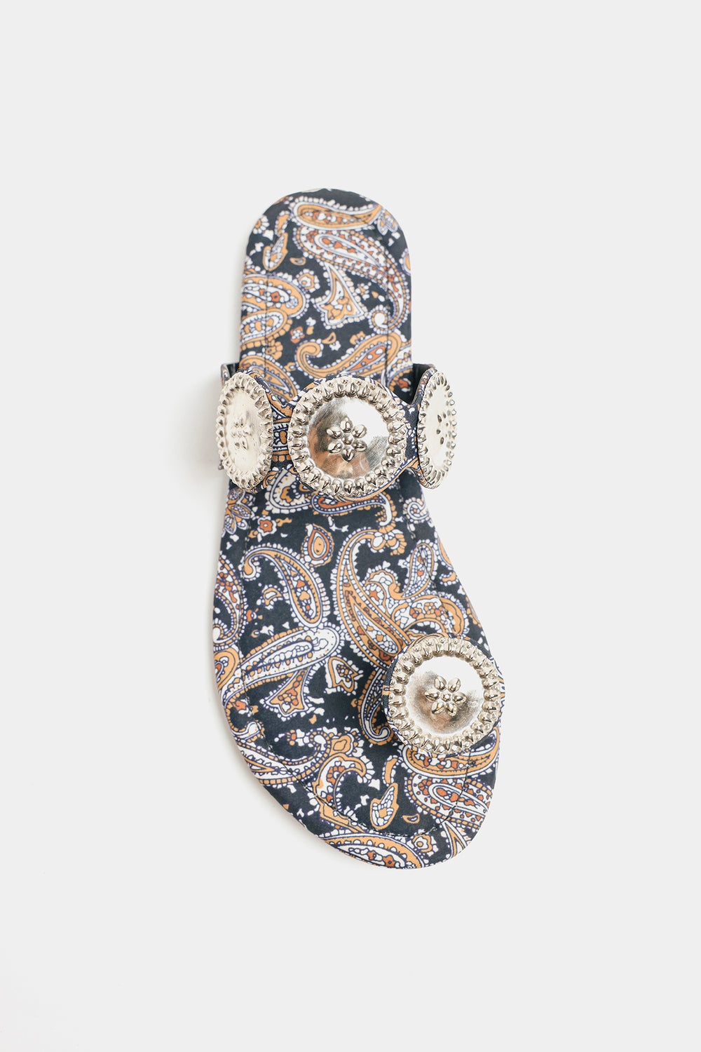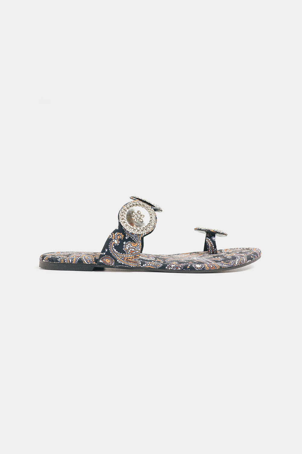 Step into rich tradition with these black printed kolhapuris. Adorned with intricate silver medallions, they offer a perfect blend of cultural heritage and contemporary style for any occasion.