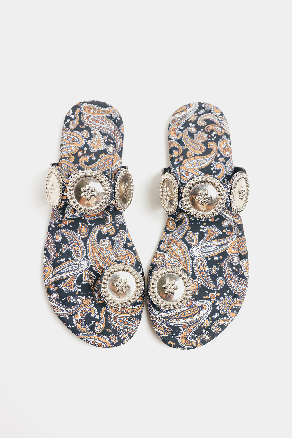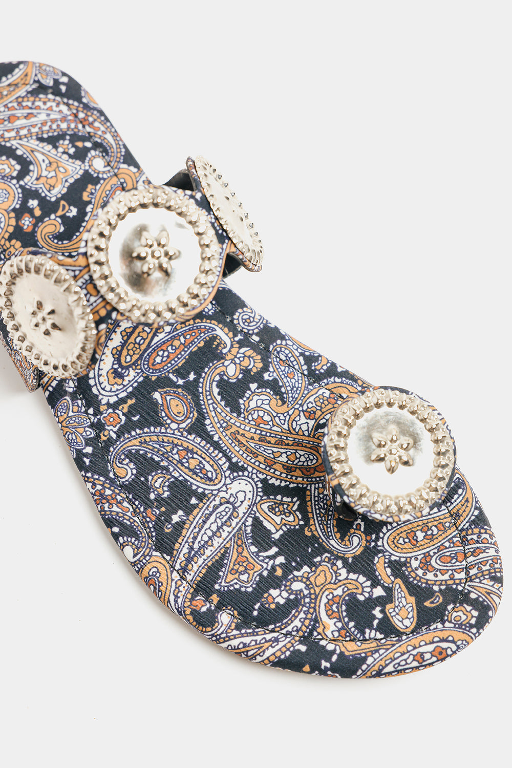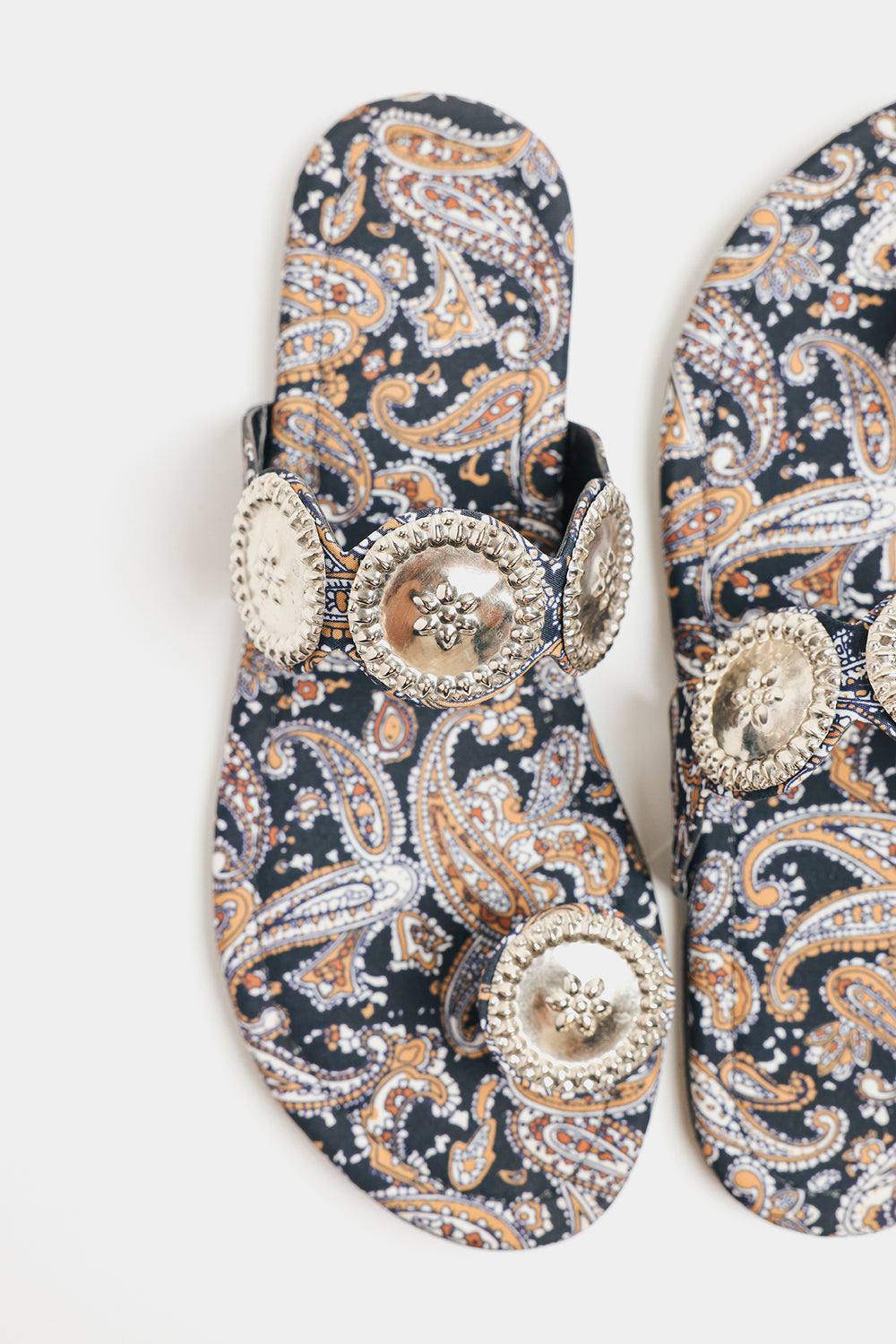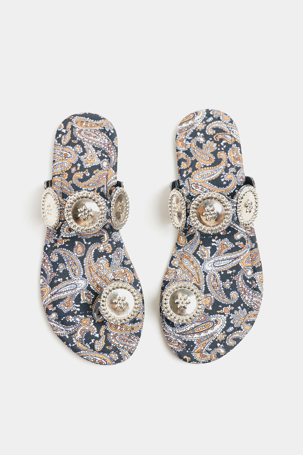 Step into rich tradition with these black printed kolhapuris. Adorned with intricate silver medallions, they offer a perfect blend of cultural heritage and contemporary style for any occasion.