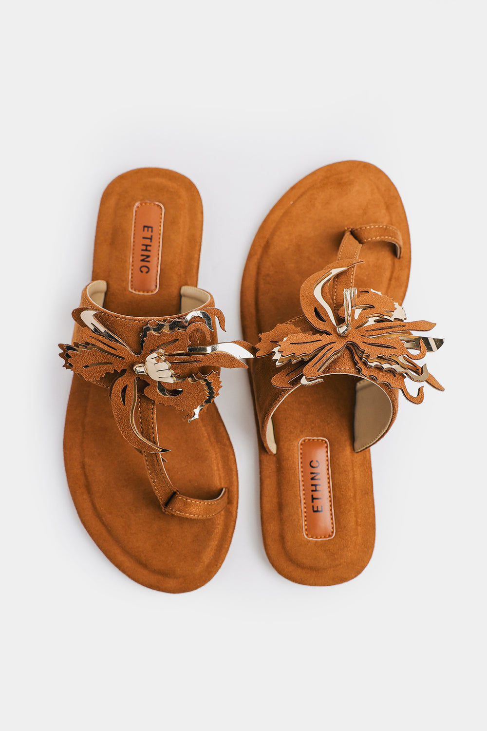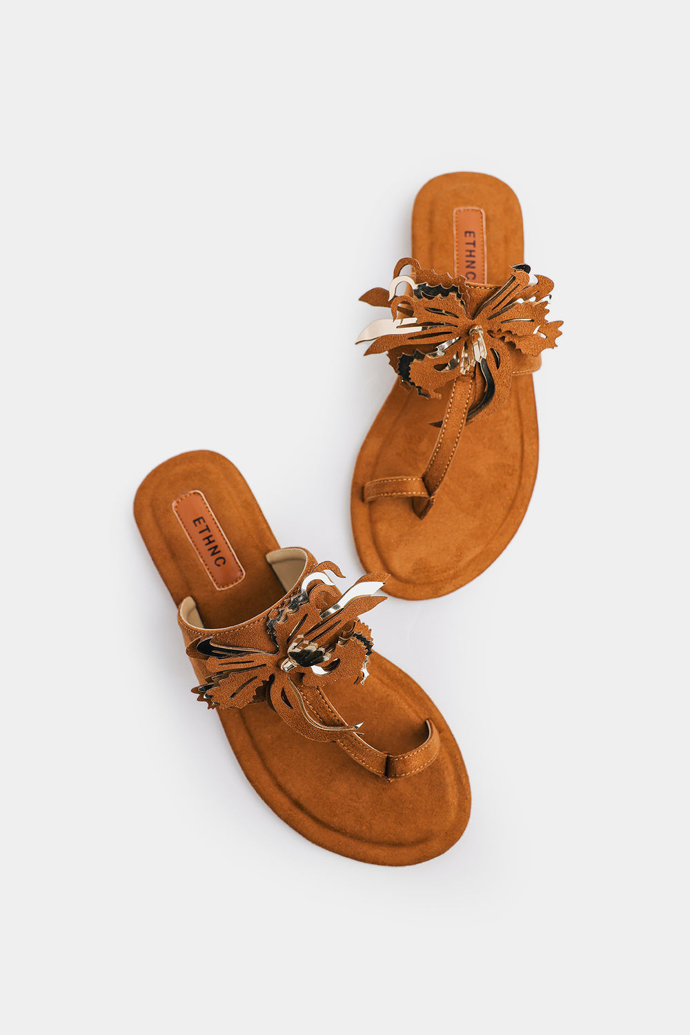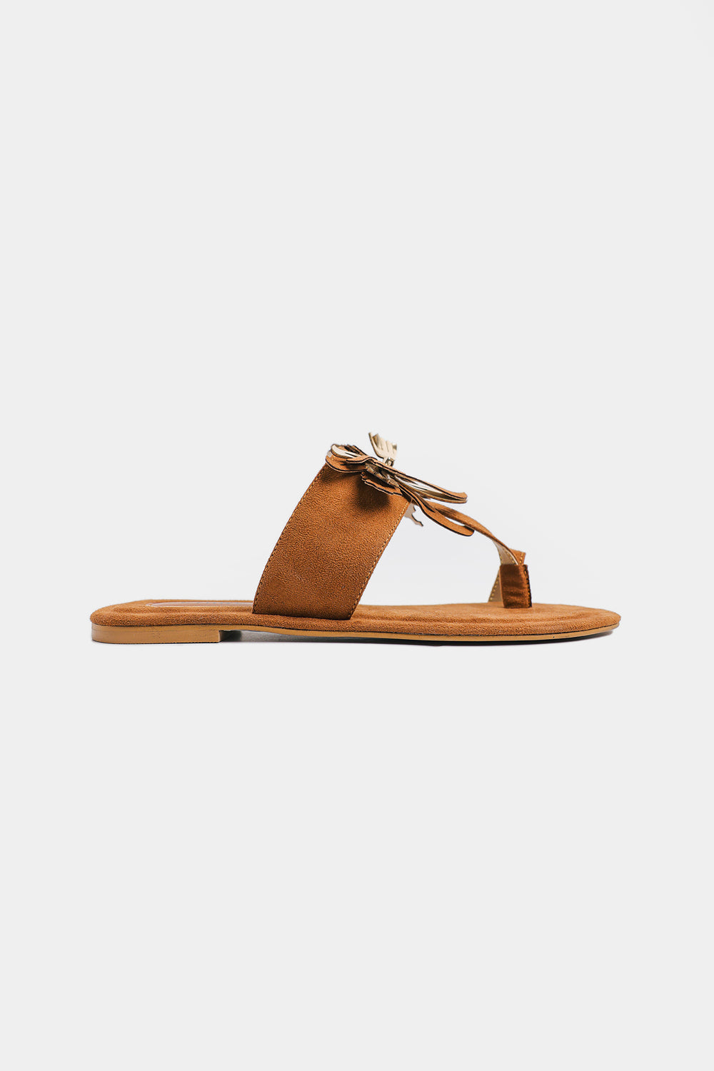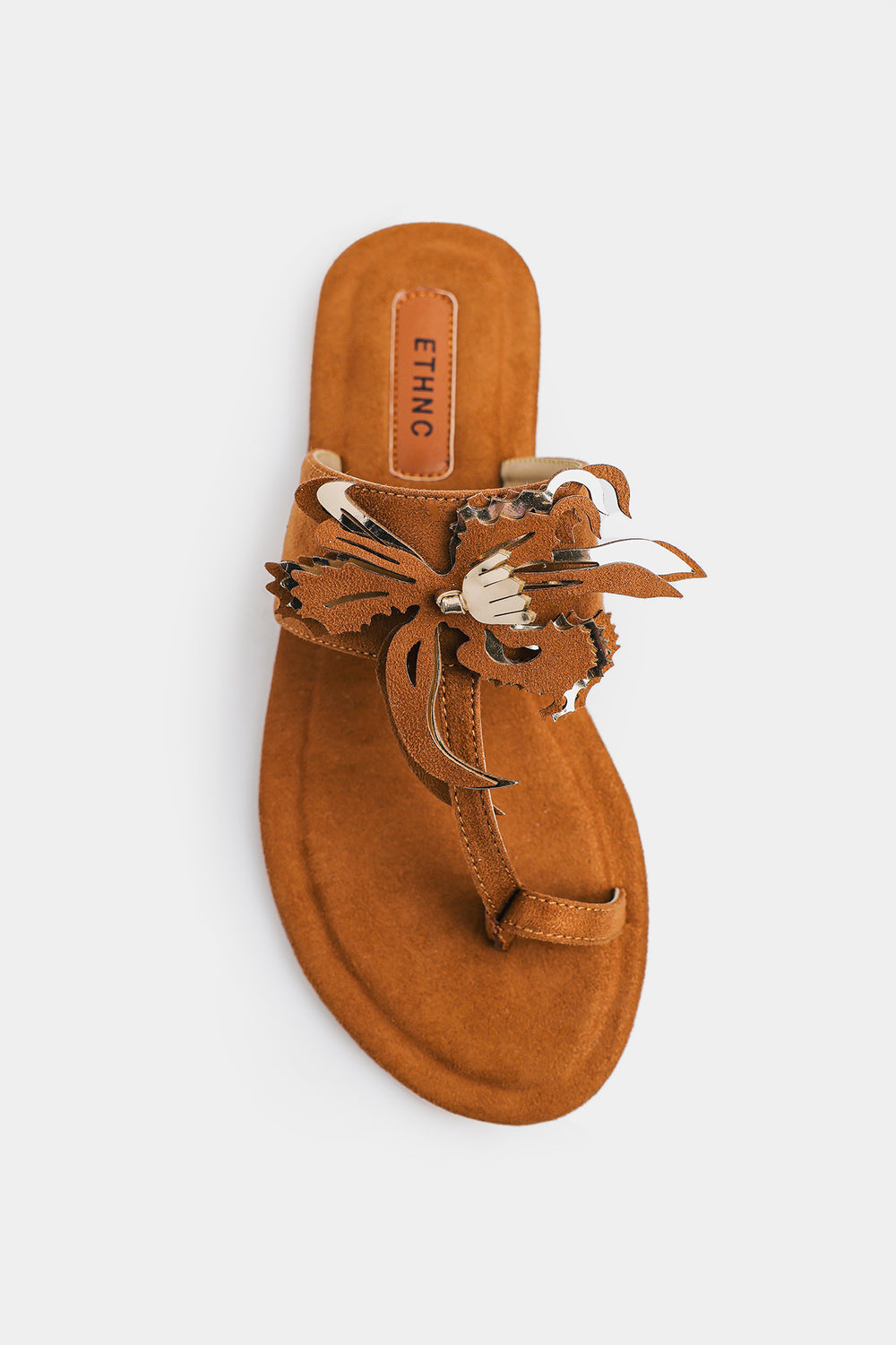 These tan Khola puri showcase Ethnic's signature bohemian aesthetic with a striking fringed floral appliqué adorning the straps—each piece bearing intricate embroidery and hand-finished details that celebrate traditional craftsmanship. The soft microfiber footbed provides gentle support, while the secure toe-loop design ensures stability throughout your day. Versatile enough to complement casual summer ensembles or pair seamlessly with traditional Eastern wear, these sandals deliver effortless style with authentic character.