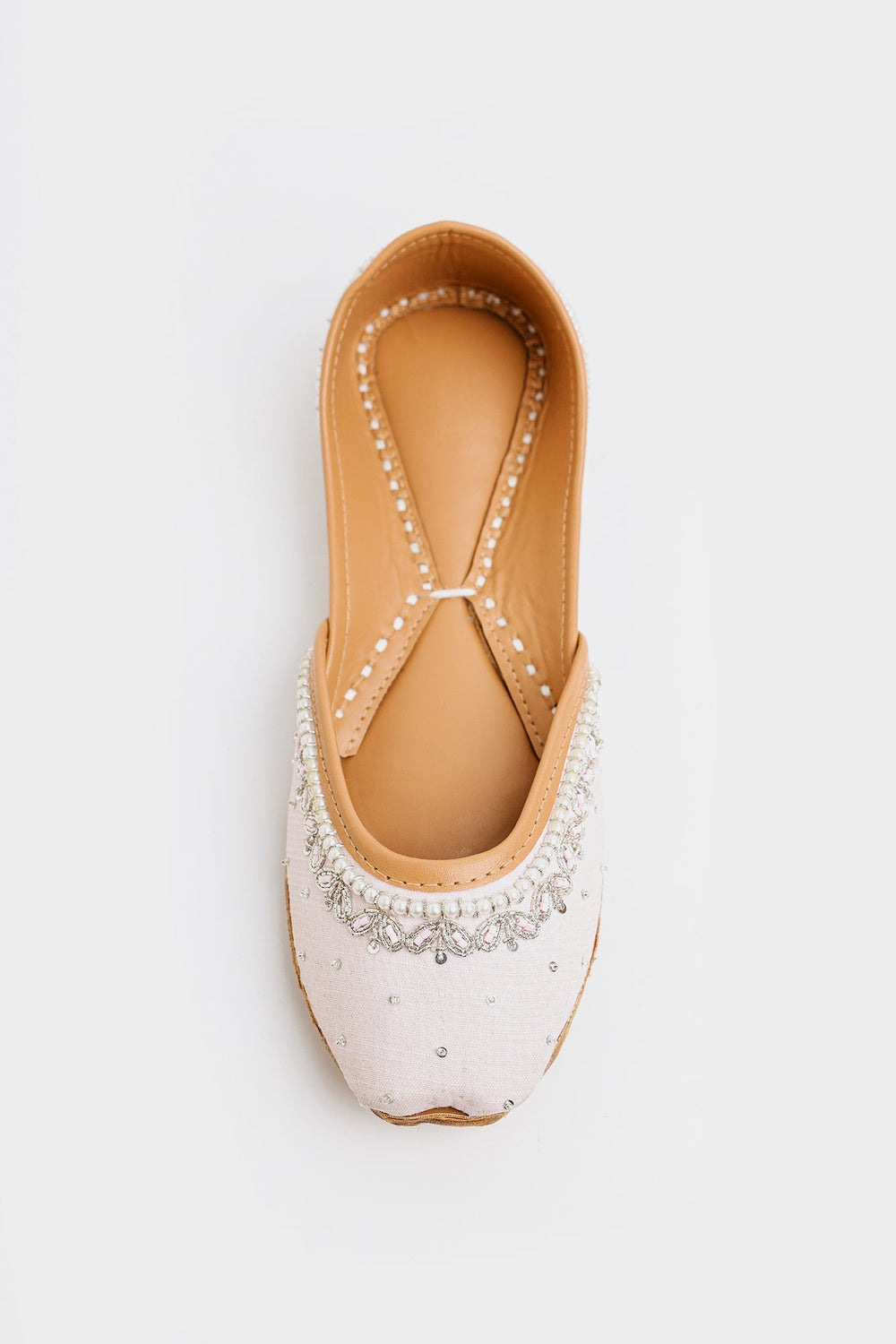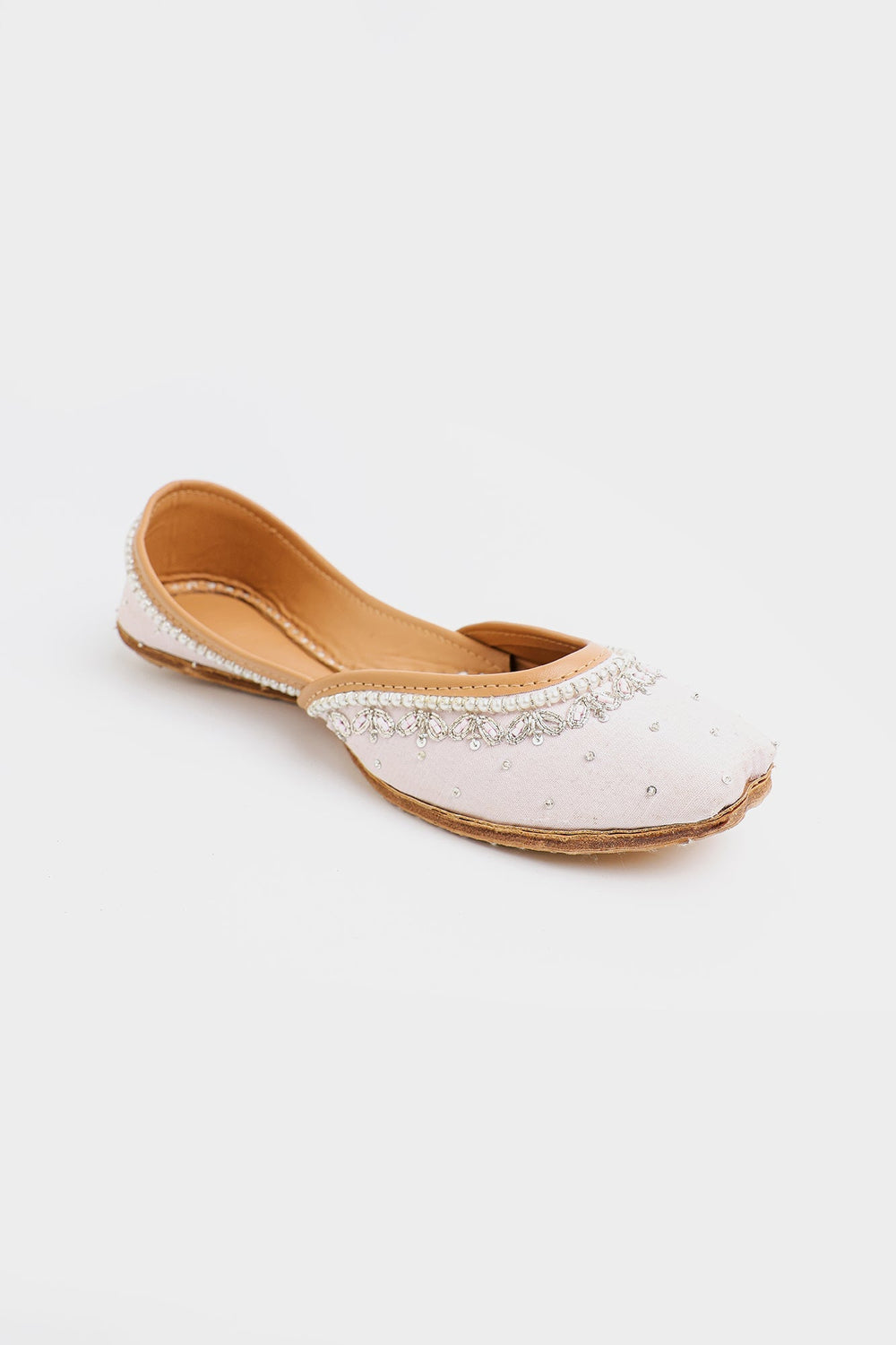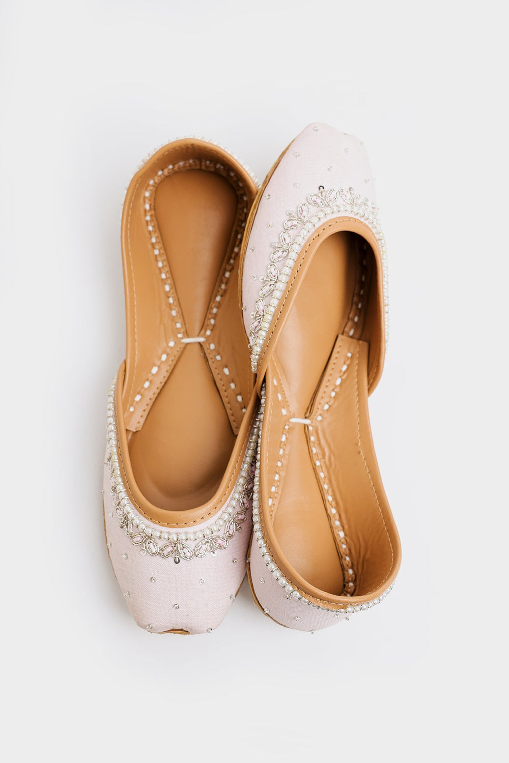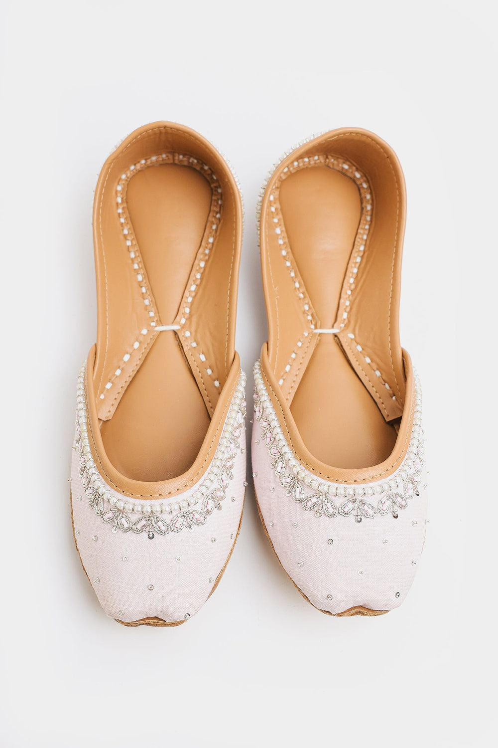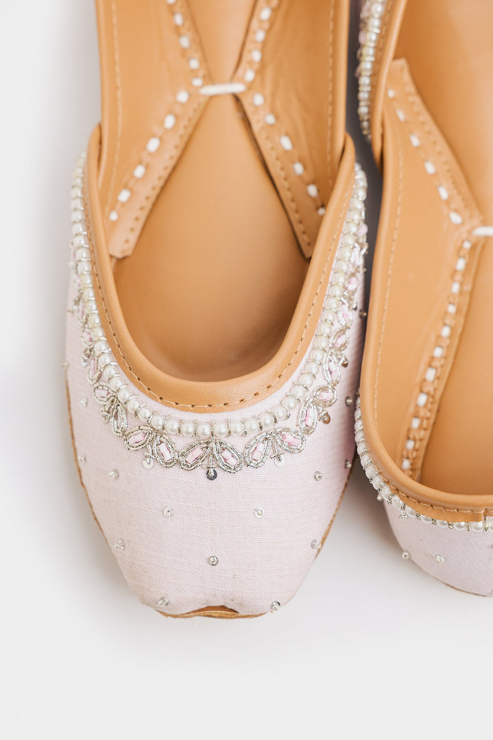 This khussa feature a light pink fabric base adorned with delicate beadwork and sequins, creating a shimmering, decorative pattern across the upper edges. The embellishments add a festive and elegant touch, making them suitable for special occasions or traditional outfits.