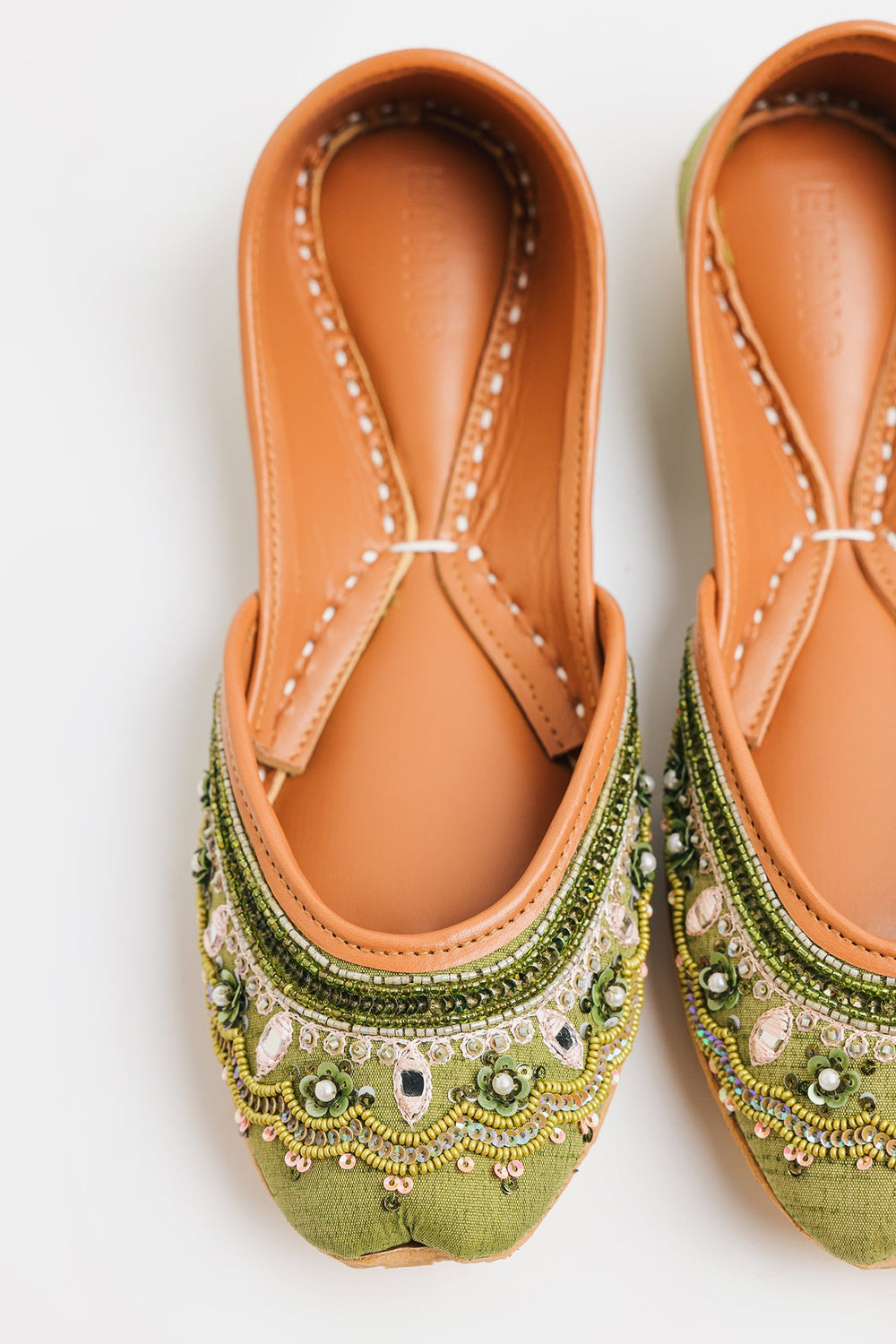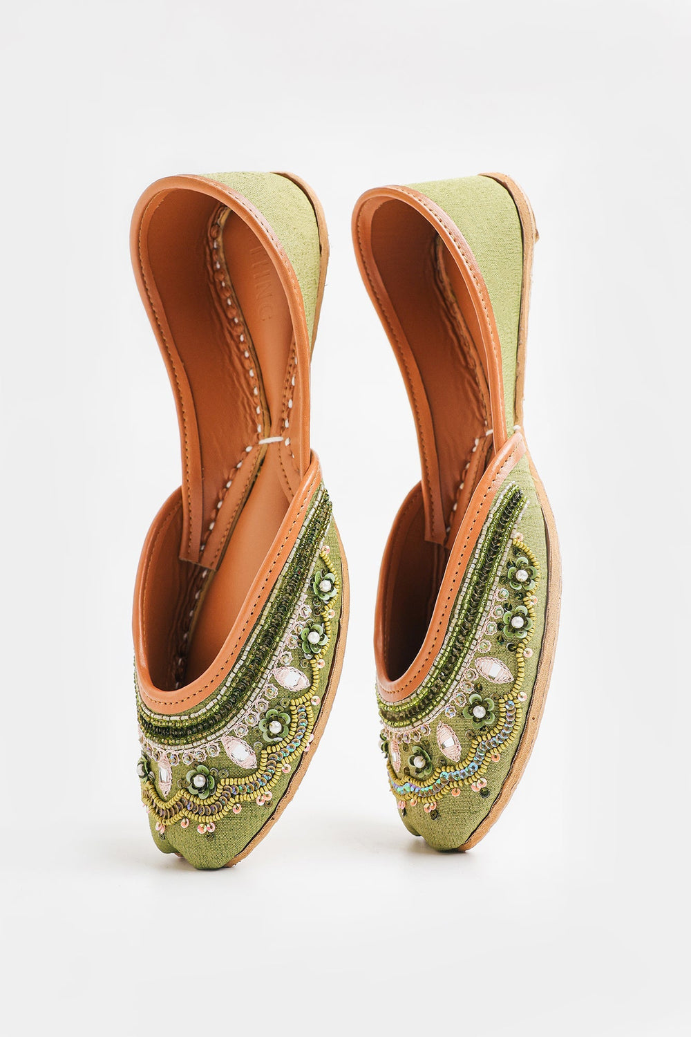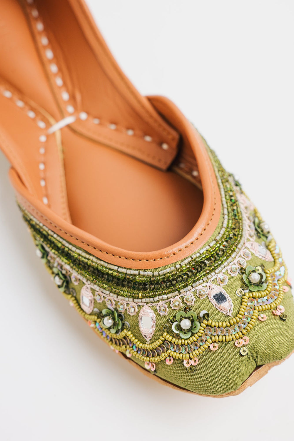 This mid-olive Khussa showcases exquisite craftsmanship with detailed embroidery, meticulous beadwork, and traditional mirror embellishments. This khussa offers both cultural authenticity and refined comfort. Perfect for elevating ethnic ensembles with its subtle olive hue and intricate detailing.