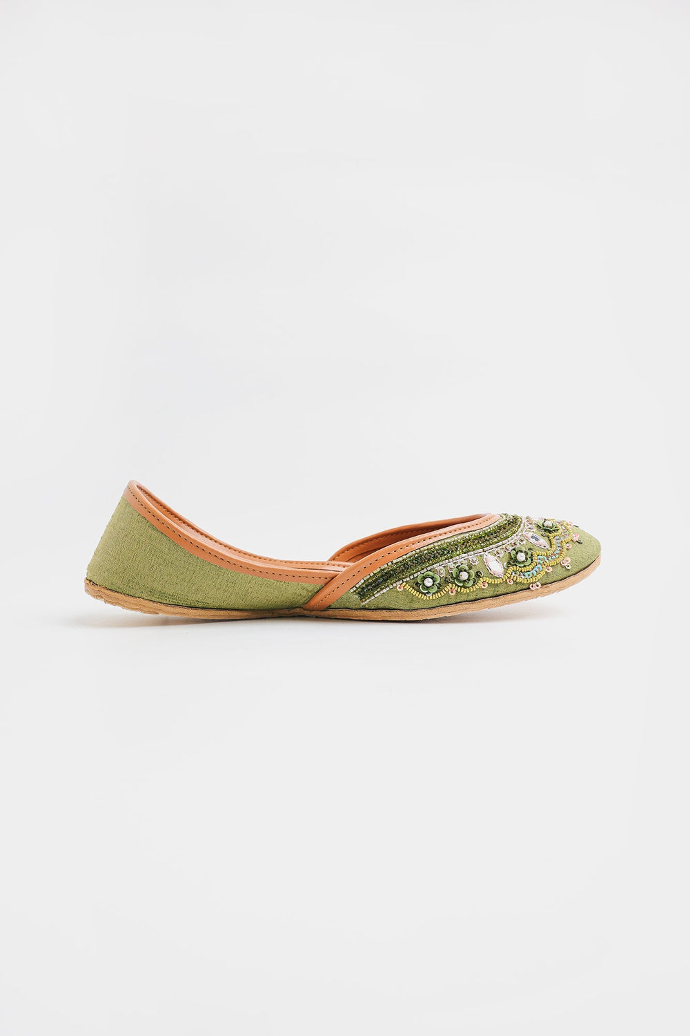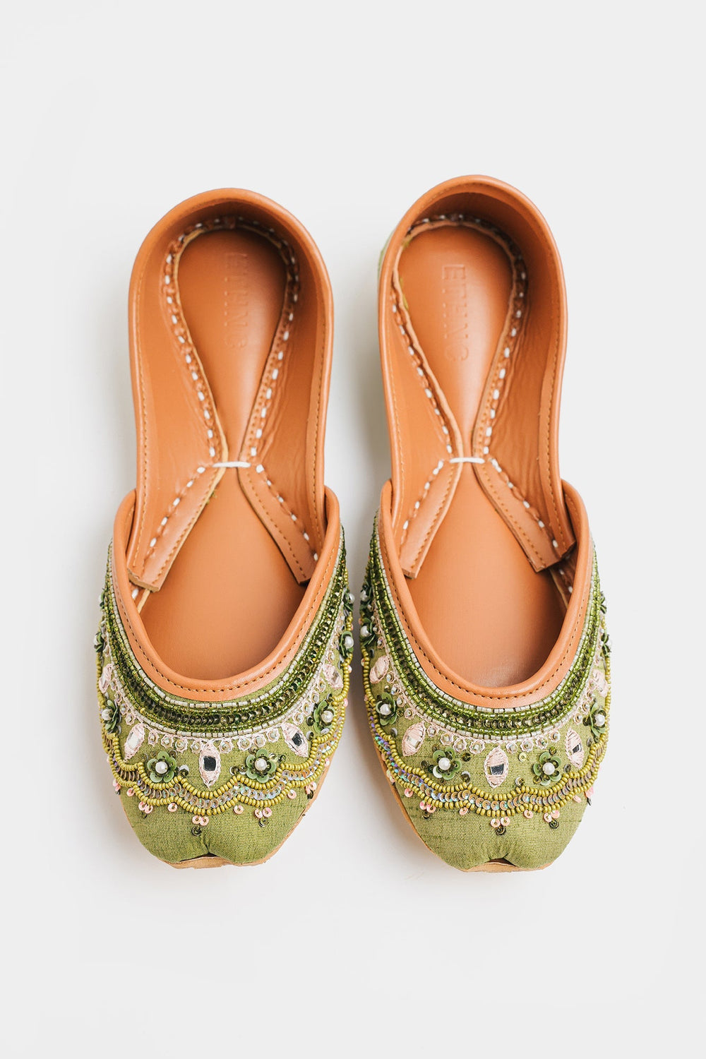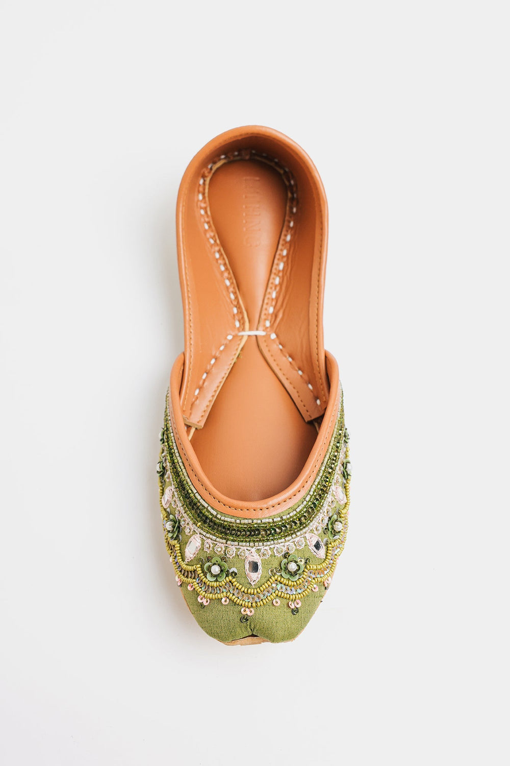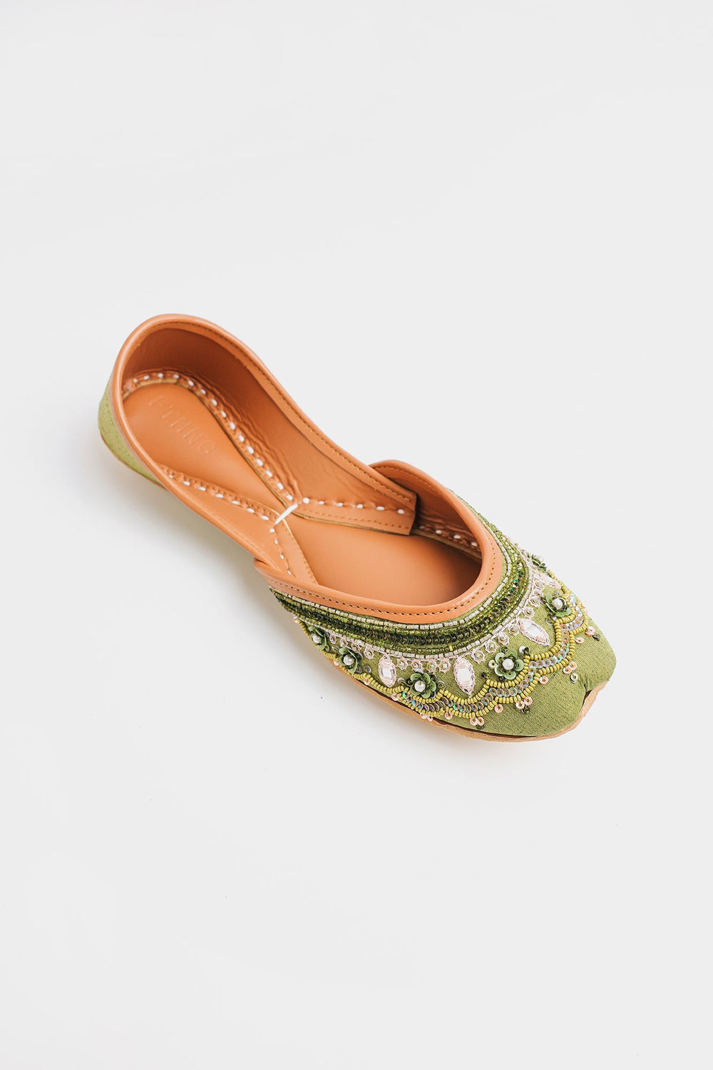 This mid-olive Khussa showcases exquisite craftsmanship with detailed embroidery, meticulous beadwork, and traditional mirror embellishments. This khussa offers both cultural authenticity and refined comfort. Perfect for elevating ethnic ensembles with its subtle olive hue and intricate detailing.