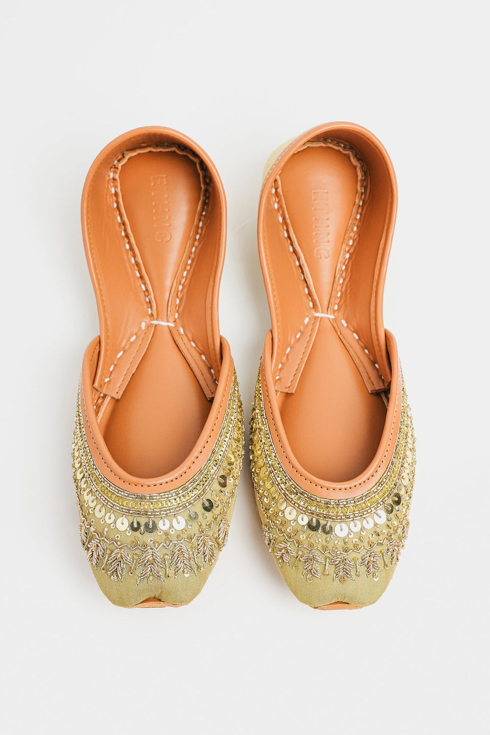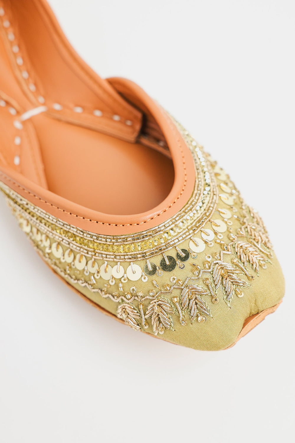 These exquisite khussas are a celebration of traditional craftsmanship and modern elegance. The warm, earthy tone of the leather provides a beautiful contrast to the shimmering gold and silver sequin work and delicate embroidery on the front. Meticulously handcrafted, each pair features a comfortable fit with a cushioned insole, making them perfect for all-day wear. Whether you're attending a festive celebration or simply elevating a casual outfit, these stunning khussas add a touch of sparkle and sophistication to your look.