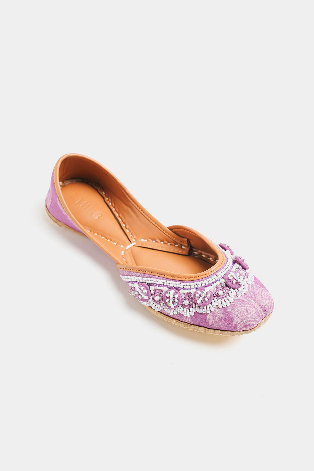 Discover regal charm with these stunning pink khussas. Embellished with intricate white bead and sequin work, they are perfect for adding a majestic touch to your traditional attire.