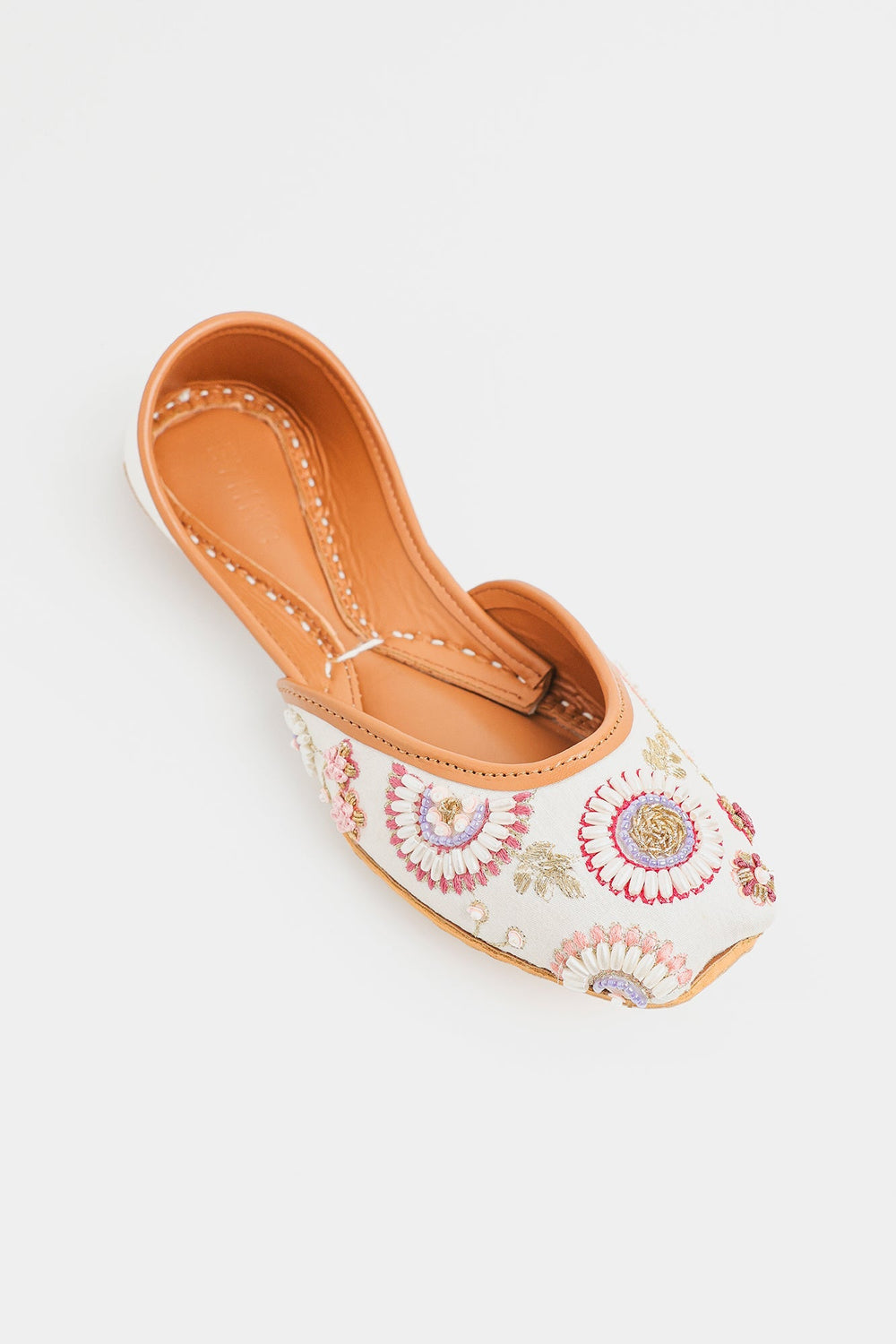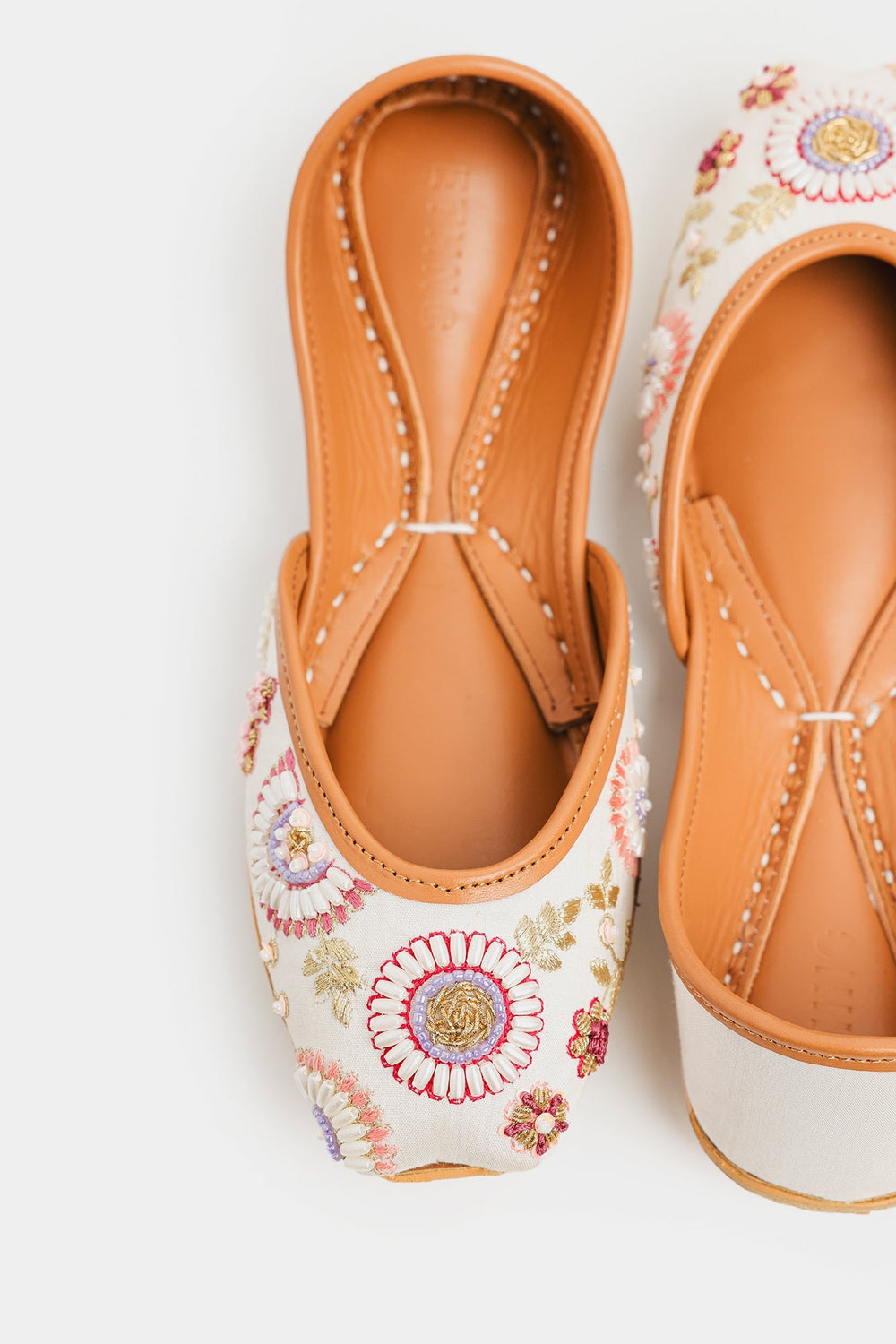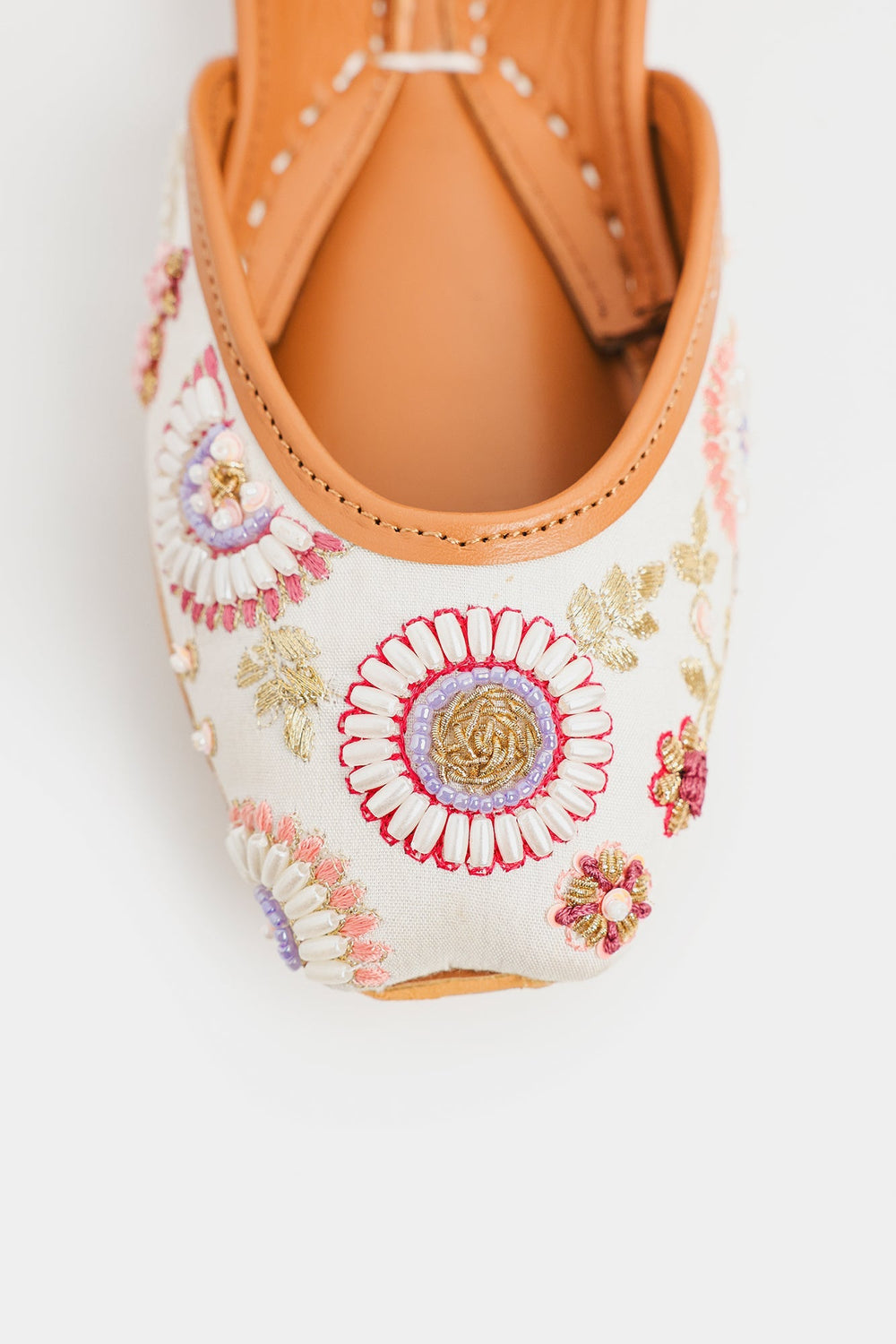 These delightful khussas feature a off white base, serving as the perfect canvas for a whimsical floral pattern. The embroidered flowers are brought to life with a delicate mix of threads in soft pinks, reds, and purples, along with subtle beads and sequins that add a gentle shimmer. The traditional tan leather lining and comfortable insole ensure that these shoes are as pleasant to wear as they are to look at. Perfect for adding a fresh, elegant touch to any festive or casual look, these khussas are a true celebration of detailed artistry.
