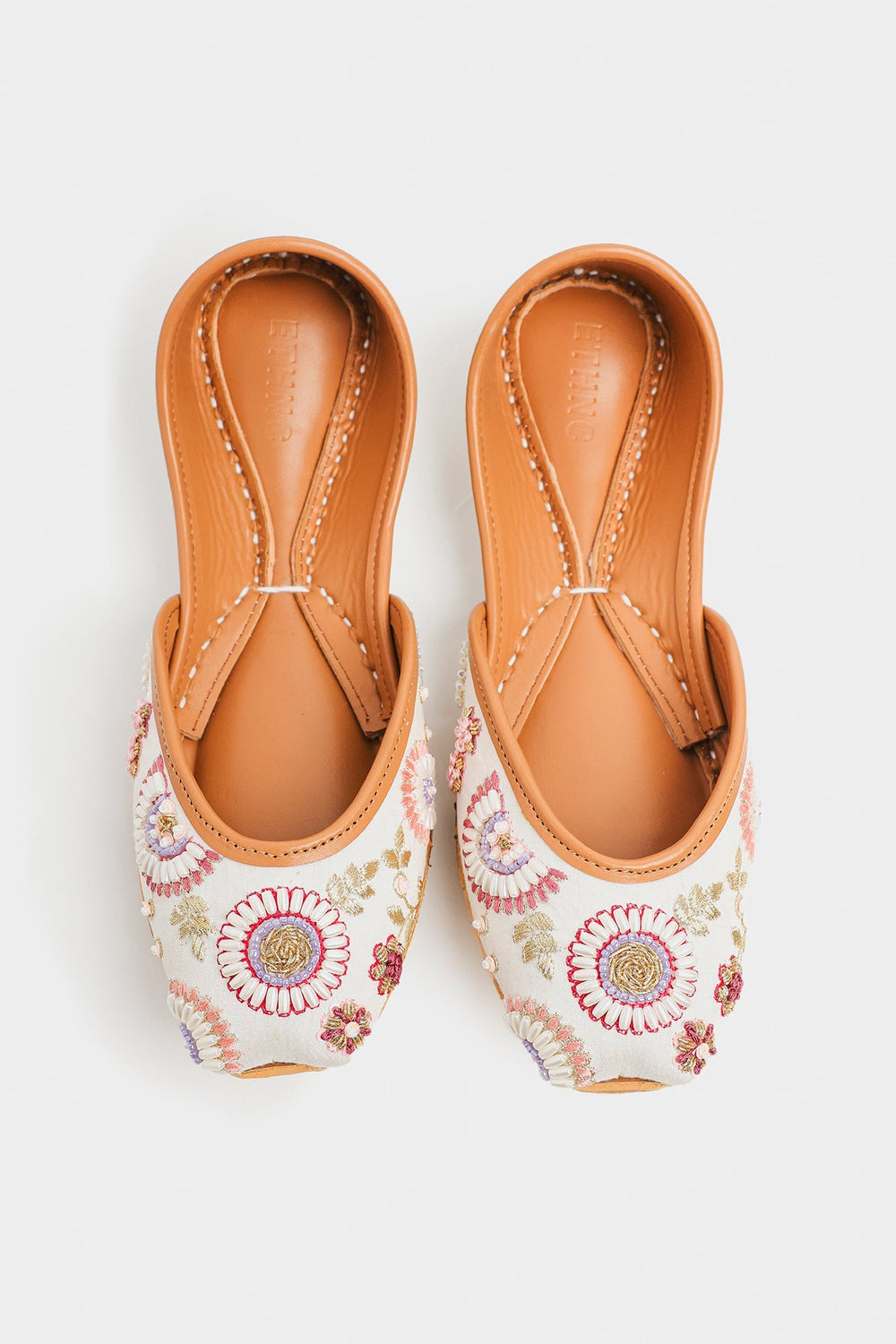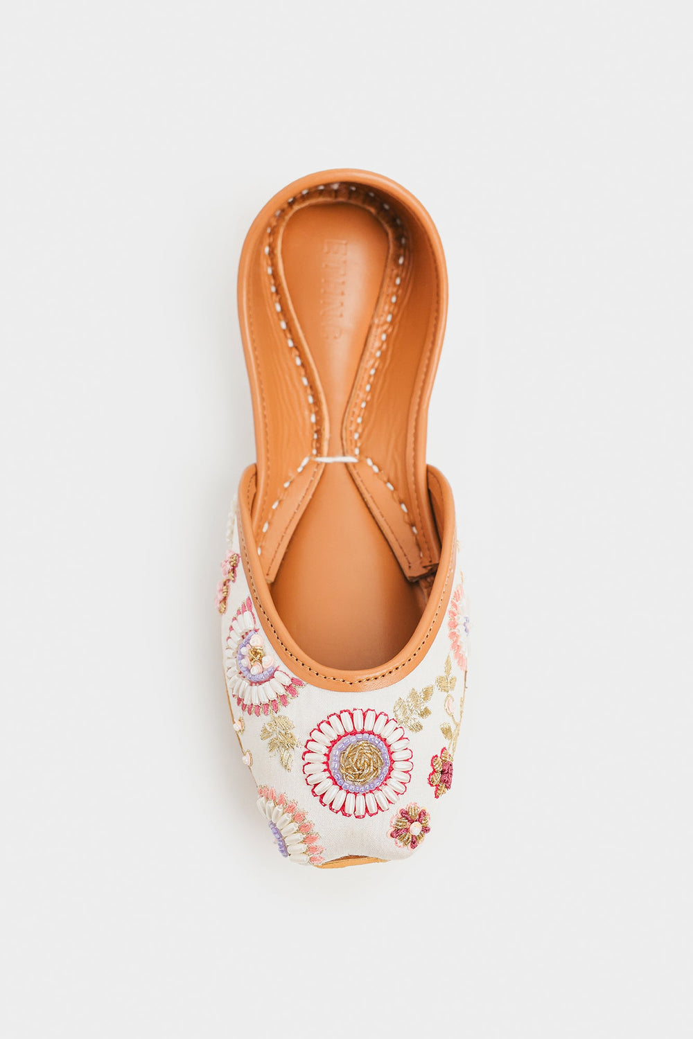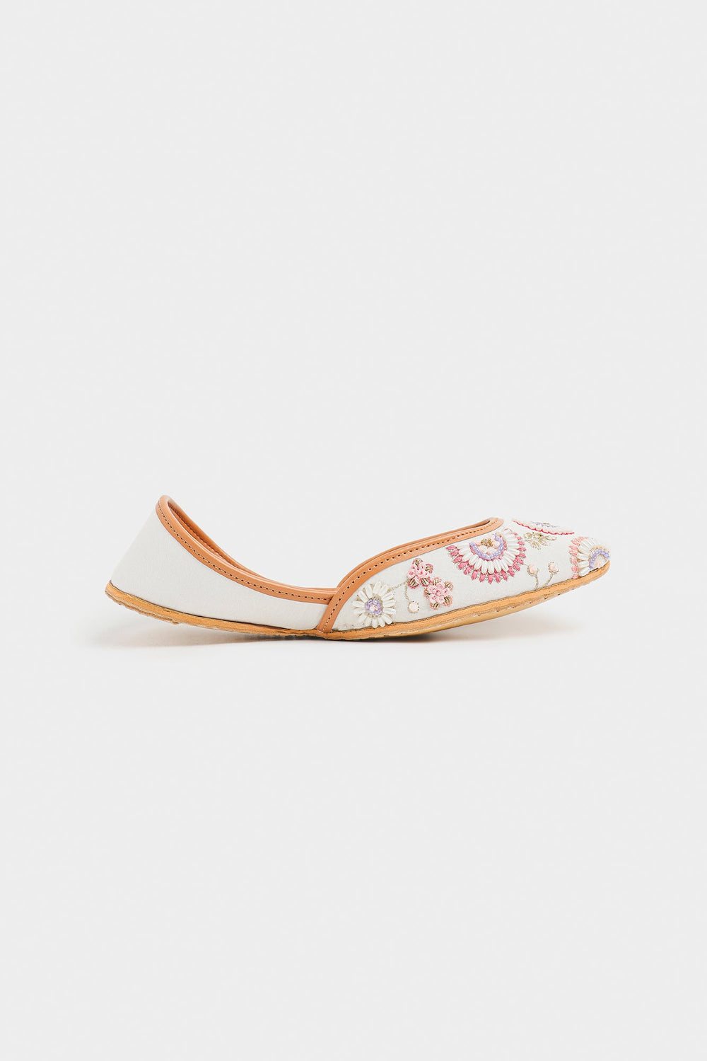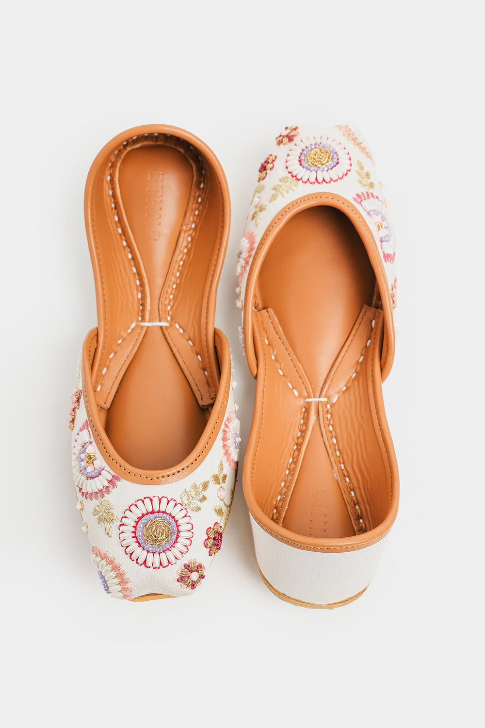 These delightful khussas feature a off white base, serving as the perfect canvas for a whimsical floral pattern. The embroidered flowers are brought to life with a delicate mix of threads in soft pinks, reds, and purples, along with subtle beads and sequins that add a gentle shimmer. The traditional tan leather lining and comfortable insole ensure that these shoes are as pleasant to wear as they are to look at. Perfect for adding a fresh, elegant touch to any festive or casual look, these khussas are a true celebration of detailed artistry.