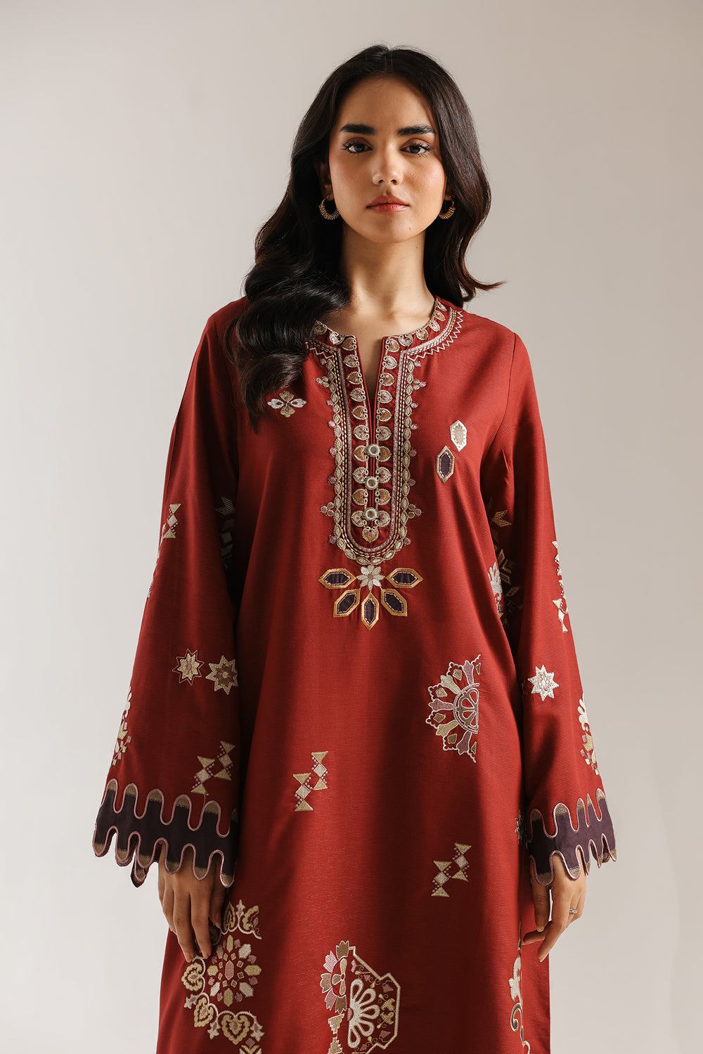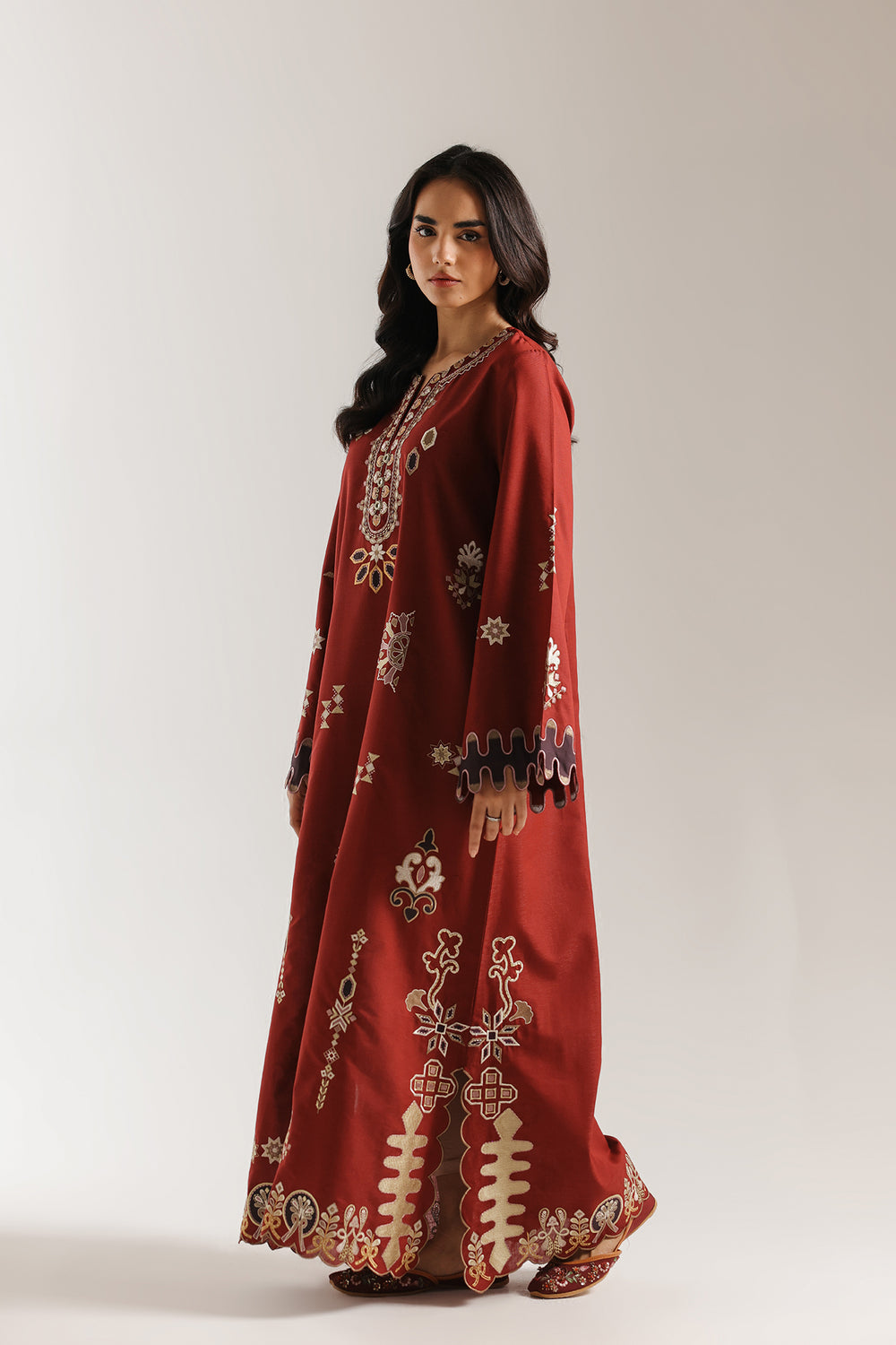This regal, floor-length dress is rendered in a deep maroon hue, offering a sophisticated and festive silhouette. The garment features an elegant split neckline and voluminous bell sleeves, both intricately detailed with traditional geometric and floral embroidery in shades of ivory, gold, and charcoal. Intricate artisanal motifs are scattered across the body of the dress, leading down to a heavily embroidered, scalloped hemline that adds a refined, structural finish to the smooth fabric.