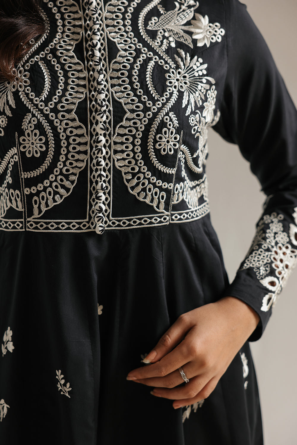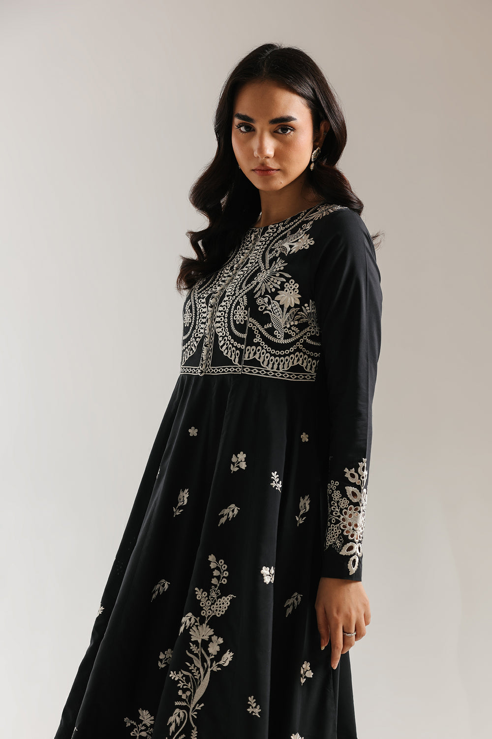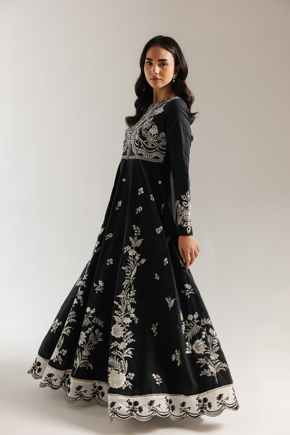 Make a romantic and artisanal statement with this jet-black one-piece dress, featuring a longline straight-cut silhouette and delicate multi-colored embroidery. The design is centered around a split V-neckline with a shimmering white beaded border, leading into a scattered array of floral sprigs and whimsical heart-shaped motifs in soft shades of rose pink, sage green, and cream. This intricate needlework continues onto the wide, long sleeves and across the lower half of the garment, which is finished with a charming scalloped hemline.
