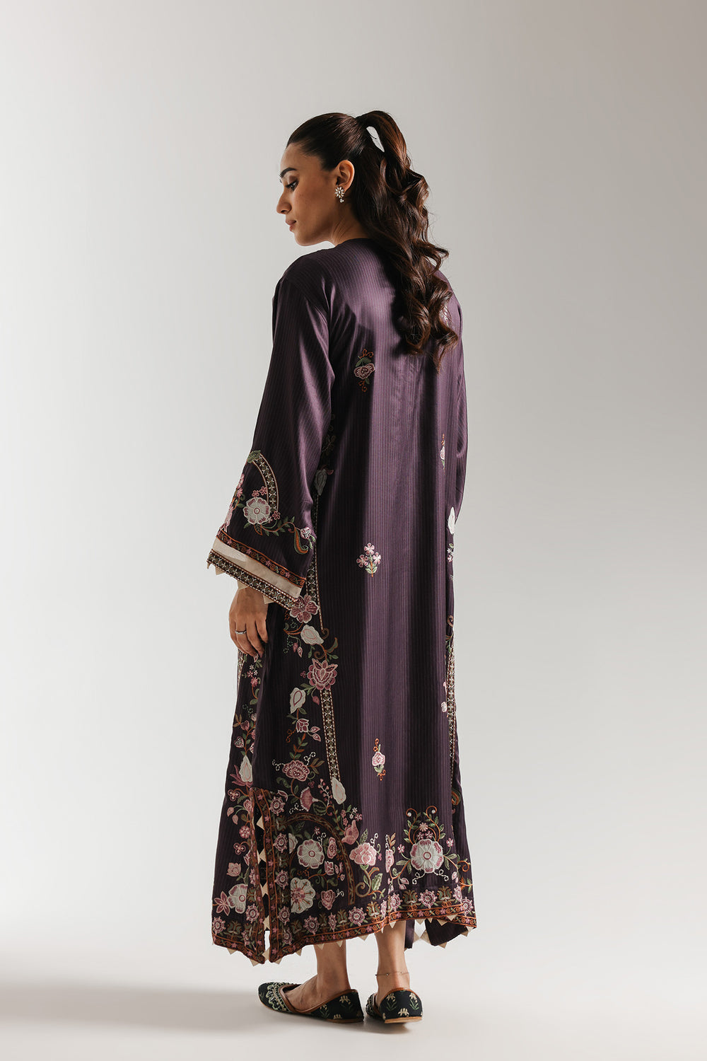 This sophisticated violet kaftan is crafted from a lustrous, subtle-sheen fabric that drapes beautifully in a long-length A-line silhouette. The garment features intricate floral and vase-inspired embroidery in soft pink, ivory, and sage tones, concentrated along the front panel and sleeve borders. Designed with a traditional ban-style neckline adorned with mirror-work detailing and voluminous flared sleeves with striped cuff accents, this piece elegantly combines classic craftsmanship with a modern, airy fit.