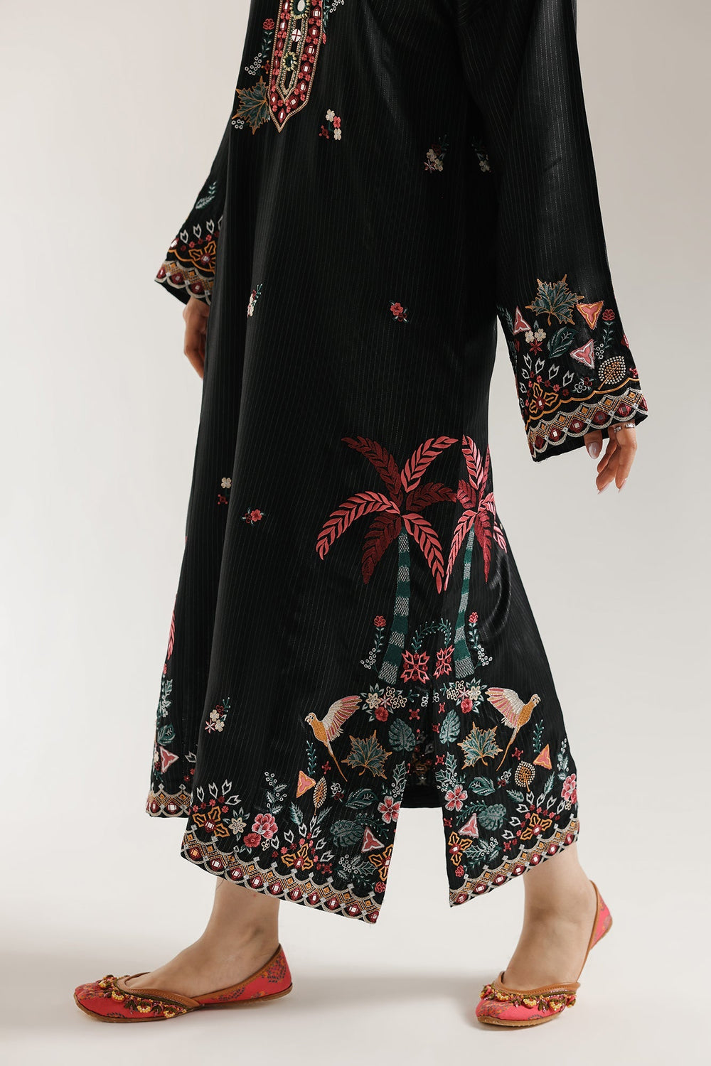 Dive into the deep elegance of this striking black embroidered shirt, a long, A line cut silhouette crafted from a subtly textured black fabric. The piece is brought to life by vibrant, multi-colored floral thread embroidery, with the high neckline serving as a stunning focal point, featuring dense geometric and floral patterns in shades of red, pink, green, and off-white. The hem and wide sleeves are lavishly detailed with wide borders of intricate botanical motifs, including palm trees and sweeping floral vines in rich coral, pink, and green, making this shirt a magnificent statement of traditional artistry and luxurious color.