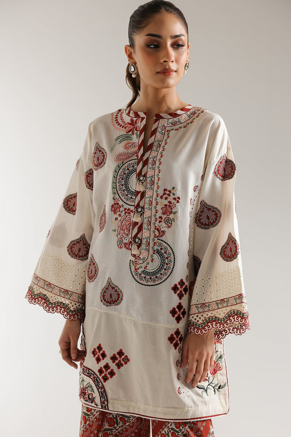 A vibrant expression of traditional artistry for the modern wardrobe. Step into a Canvas of Culture with this striking two-piece ensemble. The off-white shirt is a testament to intricate detailing, featuring a captivating tapestry of embroidered motifs in rich reds, blacks, and subtle gold accents. The patterns flow across the fabric, drawing the eye to the detailed neckline and the delicate cutwork on the sleeves. Paired with beautifully printed trousers that echo the shirt's color palette and design elements, this outfit offers a bold yet sophisticated statement. Embrace a look that celebrates heritage with contemporary flair, perfect for making a stylish impact at cultural events or festive gatherings.