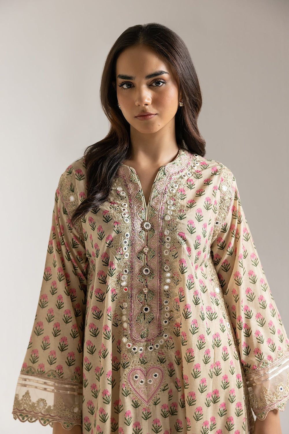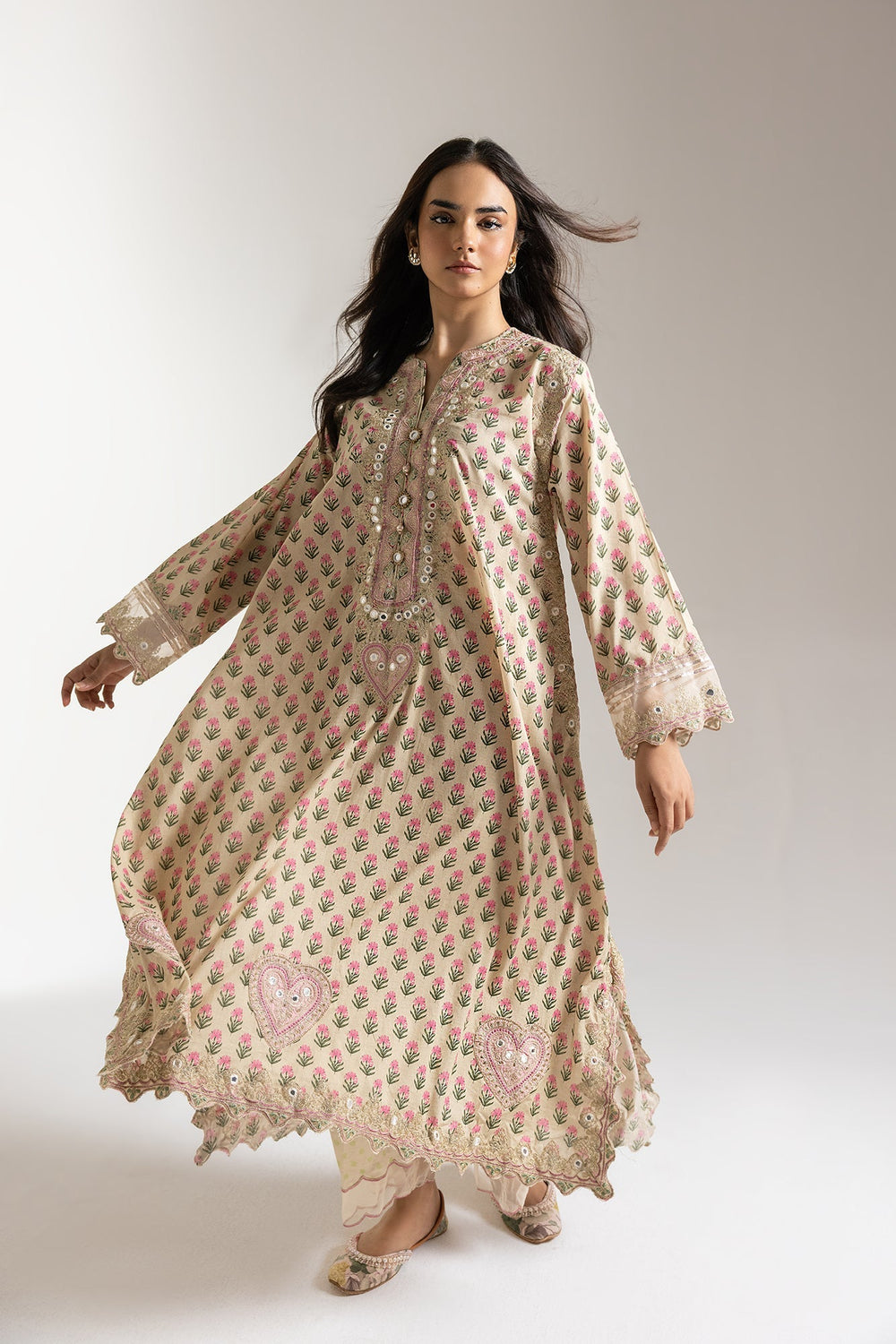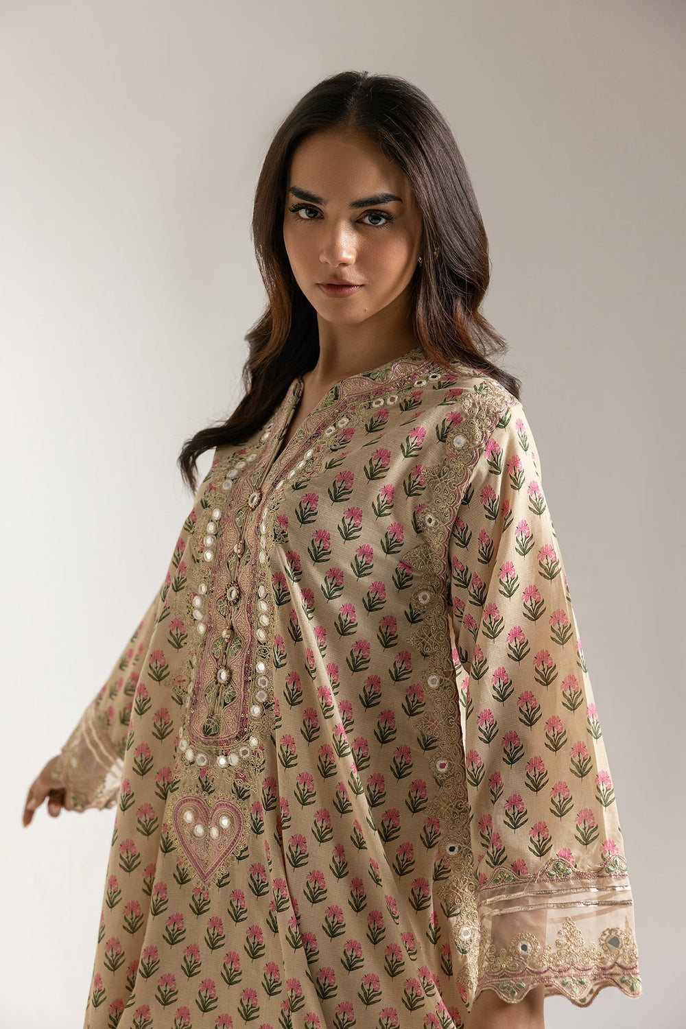 Step into graceful elegance with this enchanting embroidered beige ensemble. The flowing, A-line tunic boasts a soft beige base adorned with a captivating all-over print of tiny blush pink floral motifs. Its design is beautifully enhanced by intricate white and pink embroidery, which exquisitely frames the neckline and descends down the front panel, enriched with shimmering mirror work details. The wide, flared sleeves are finished with elegant embroidered borders, adding to its allure. Completing this ethereal look are matching straight trousers featuring subtle polka dot patterns and coordinating borders. This outfit is a perfect choice for sophisticated daytime events, festive celebrations, or any occasion where you desire to exude understated luxury and traditional beauty.
