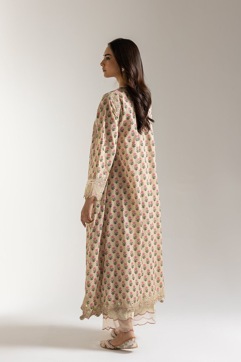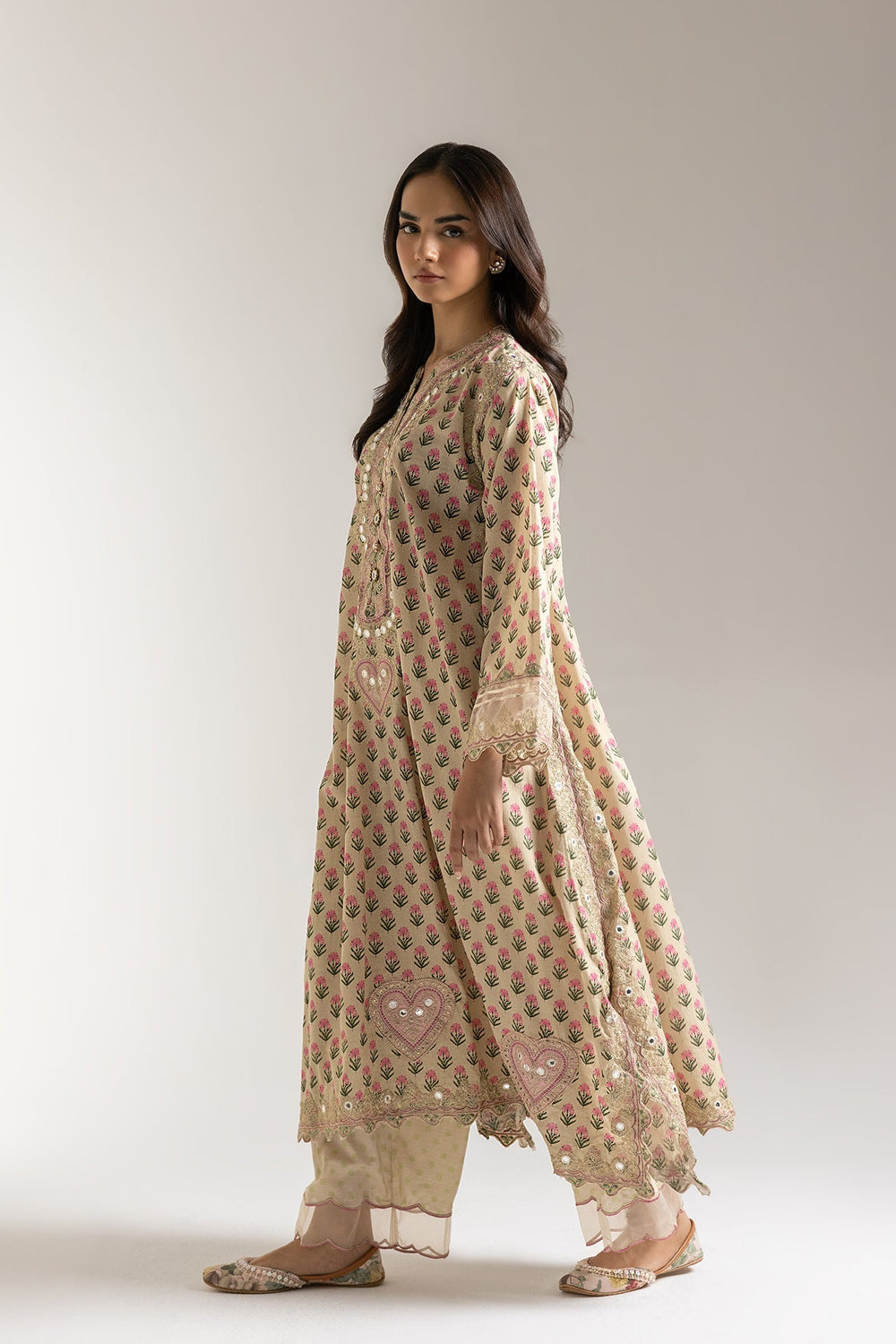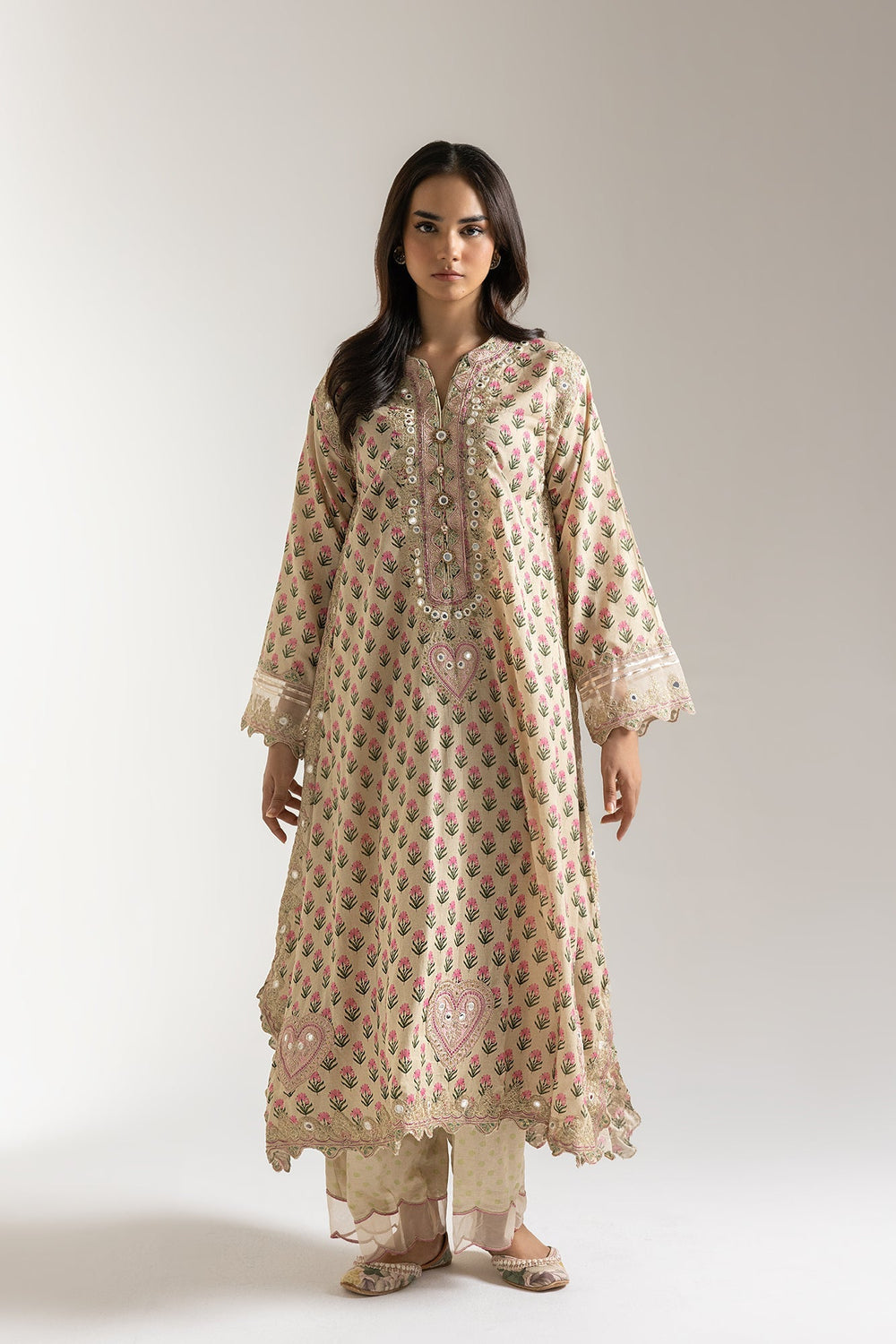 Step into graceful elegance with this enchanting embroidered beige ensemble. The flowing, A-line tunic boasts a soft beige base adorned with a captivating all-over print of tiny blush pink floral motifs. Its design is beautifully enhanced by intricate white and pink embroidery, which exquisitely frames the neckline and descends down the front panel, enriched with shimmering mirror work details. The wide, flared sleeves are finished with elegant embroidered borders, adding to its allure. Completing this ethereal look are matching straight trousers featuring subtle polka dot patterns and coordinating borders. This outfit is a perfect choice for sophisticated daytime events, festive celebrations, or any occasion where you desire to exude understated luxury and traditional beauty.