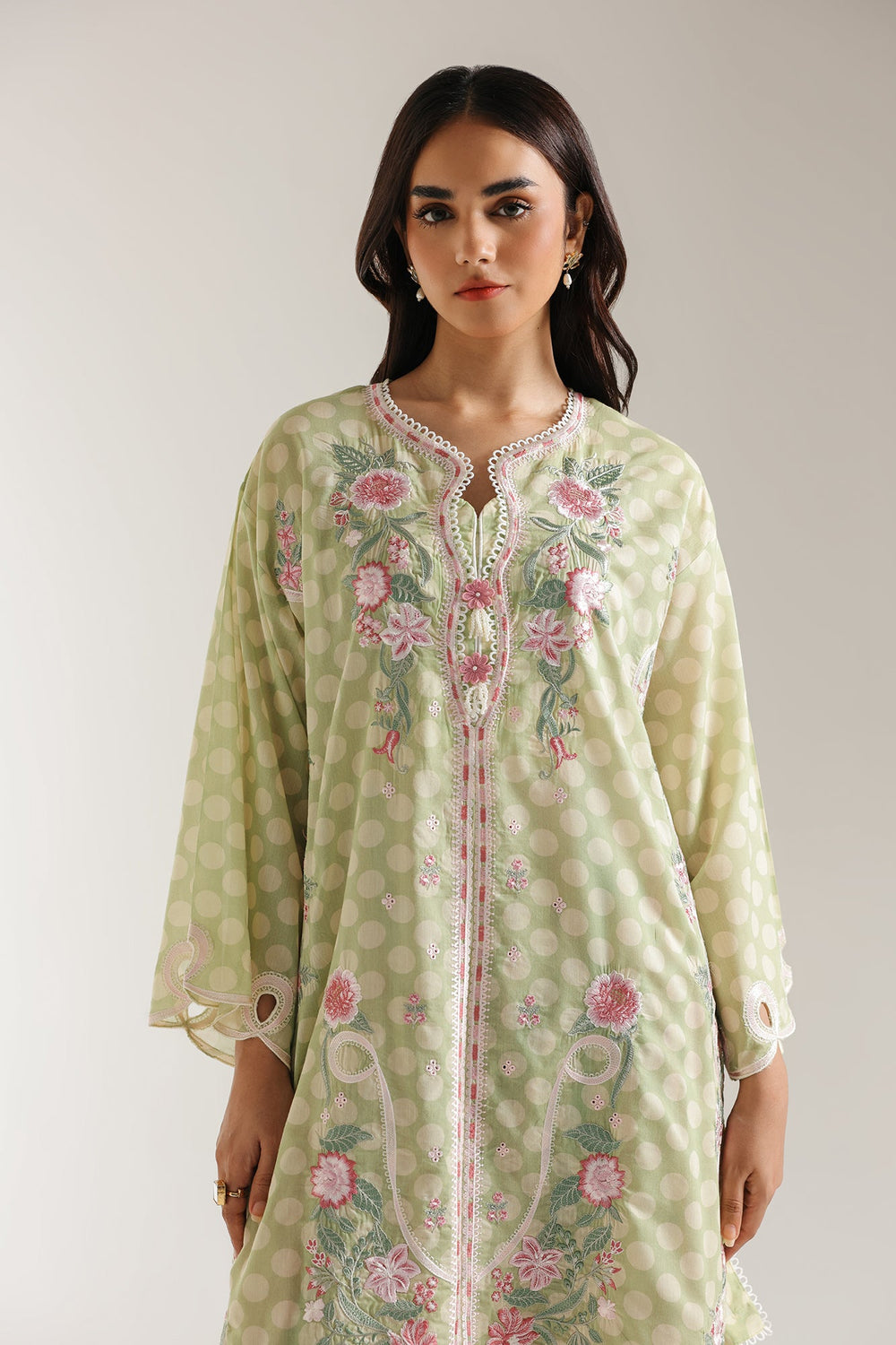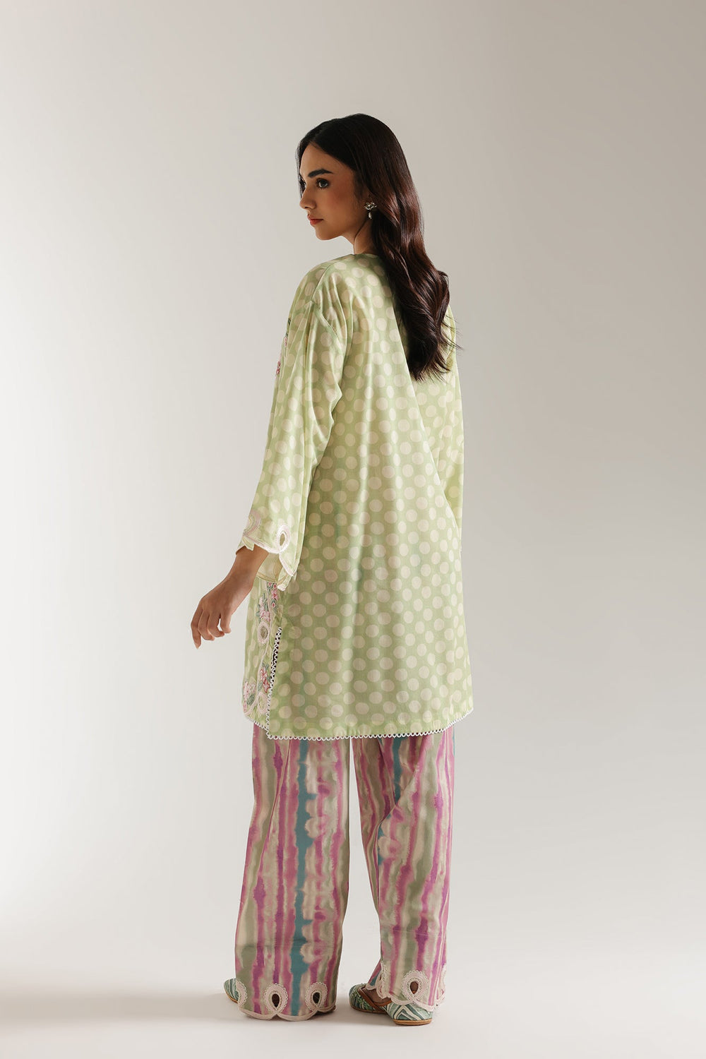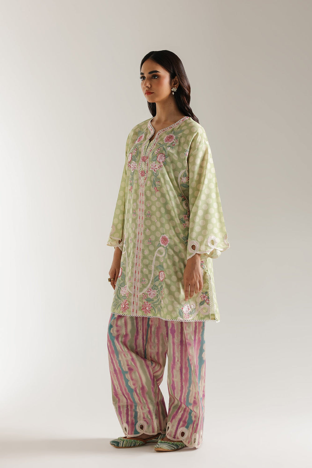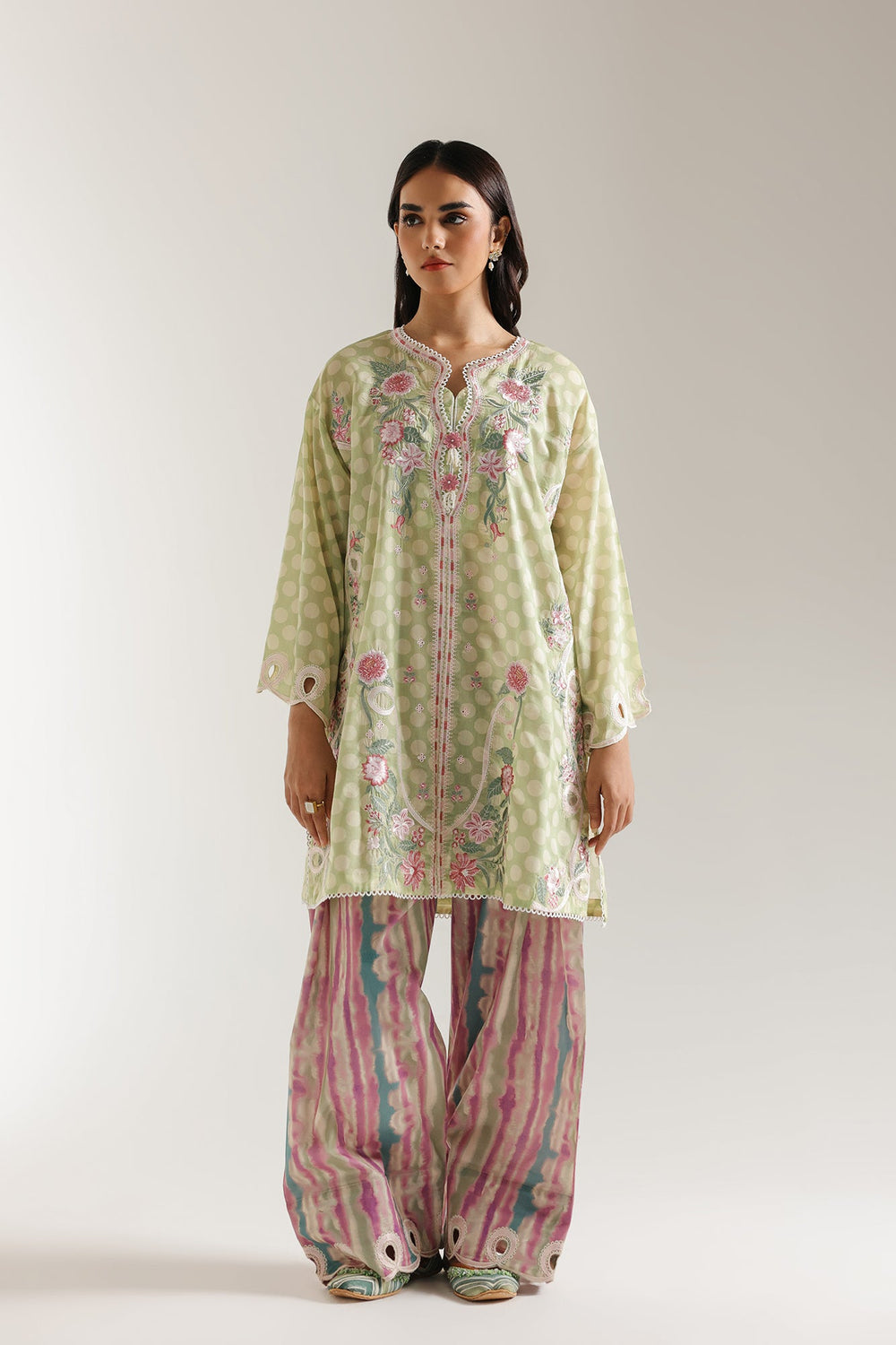 Step into a world of whimsical charm with this delightful light green embroidered set. A soft, airy fabric, subtly textured with a print, is beautifully enhanced by vibrant floral embroidery that graces the neckline and perhaps the sleeves and hem. The relaxed fit of the sleeves ensures effortless movement. Completing the look, the patterned shalwar present a vibrant swirl of pink, green, and white, adding a distinctive flair. More than just an outfit, it's a breath of fresh air, ideal for bringing playful elegance and individual style to daytime events.