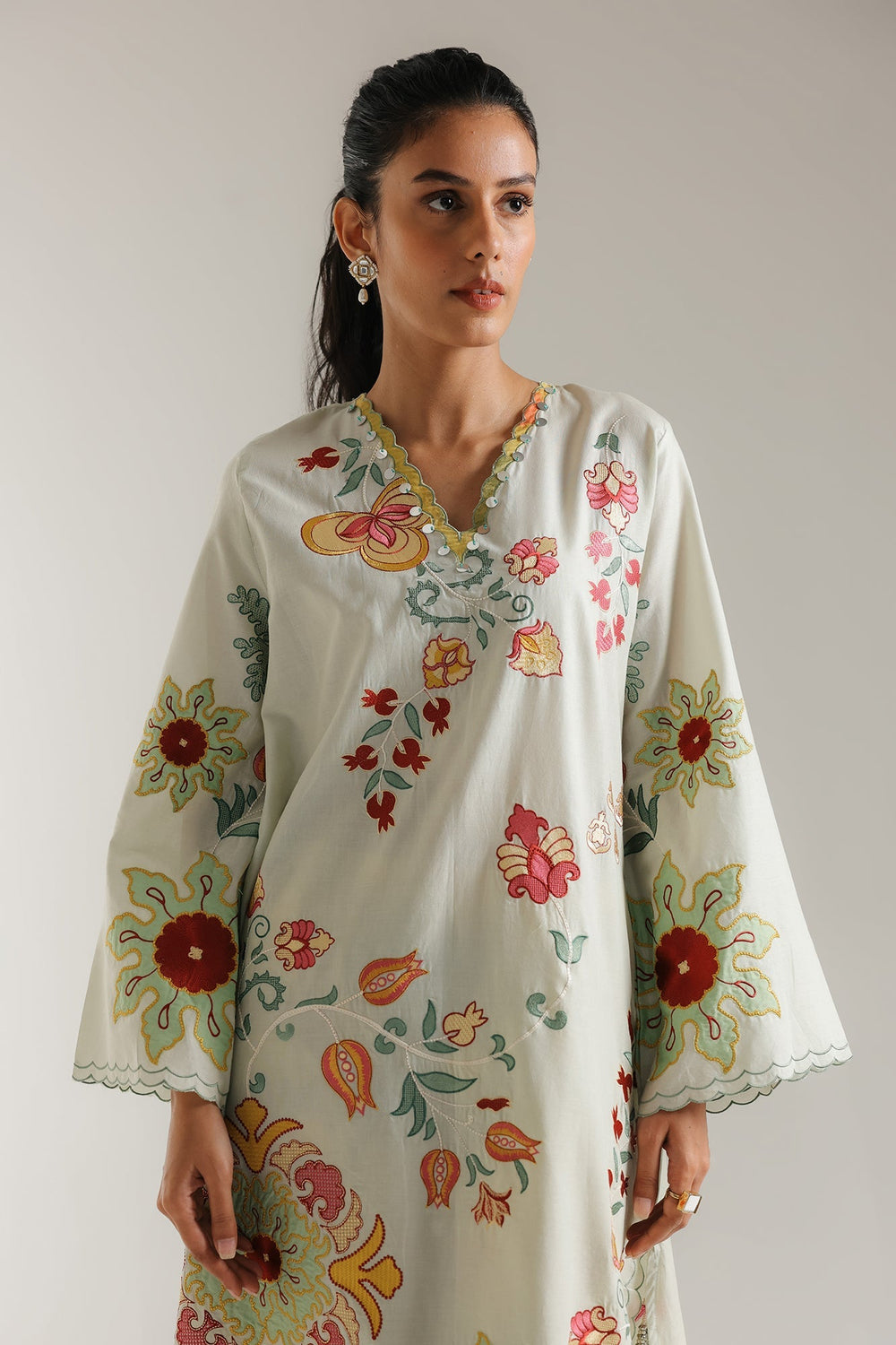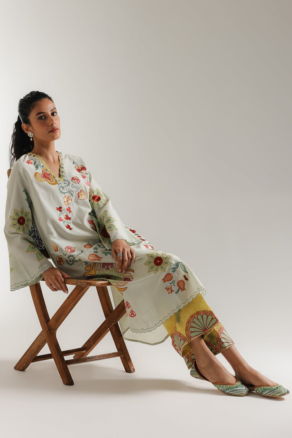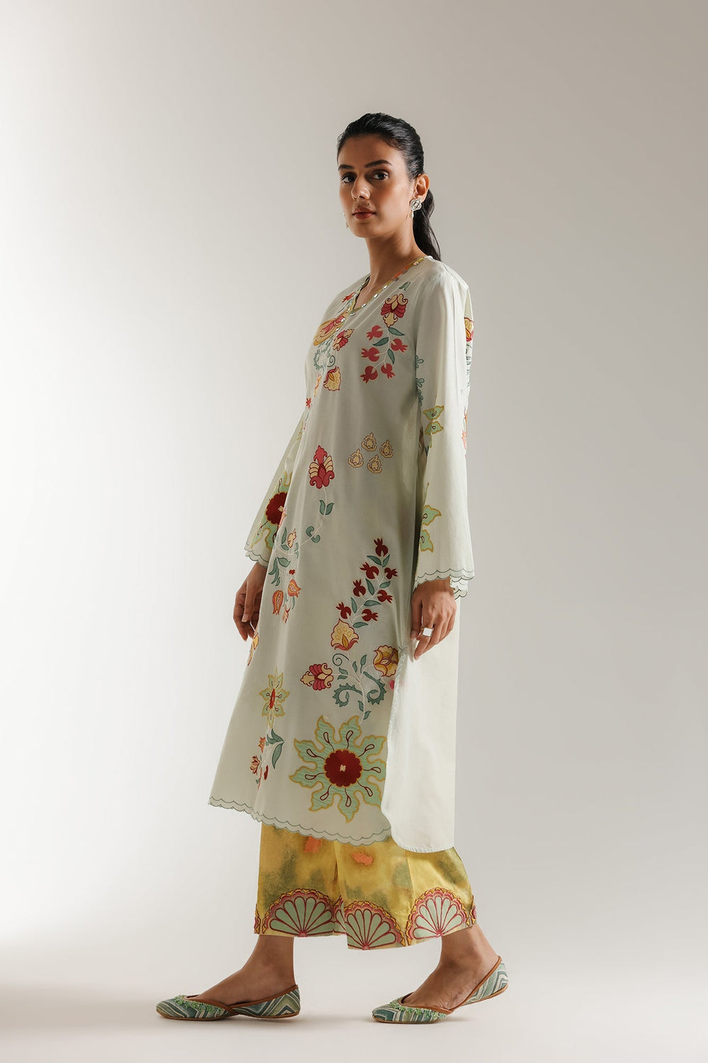 Step into a whimsical garden with this enchanting green ensemble, a vibrant celebration of nature's beauty and traditional artistry. The long-line kurta features a striking display of large, colorful floral and botanical prints in shades of red, yellow, and green, creating a rich tapestry of blooms. A delicate scalloped border in a coordinating hue graces the V-neckline, adding a refined touch. Paired with eye-catching yellow trouser that boast a bold, complementary embroidery at the hem, featuring stylized geometric patterns in red and green. This outfit is a harmonious blend of comfort and captivating design. Perfect for daytime festivities, cultural events, or simply to add a burst of joyful elegance to your wardrobe.