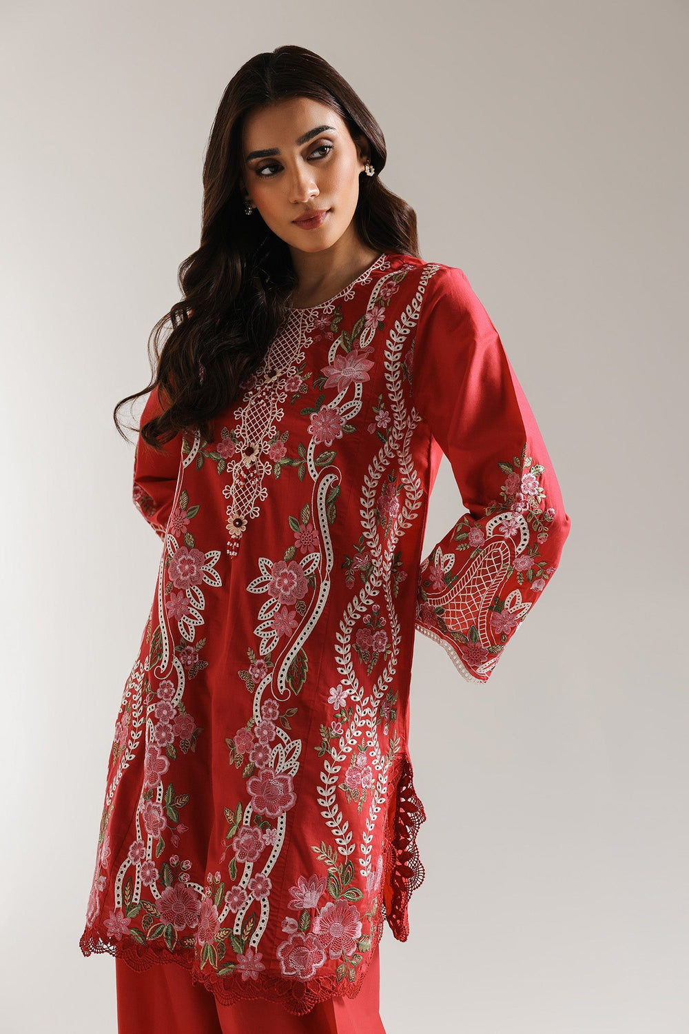Make a vibrant statement in this striking hot pink ensemble, perfect for adding a touch of traditional elegance to your wardrobe. The short-length kurta is exquisitely adorned with intricate floral embroidery in shades of pink, green, and white, creating a captivating contrast against the rich hot pink fabric. Delicate bead embellishments further enhance the design along the neckline. The outfit is completed with matching shalwar, featuring a similarly embroidered border at the hem, tying the look together with sophisticated flair. This eye-catching outfit is ideal for festive occasions, semi-formal gatherings, or any event where you wish to stand out.