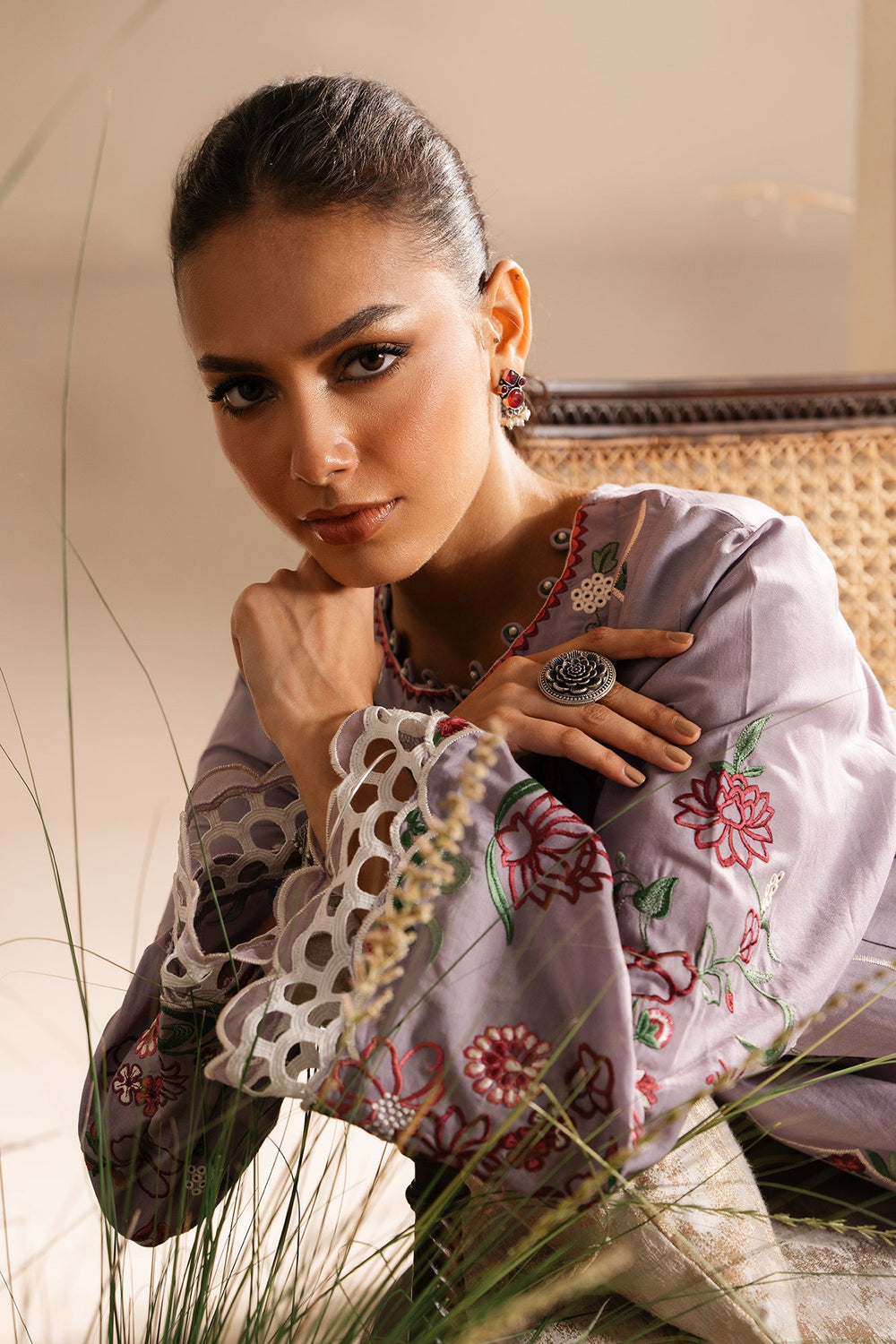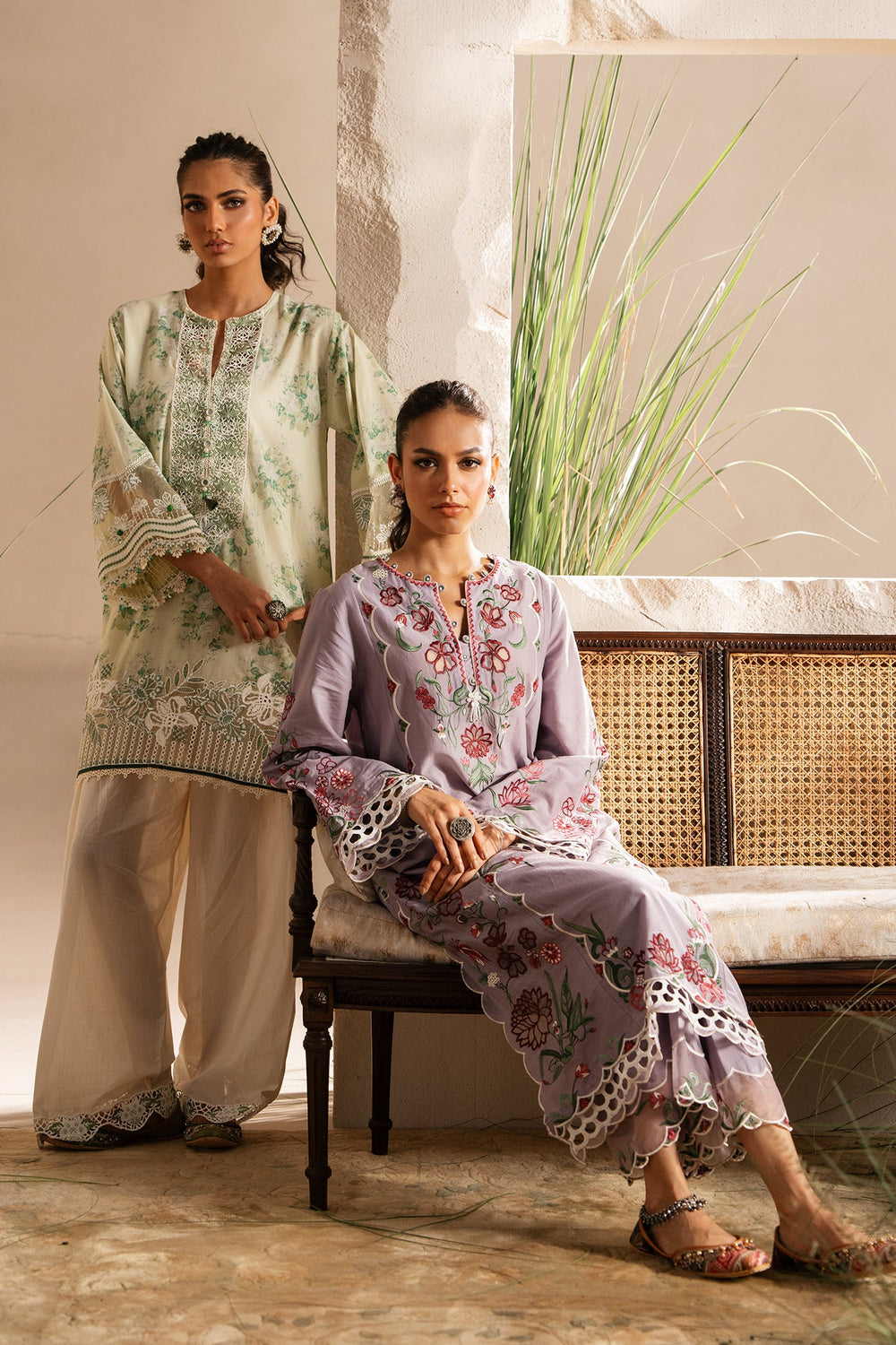 Float into a realm of serene sophistication with this stunning embroidered suit. The beautiful, muted lavender fabric is a delicate canvas for intricate floral and vine embroidery in shades of pink, white, and green that gracefully adorn the front, sleeves, and hem. The delicate scalloped edges on the hem and sleeves add a touch of refined elegance, while the coordinating trousers with matching embroidered accents complete this beautiful and ethereal ensemble.