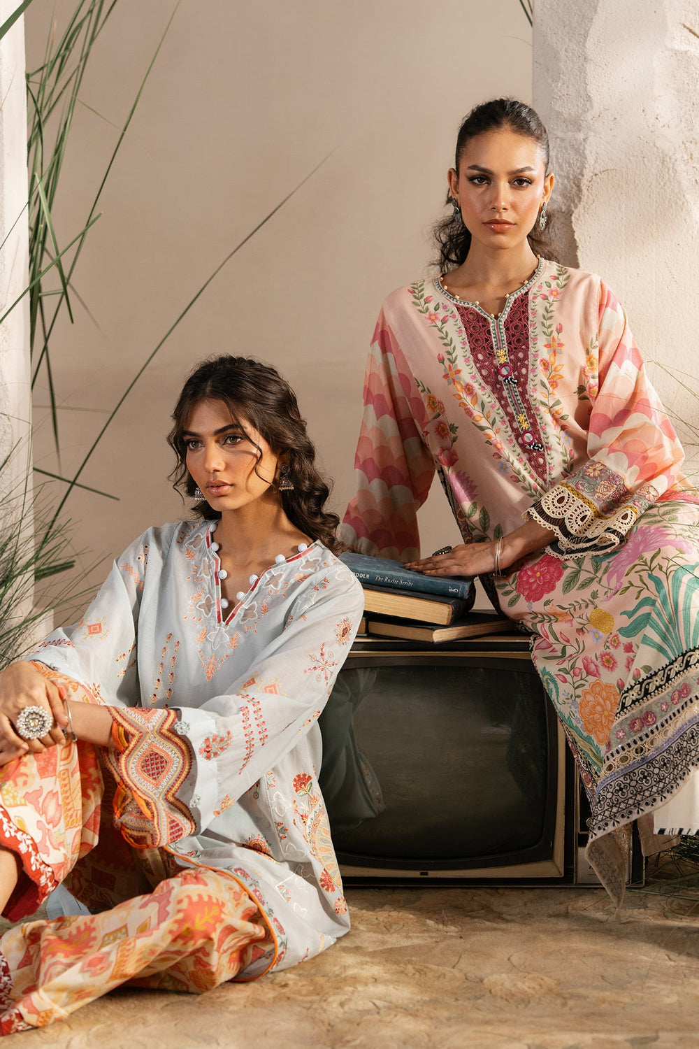 Elevate your everyday style with this beautifully embroidered suit, a vision of bohemian elegance. The light blue fabric is a delicate canvas for intricate floral and vine embroidery in shades of rust and orange, creating a look that is both earthy and ethereal. The contrasting printed trousers feature a bold, intricate geometric pattern in a matching color palette, making this ensemble a celebration of artistic flair and comfortable style.