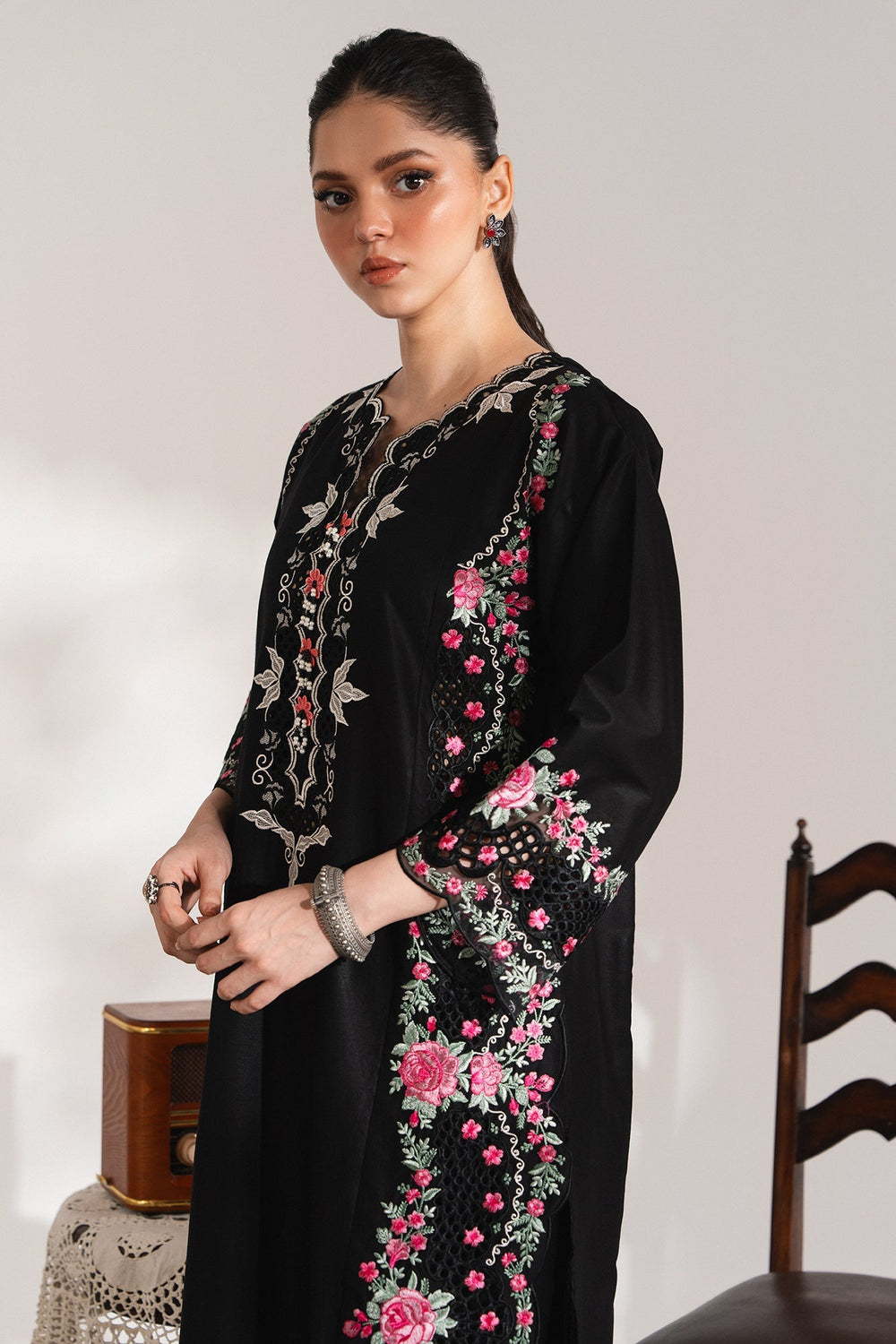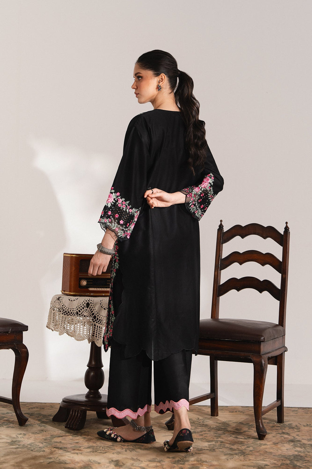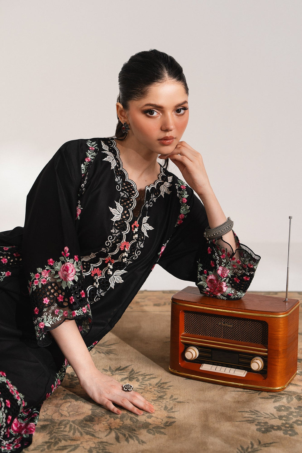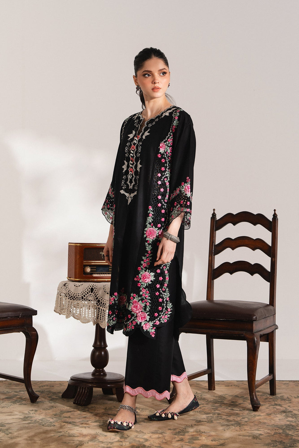 Unfold an enchanting narrative with our midnight garden suit, a stunning ensemble that marries classic black with vibrant floral artistry. This exquisite three-piece set features a sophisticated black tunic, lavishly adorned with intricate embroidery in beautiful shades of pink and green, creating a captivating floral cascade along the neckline, sleeves, and hem. It comes complete with a perfectly matching slip for added comfort and coverage, and coordinating solid black trousers, forming a harmonious and distinctly elegant look. Ideal for making a refined statement at festive gatherings, formal evenings, or simply adding a touch of luxurious charm to your presence.