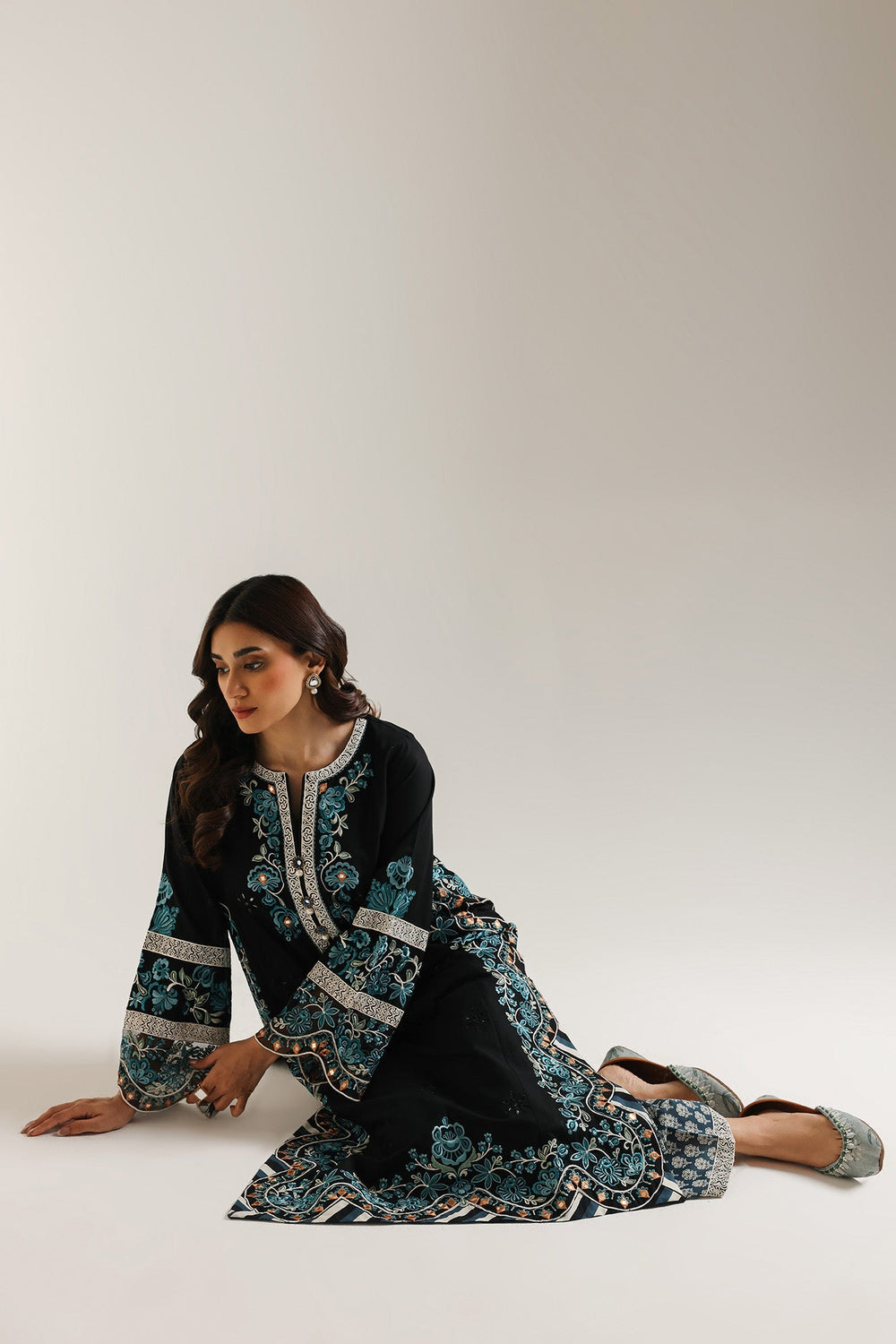 Step into an aura of refined allure with this captivating two-piece ensemble, a perfect fusion of classic black and intricate teal artistry. The sophisticated black kurta is exquisitely adorned with intricate floral and abstract embroidery in serene shades of teal and light blue, gracefully detailing the neckline, bodice, and long, flared sleeves. Delicate accents woven into the design add a subtle shimmer. It is perfectly complemented by coordinating trousers featuring a subtle complementary print in blue and white, creating a cohesive and polished silhouette. This outfit is ideal for smart casual events, evening gatherings, or making a distinguished and graceful statement.
